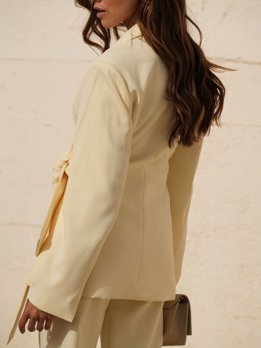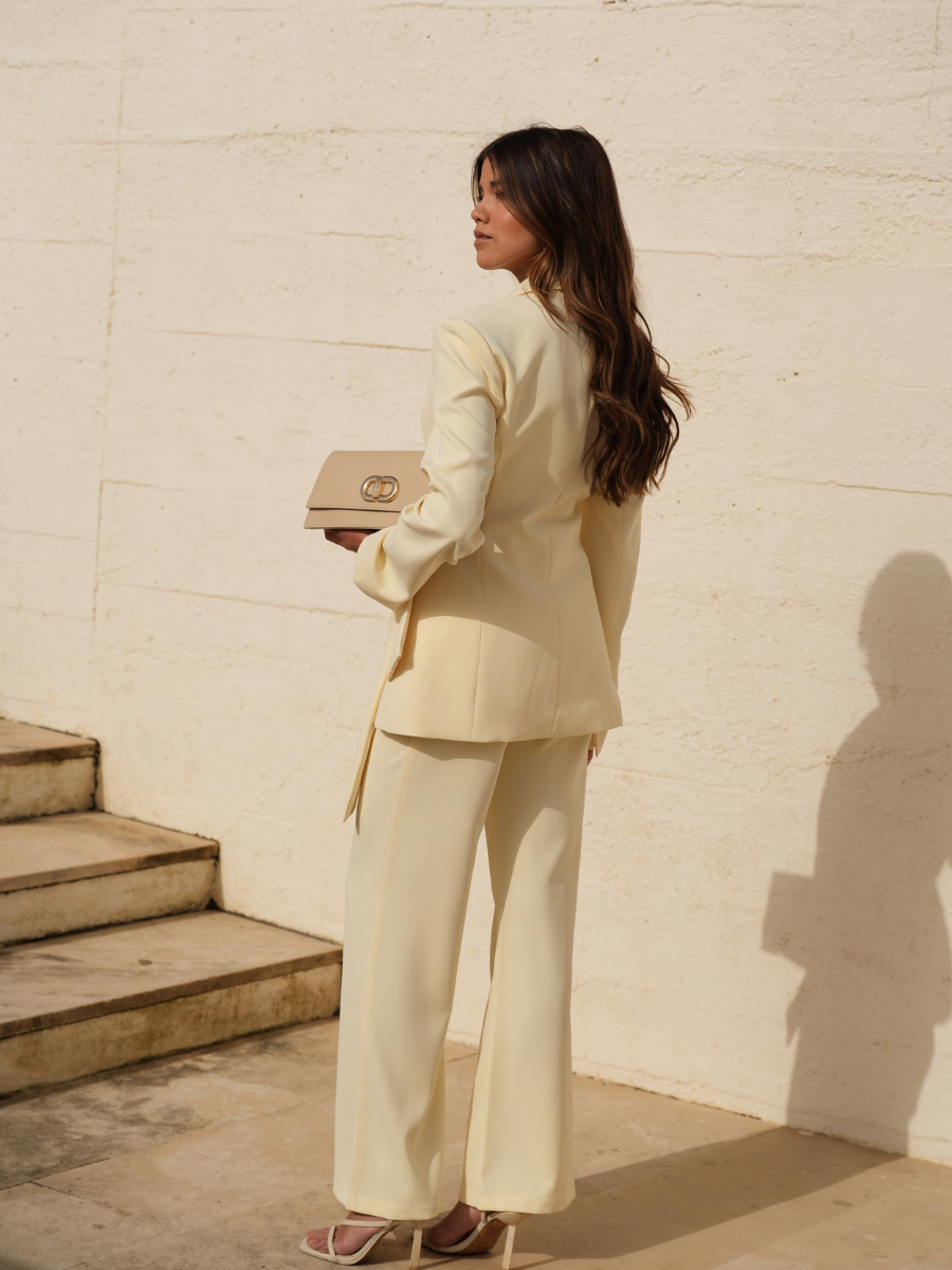 Colete elegante em tom marfim, com design minimalista na frente e detalhe surpreendente nas costas em renda trabalhada. A combinação entre a estrutura clean e a transparência delicada cria um equilíbrio perfeito entre sofisticação e feminilidade.