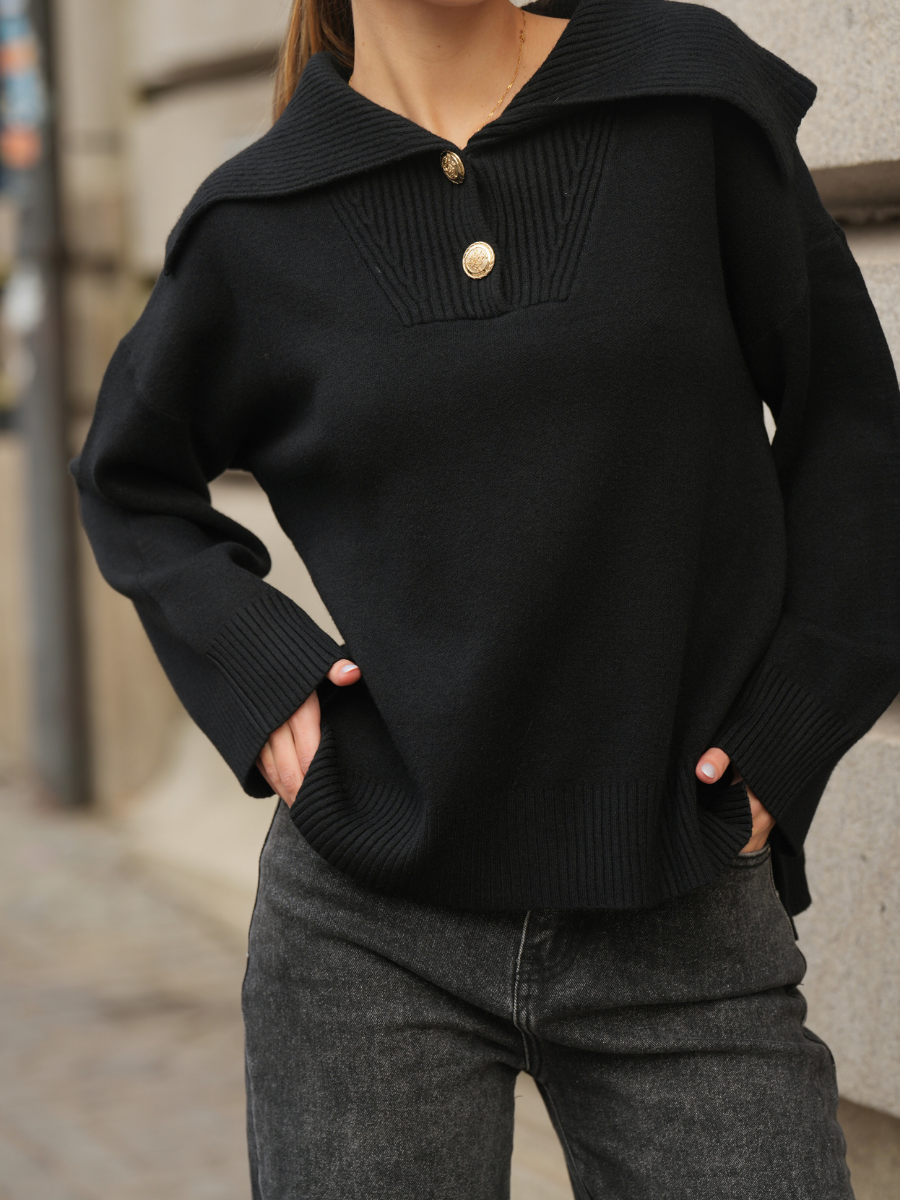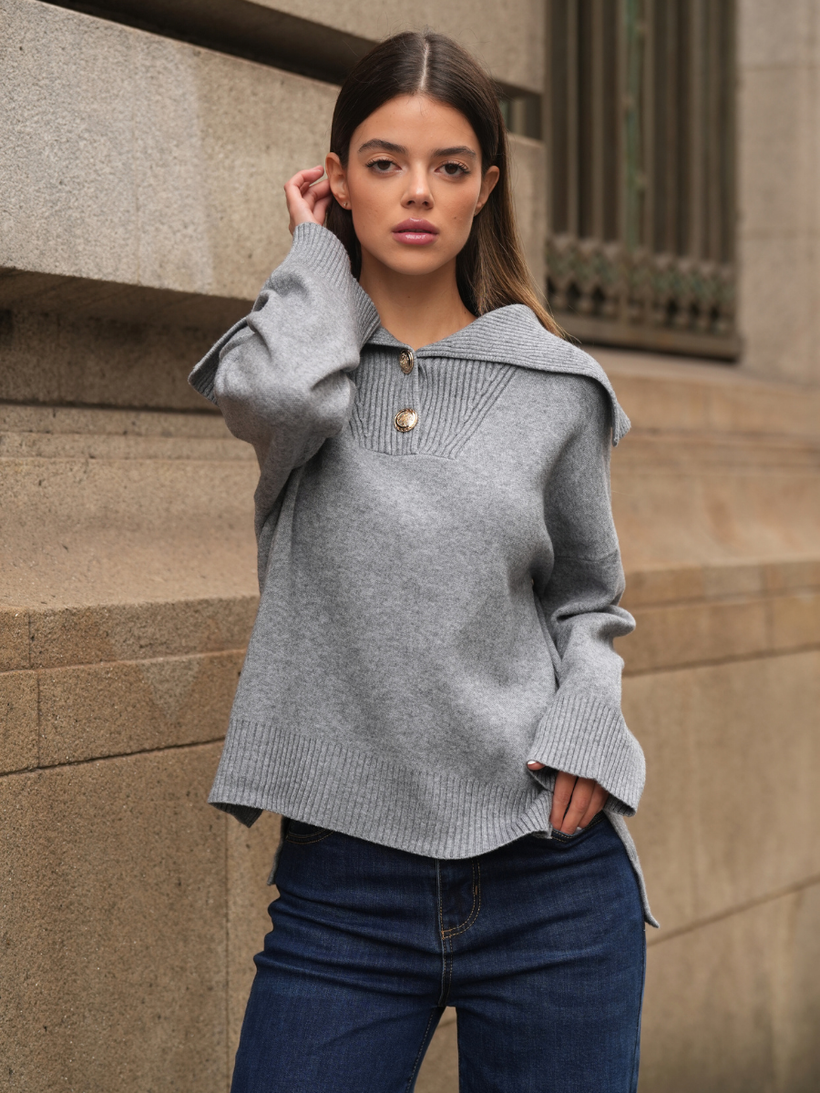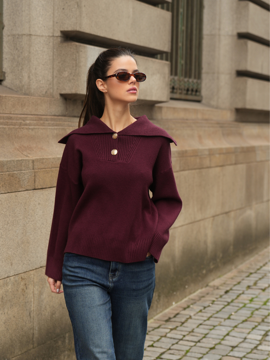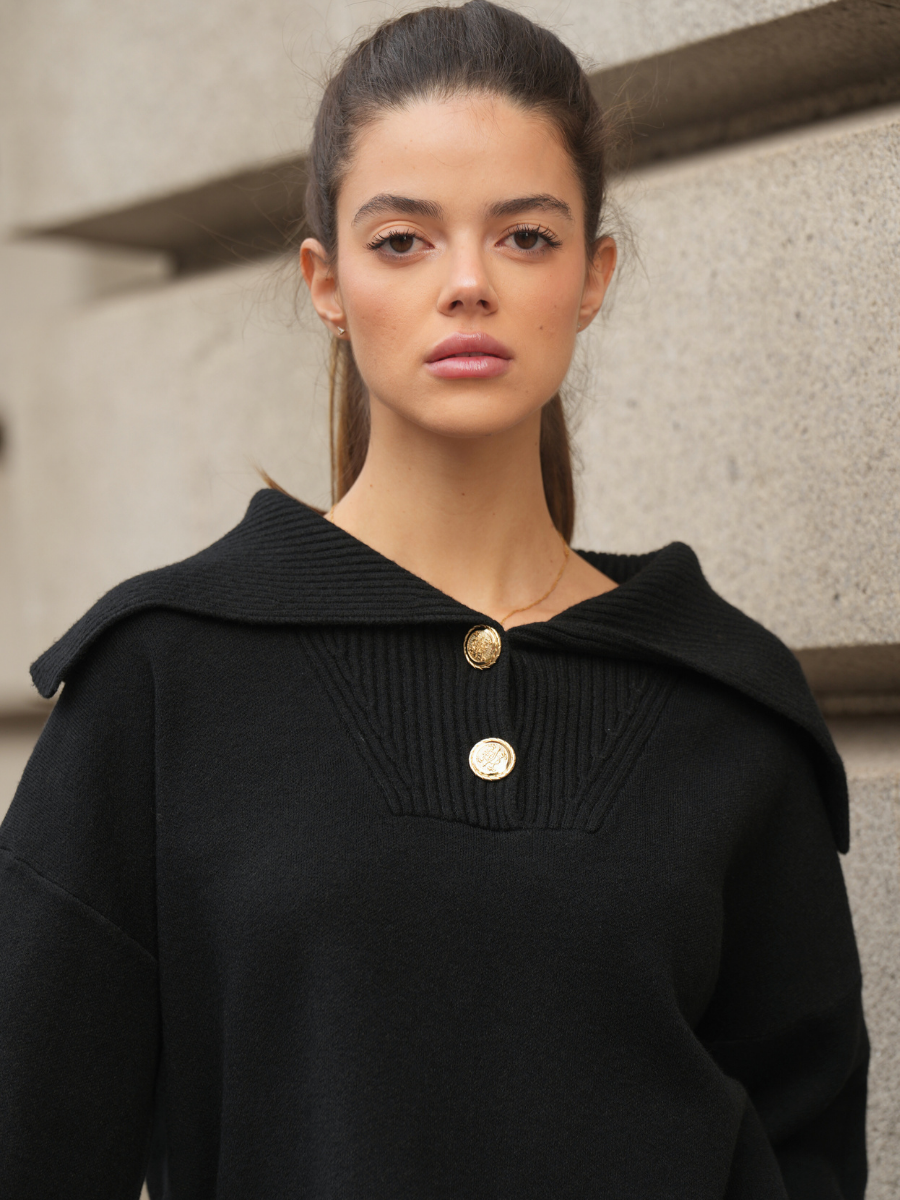 Camisola em malha macia com gola larga tipo polo. Detalhe de botões dourados na frente, punhos e bainha em acabamento canelado. Corte solto e confortável, ideal para looks urbanos e descontraídos.