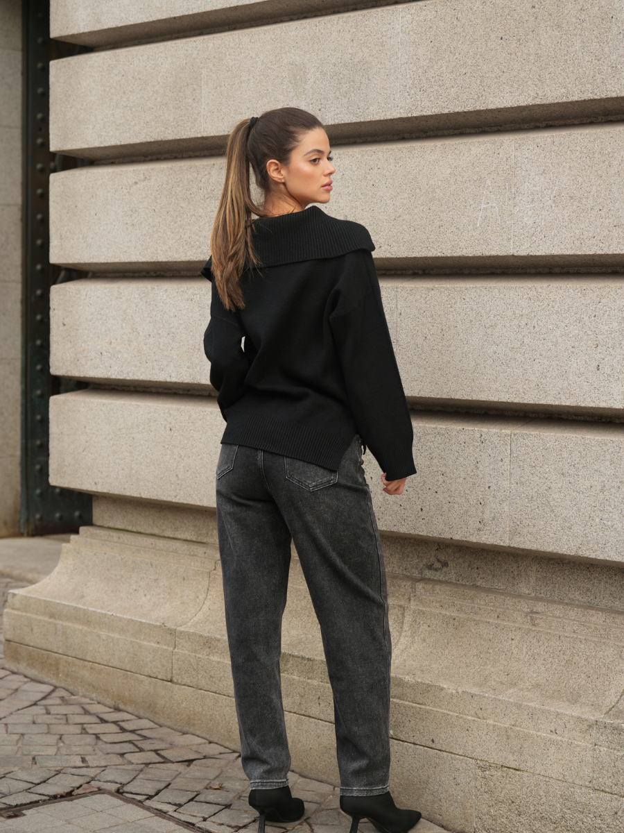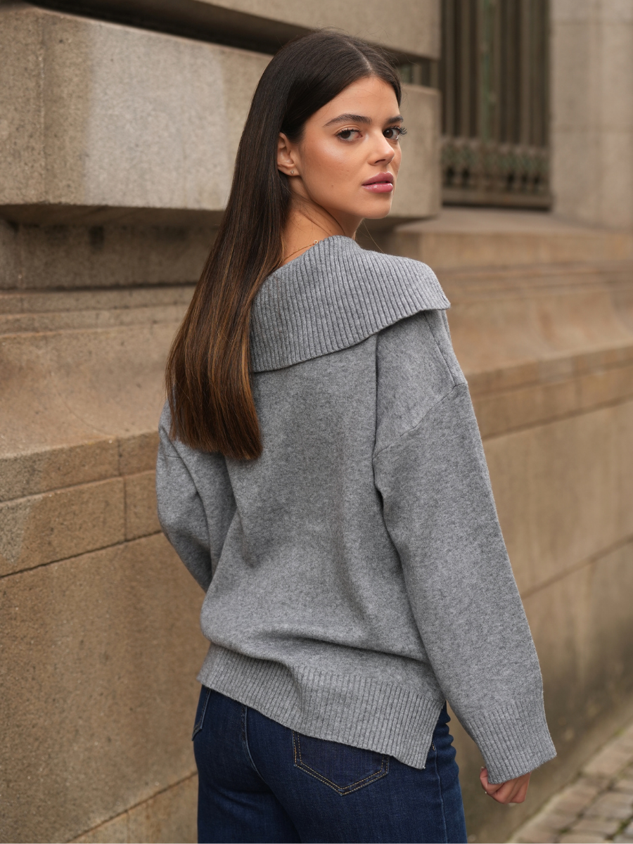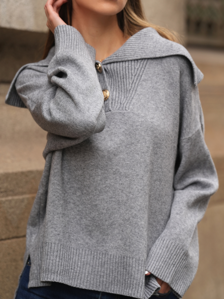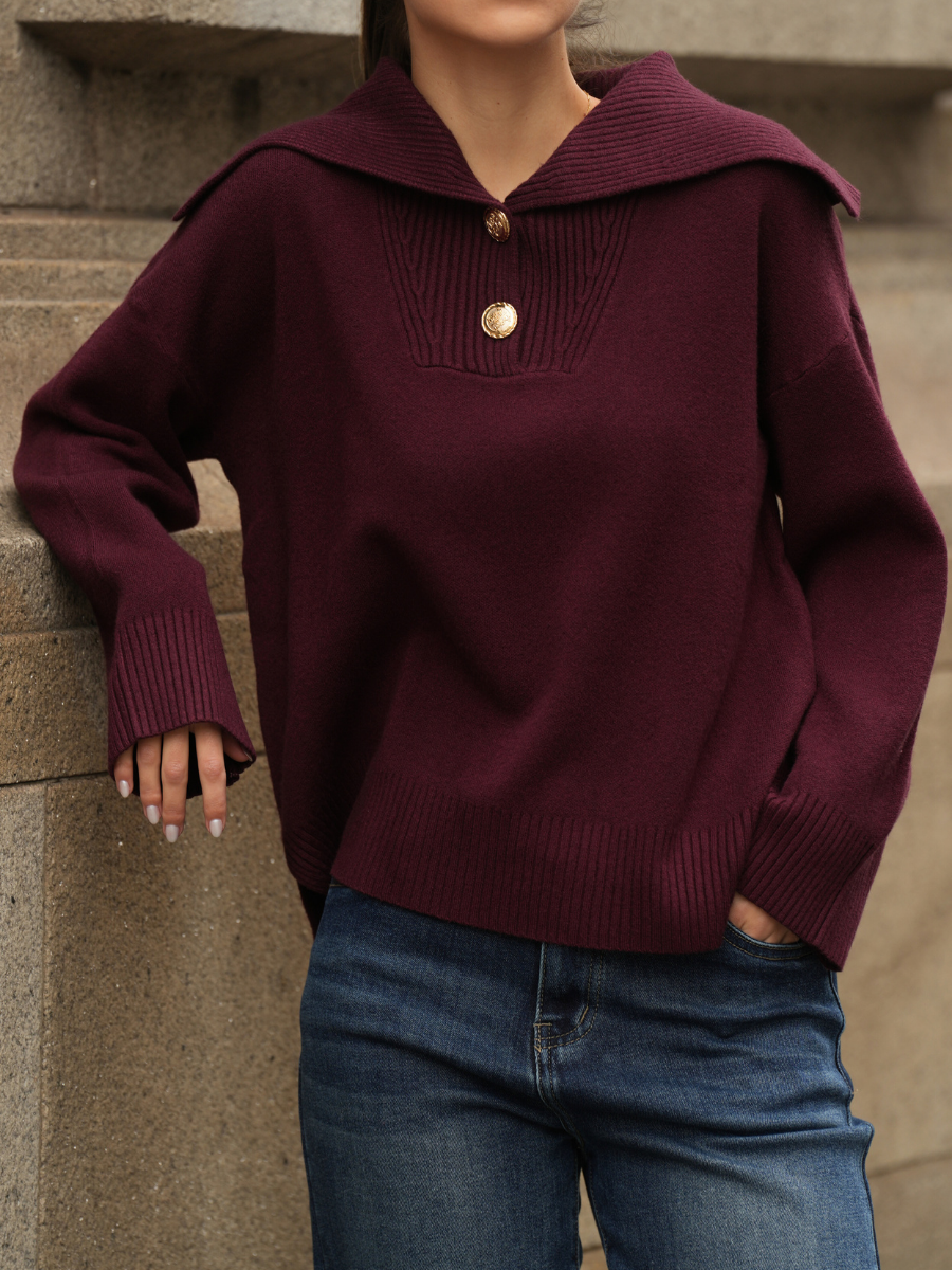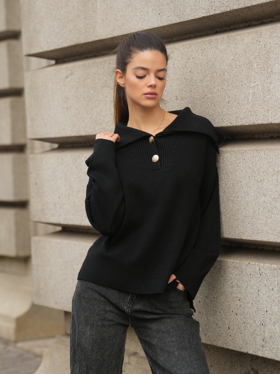 Camisola em malha macia com gola larga tipo polo. Detalhe de botões dourados na frente, punhos e bainha em acabamento canelado. Corte solto e confortável, ideal para looks urbanos e descontraídos.