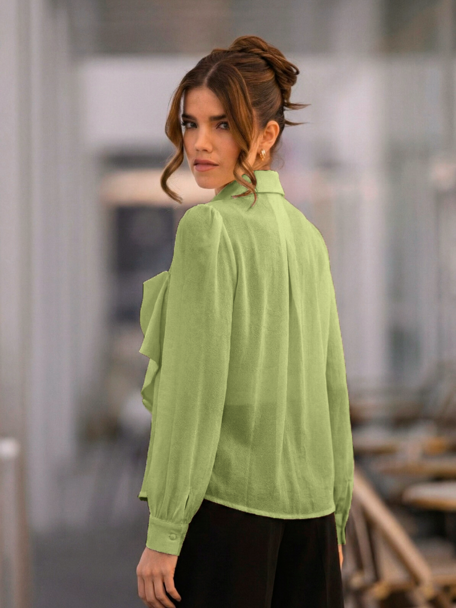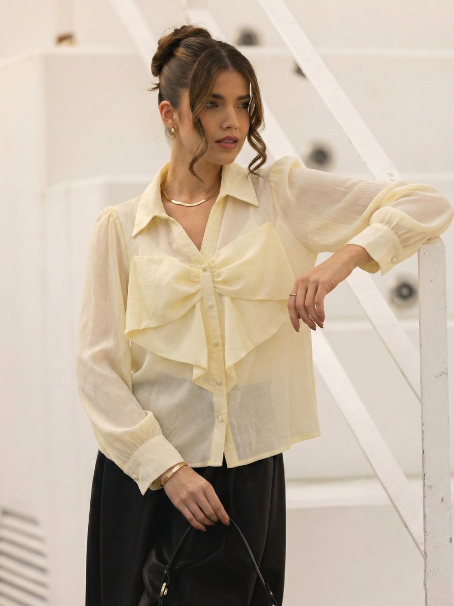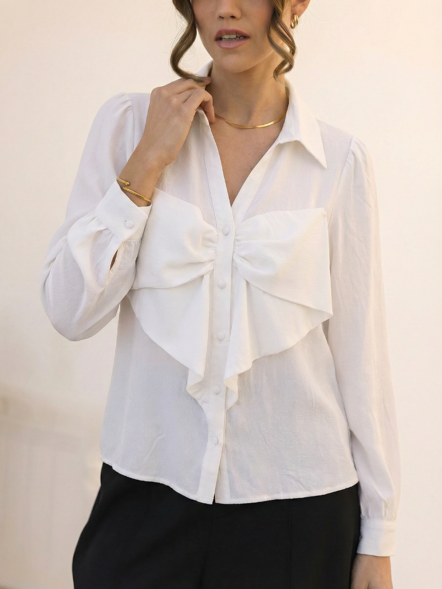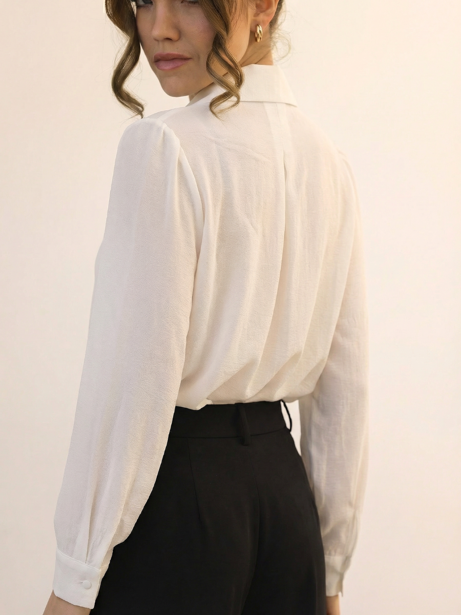 Blusa elegante com design 2 em 1, criando um efeito de sobreposição sofisticado. A camada exterior fluida confere movimento, enquanto o top interior com botões garante estrutura ao look.