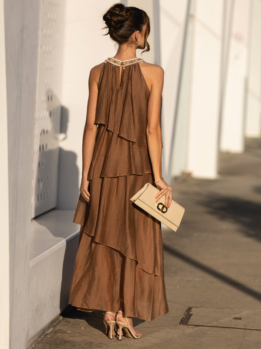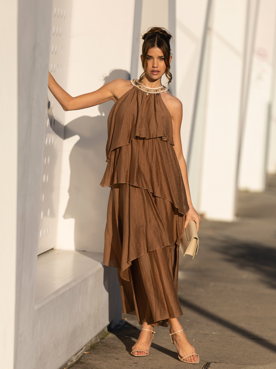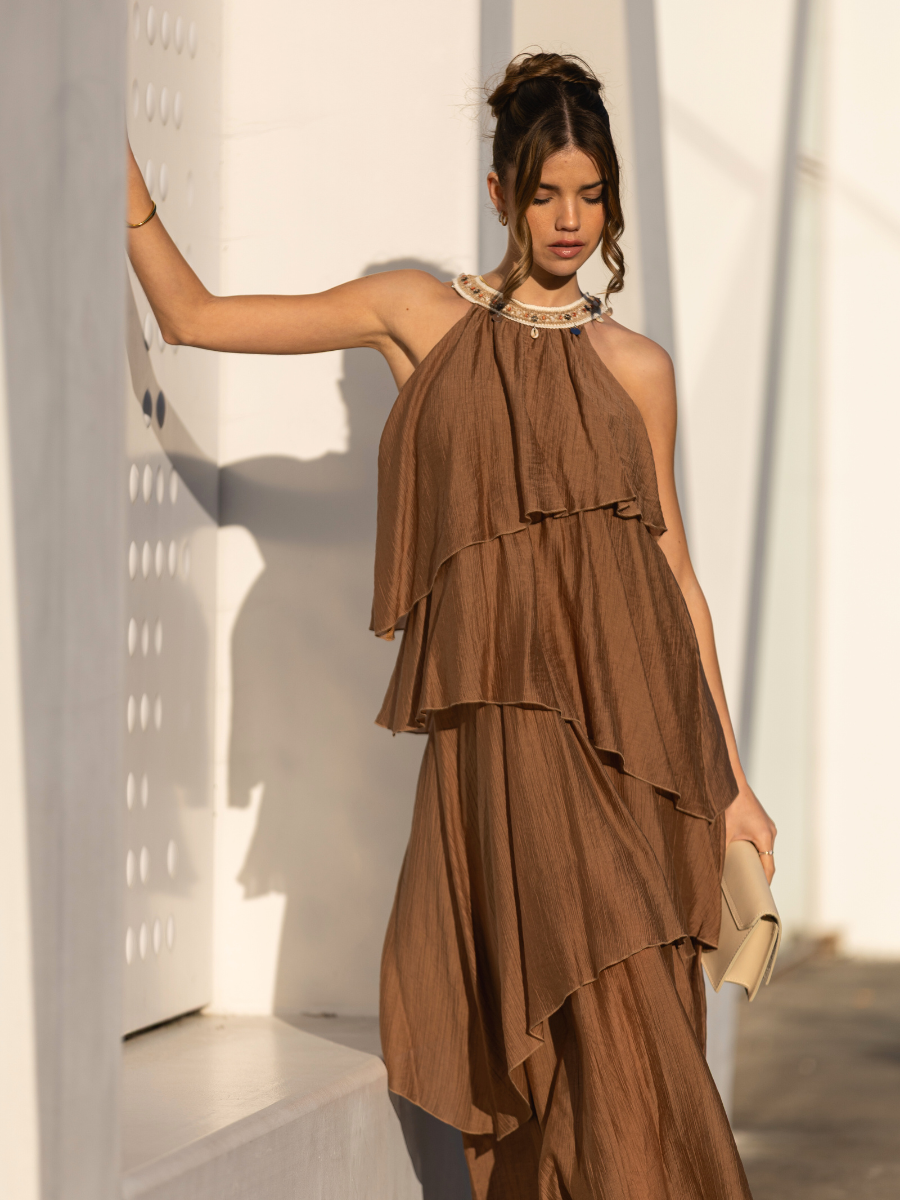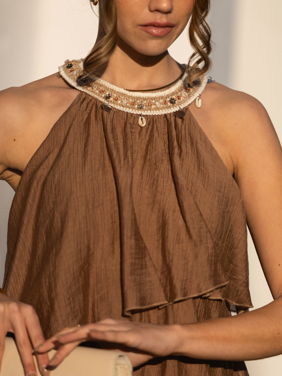 Vestido midi fluido confeccionado em tecido leve com textura suave. Apresenta gola halter com detalhe bordado e aplicações decorativas que conferem um toque artesanal e sofisticado. Silhueta solta com camadas assimétricas que criam movimento e elegância. Sem mangas e com fecho discreto na parte posterior da gola.