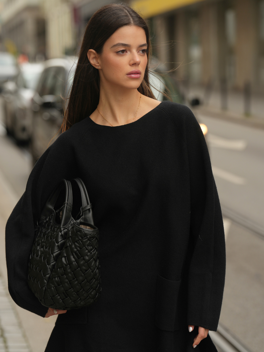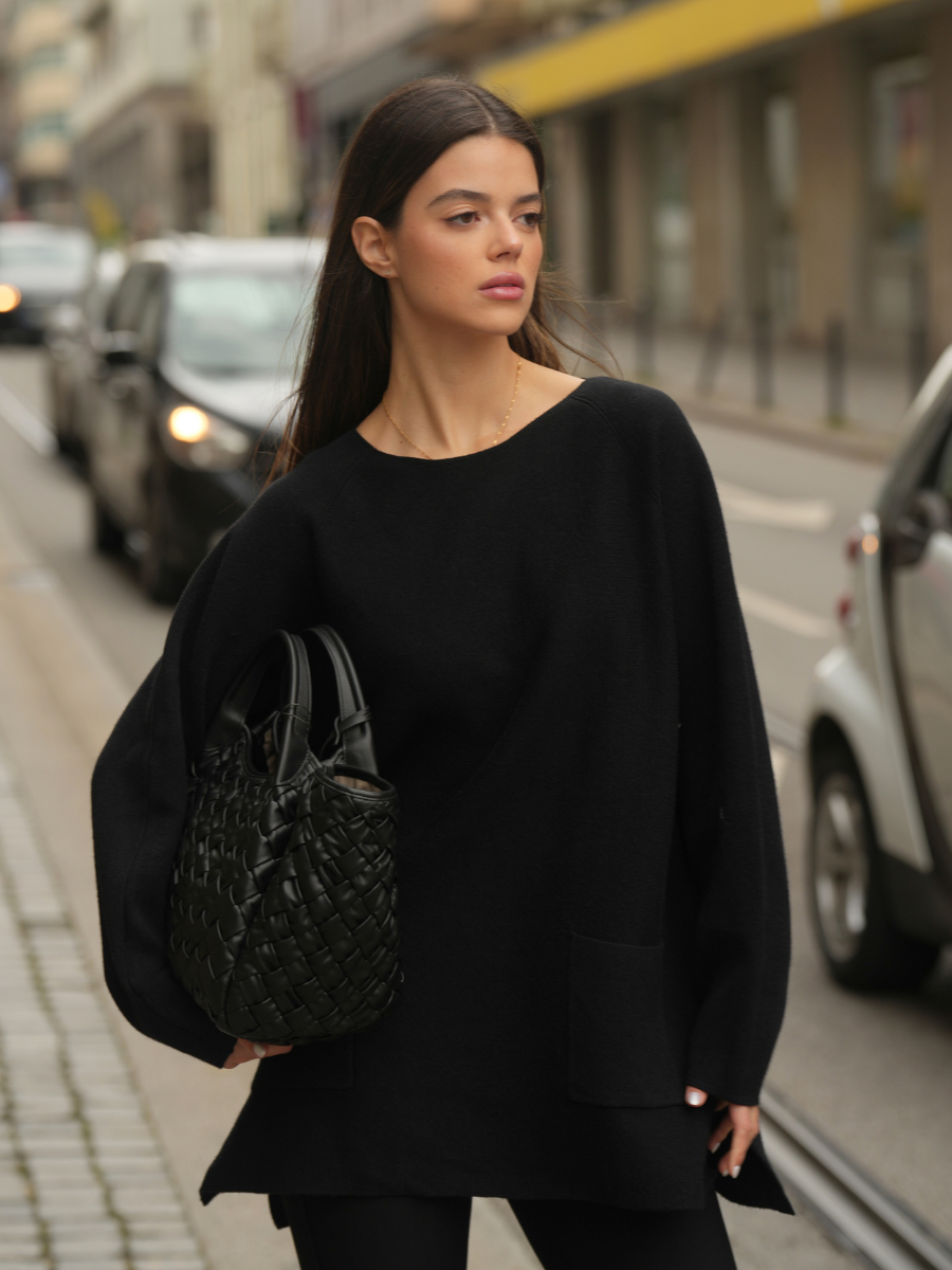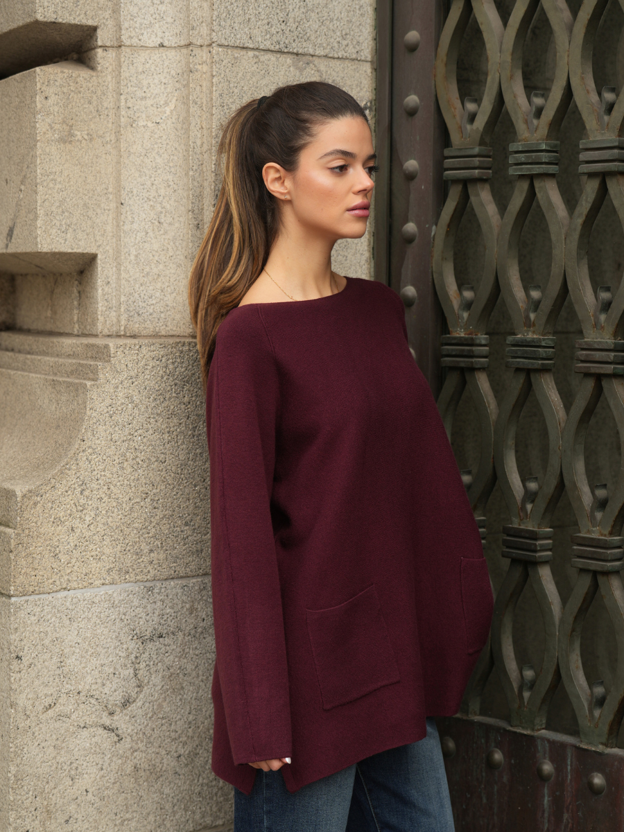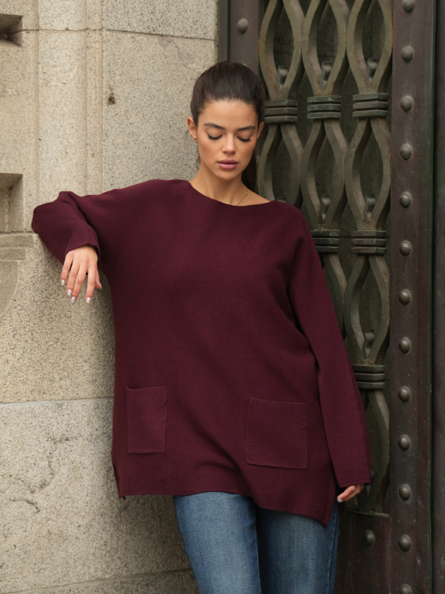 Um essencial com um toque moderno. Esta camisola oversized em malha suave destaca-se pelos bolsos frontais e pelo corte fluido, perfeito para looks confortáveis e sofisticados.