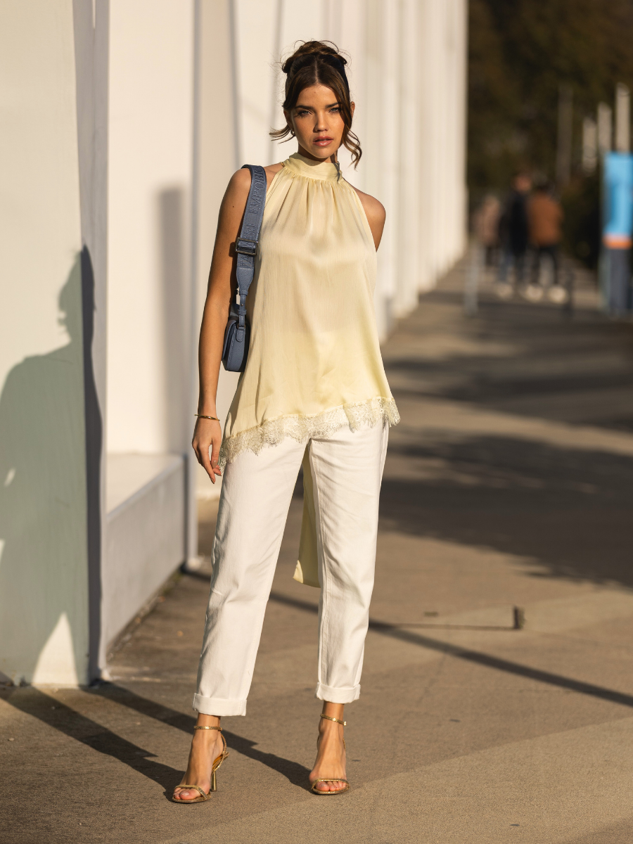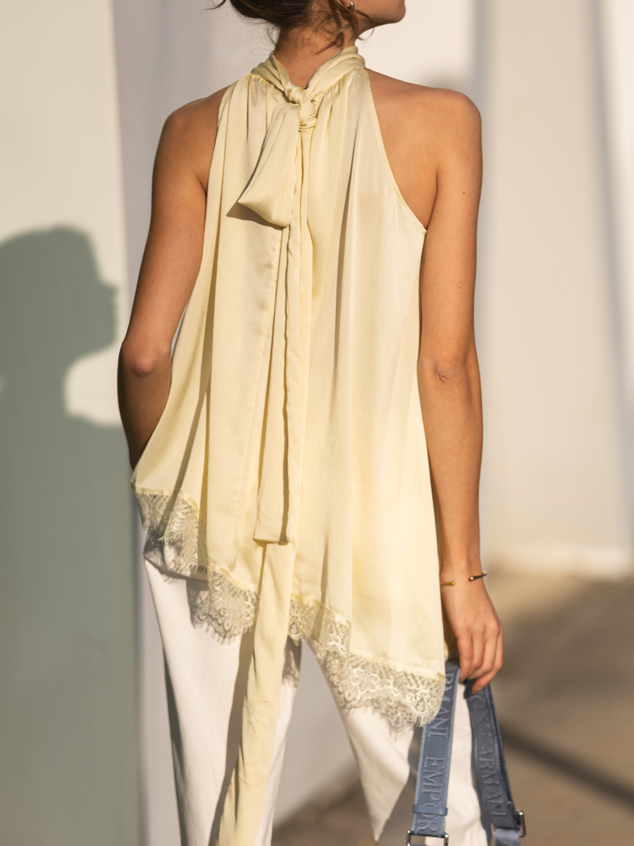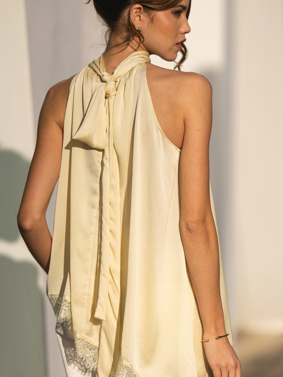 Este top acetinado em amarelo claro é a definição de sofisticação delicada. Com corte fluido e efeito drapeado, destaca-se pelo acabamento em renda fina na base e pela gola alta com detalhe de laço nas costas, que acrescenta um toque de charme e originalidade ao visual. O tecido leve e com brilho subtil proporciona um caimento elegante e confortável. Ideal para coordenar com jeans brancos, calças de alfaiataria ou saias fluídas — uma peça que eleva qualquer look casual ou de ocasião.