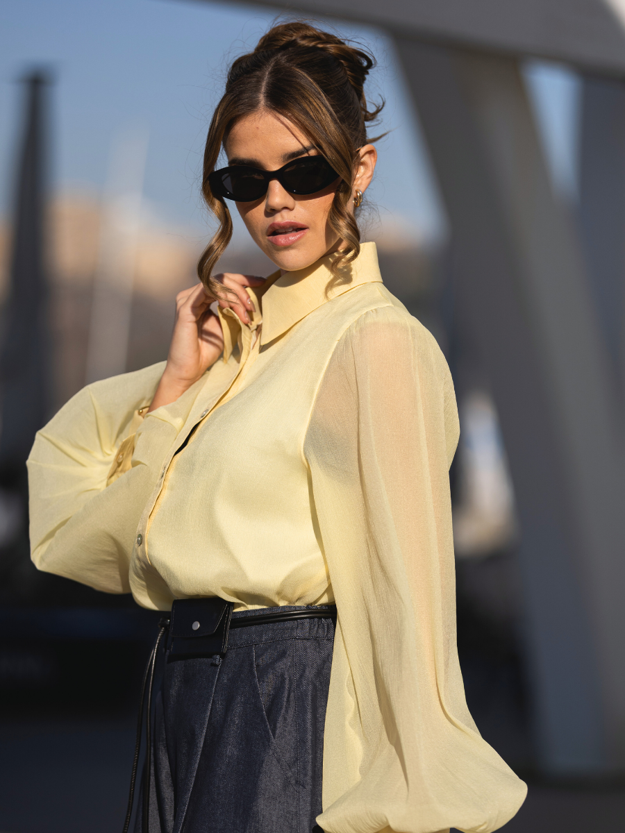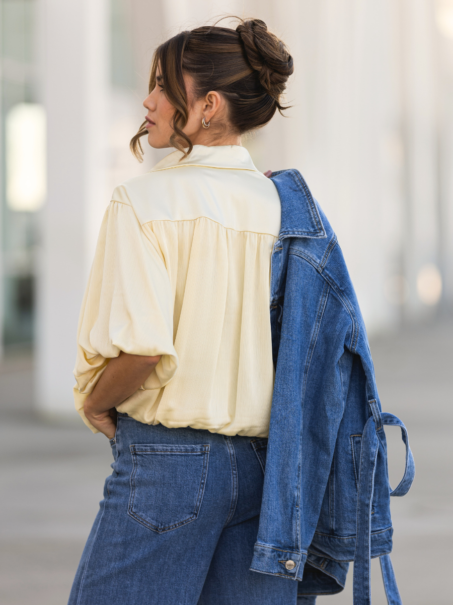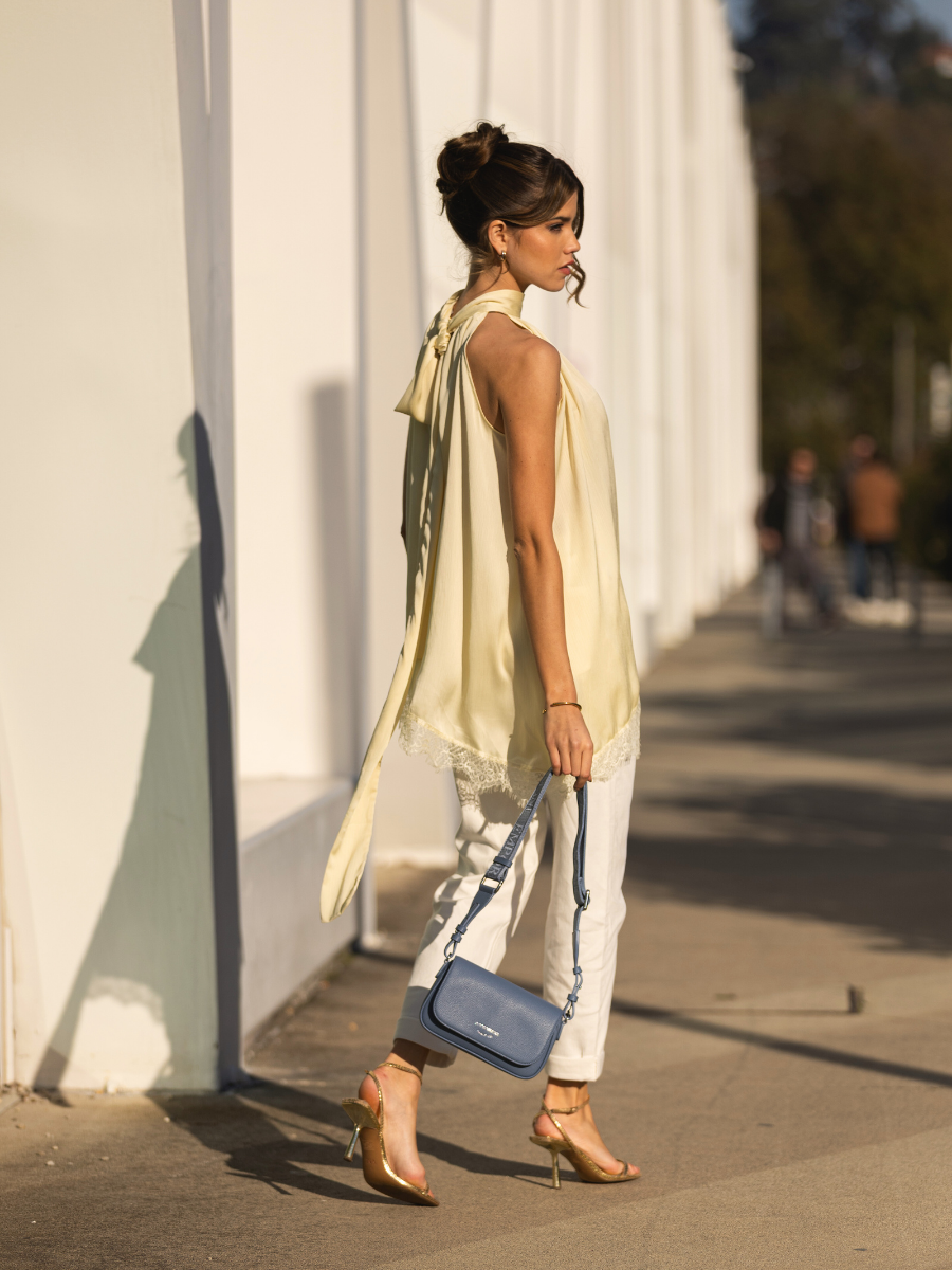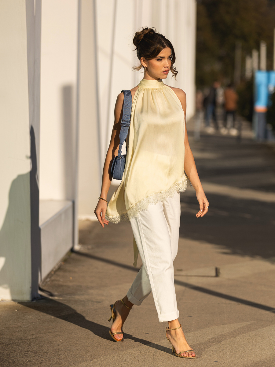Este top acetinado em amarelo claro é a definição de sofisticação delicada. Com corte fluido e efeito drapeado, destaca-se pelo acabamento em renda fina na base e pela gola alta com detalhe de laço nas costas, que acrescenta um toque de charme e originalidade ao visual. O tecido leve e com brilho subtil proporciona um caimento elegante e confortável. Ideal para coordenar com jeans brancos, calças de alfaiataria ou saias fluídas — uma peça que eleva qualquer look casual ou de ocasião.