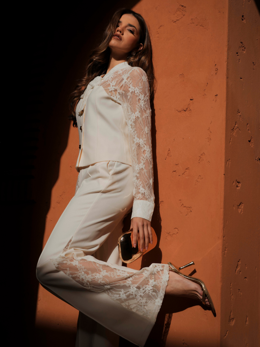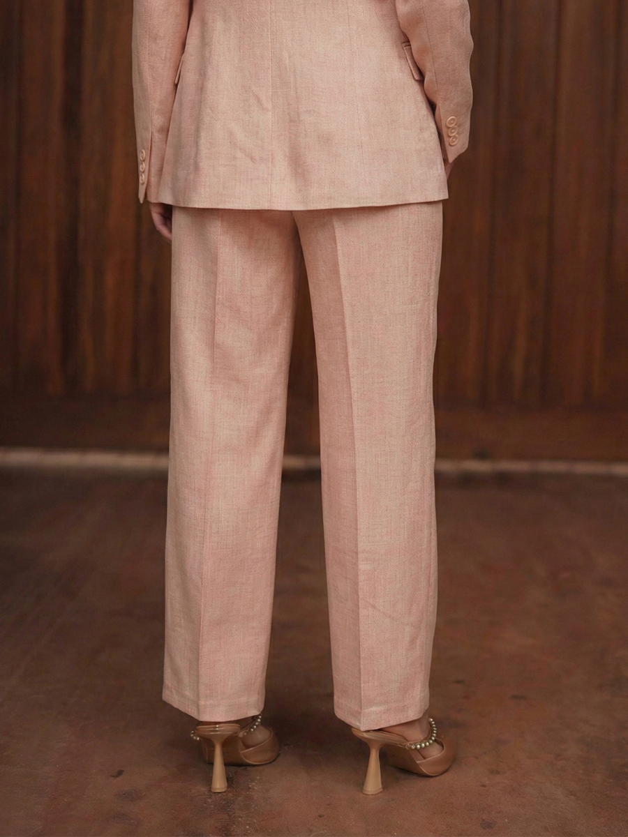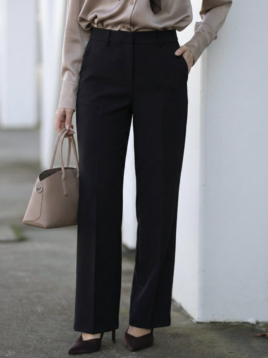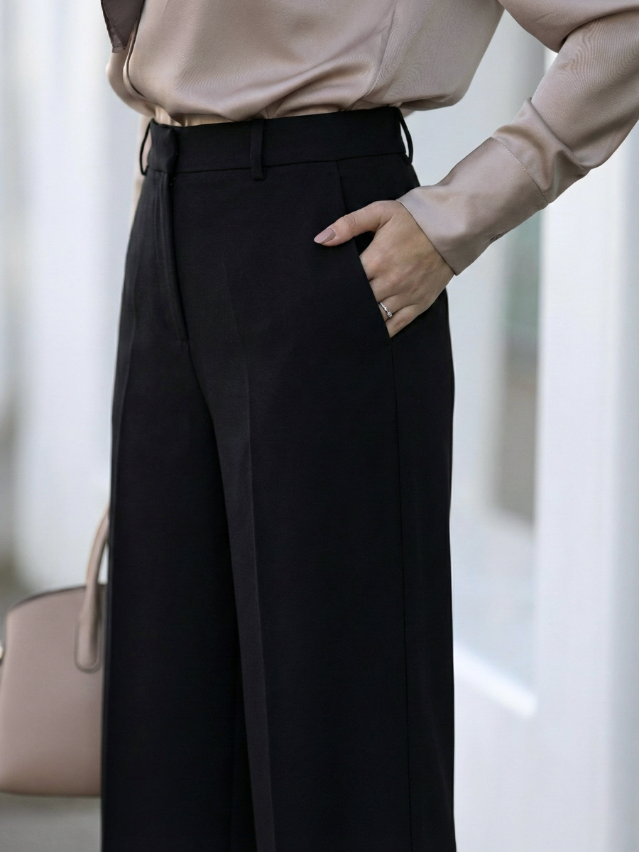 Confeccionadas em tecido estruturado, oferecem um caimento impecável e um toque suave ao vestir. As pinças frontais alongam visualmente as pernas e os bolsos laterais discretos acrescentam funcionalidade sem comprometer a estética refinada da peça.