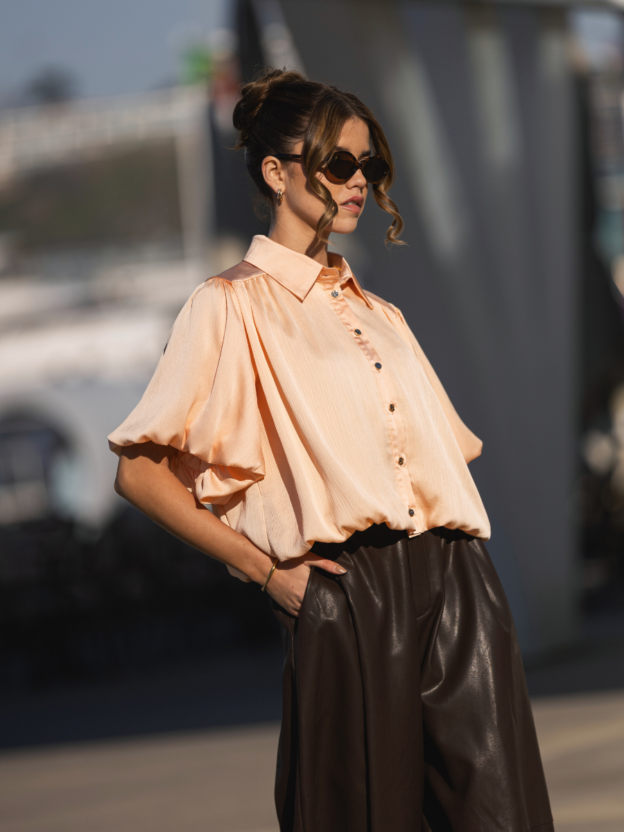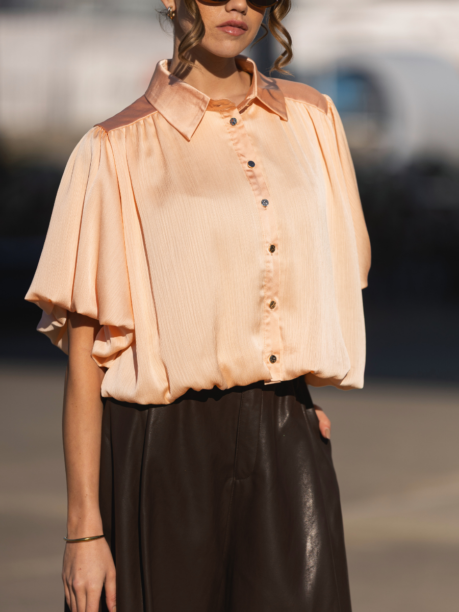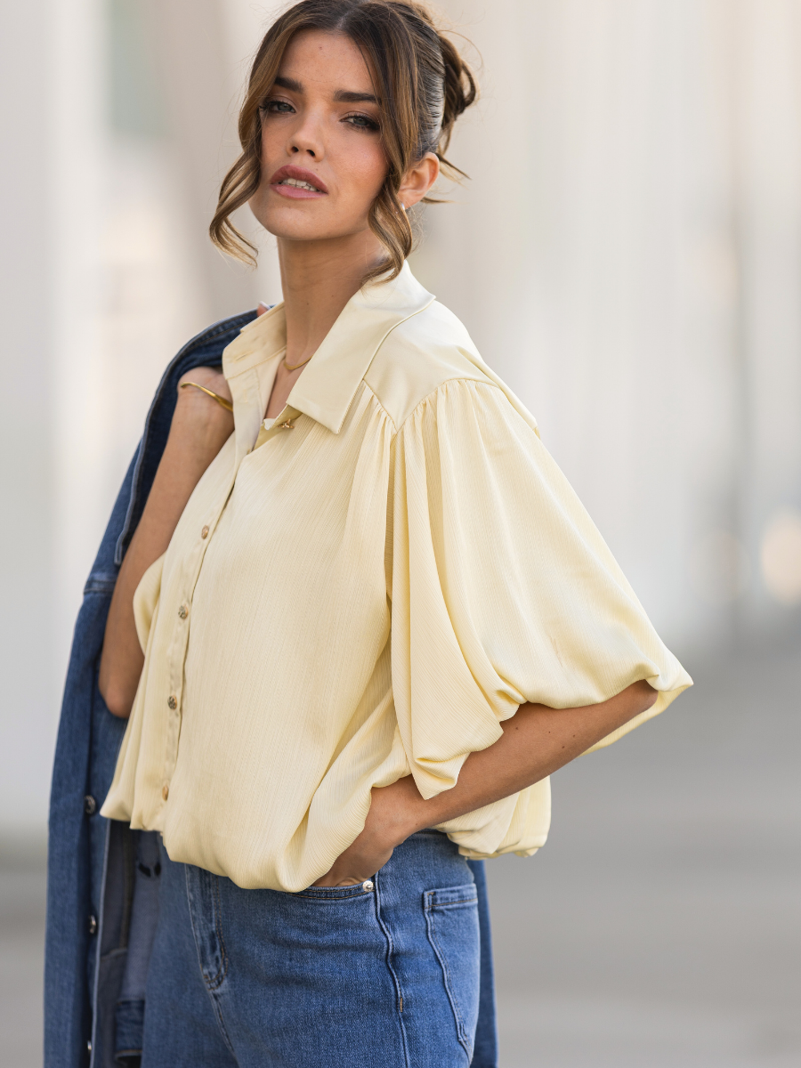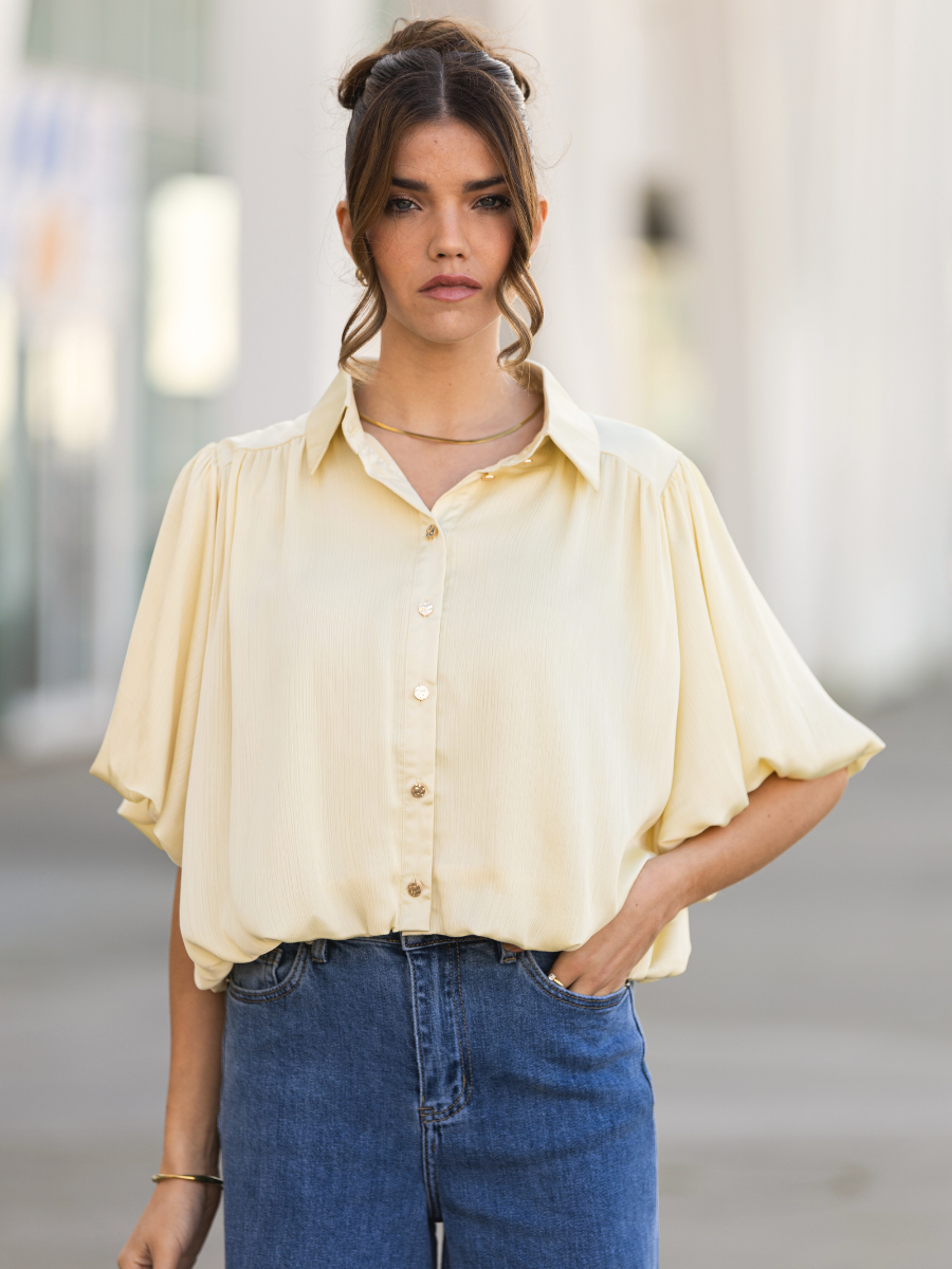 Blusa de tecido fluido com textura leve e acabamento subtilmente acetinado. Modelo de corte reto e relaxado, com gola de camisa clássica e carcela de botões à frente. As mangas curtas apresentam um volume elegante e ligeiramente franzido, que acrescenta movimento e sofisticação ao visual. Ideal para combinar com jeans ou peças de alfaiataria, esta blusa conjuga conforto e elegância com um toque contemporâneo. Disponível em dois tons suaves e luminosos: amarelo claro e laranja pêssego.