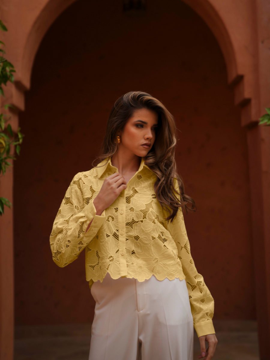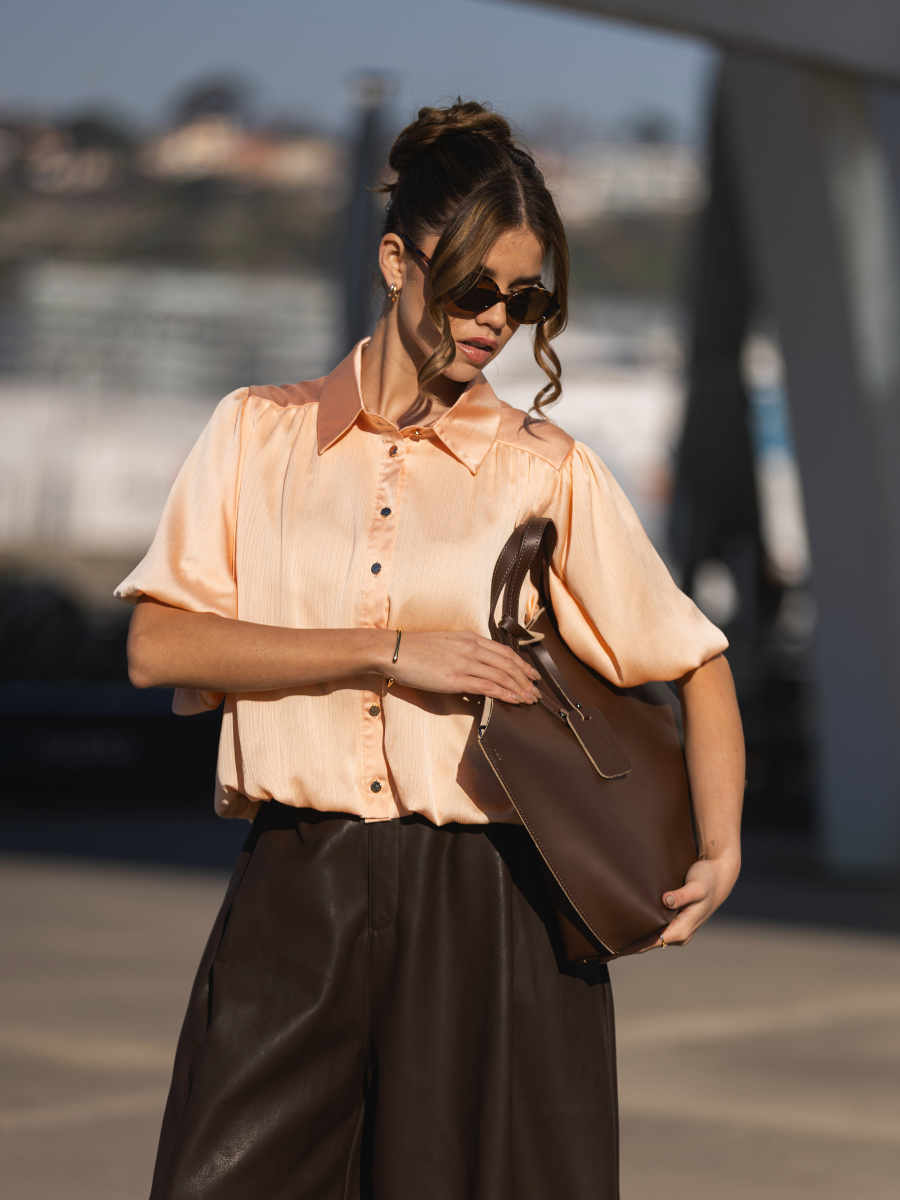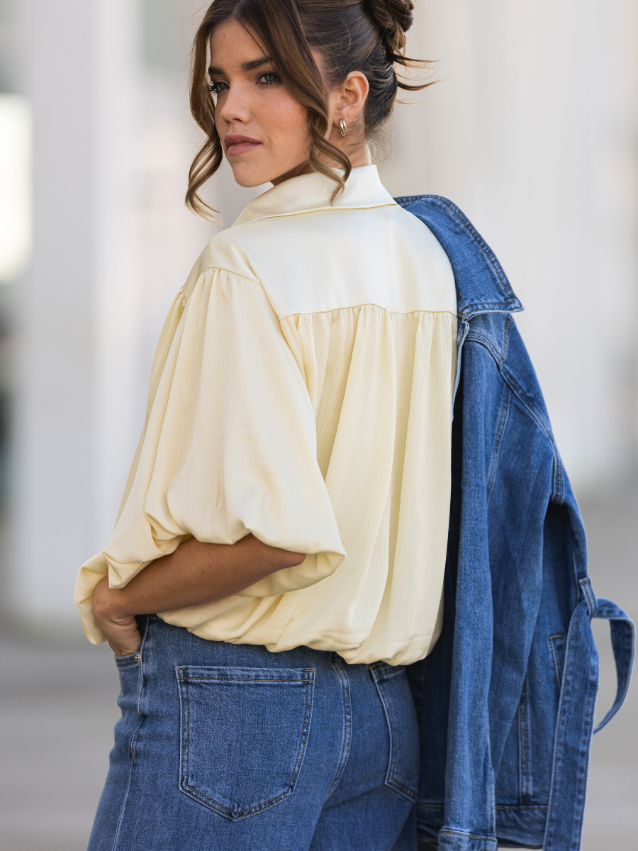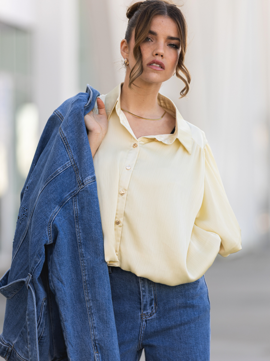 Blusa de tecido fluido com textura leve e acabamento subtilmente acetinado. Modelo de corte reto e relaxado, com gola de camisa clássica e carcela de botões à frente. As mangas curtas apresentam um volume elegante e ligeiramente franzido, que acrescenta movimento e sofisticação ao visual. Ideal para combinar com jeans ou peças de alfaiataria, esta blusa conjuga conforto e elegância com um toque contemporâneo. Disponível em dois tons suaves e luminosos: amarelo claro e laranja pêssego.