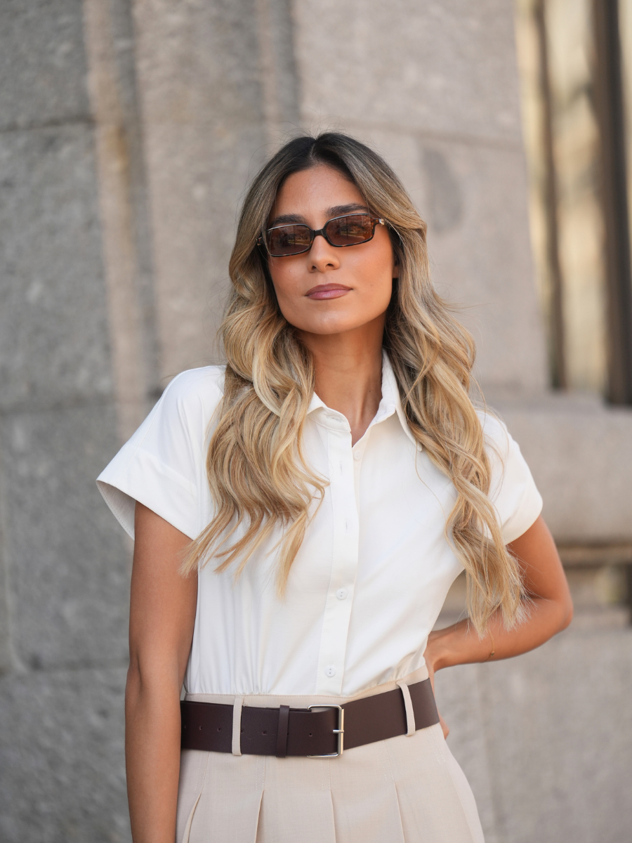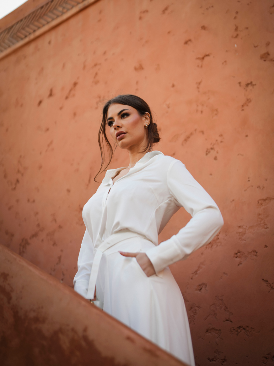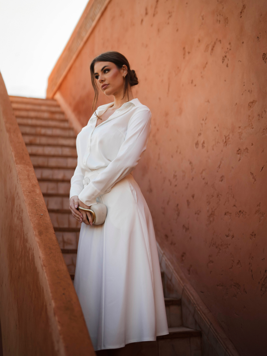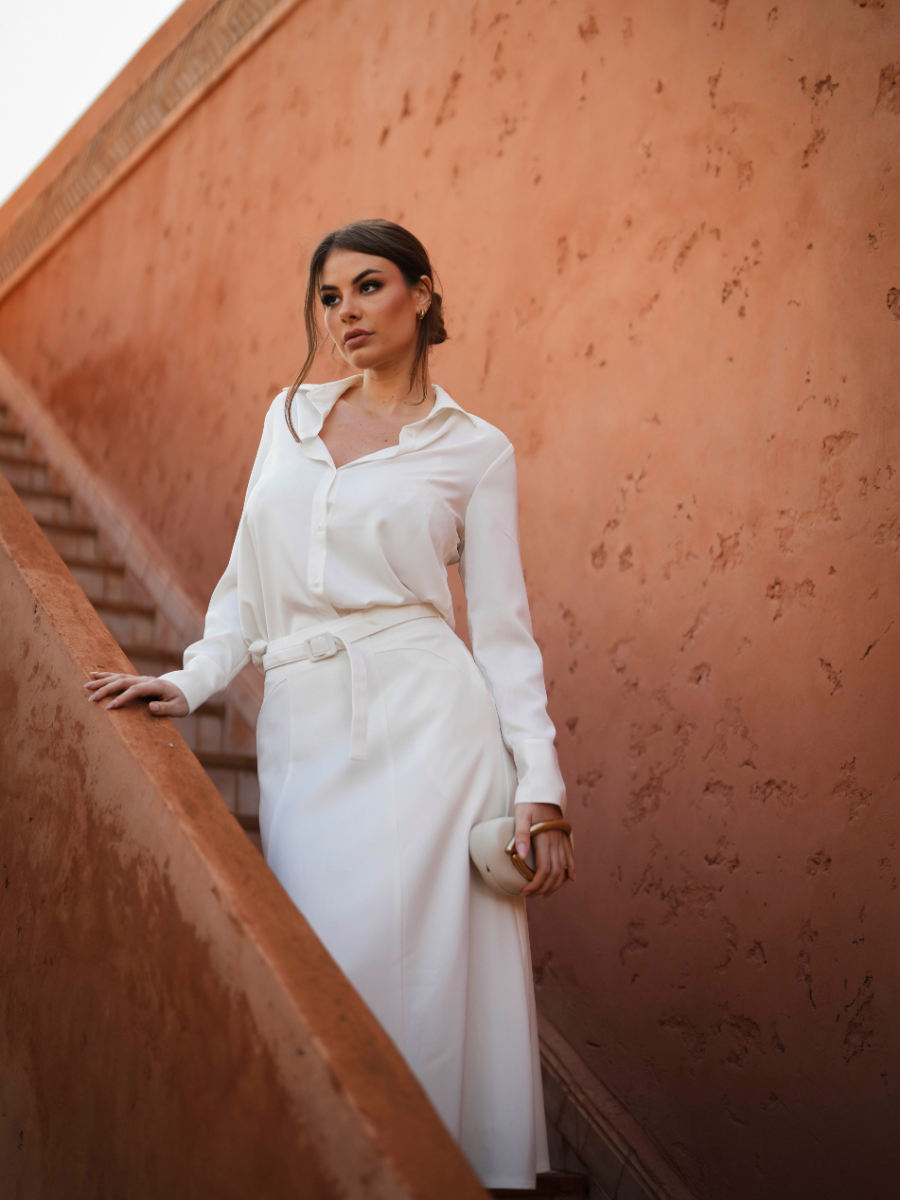 Com um corte elegante e estrutura refinada, este vestido camiseiro é a definição de sofisticação urbana. Confeccionado em tecido leve e estruturado, destaca-se pela gola clássica, mangas curtas dobradas e fecho frontal com botões ocultos, conferindo um acabamento limpo e minimalista. A cintura é marcada com um cinto largo em contraste, que realça a silhueta e adiciona um toque moderno à peça.