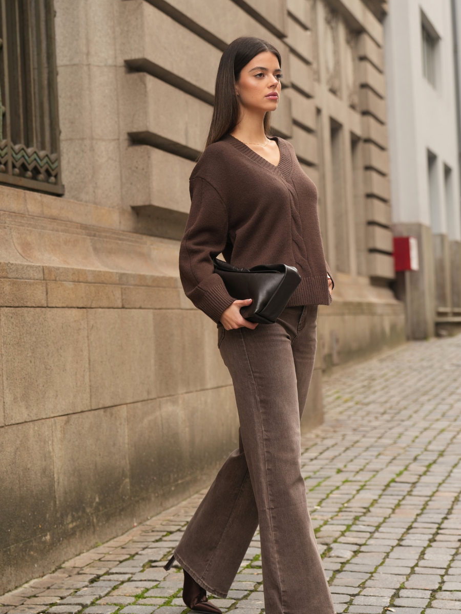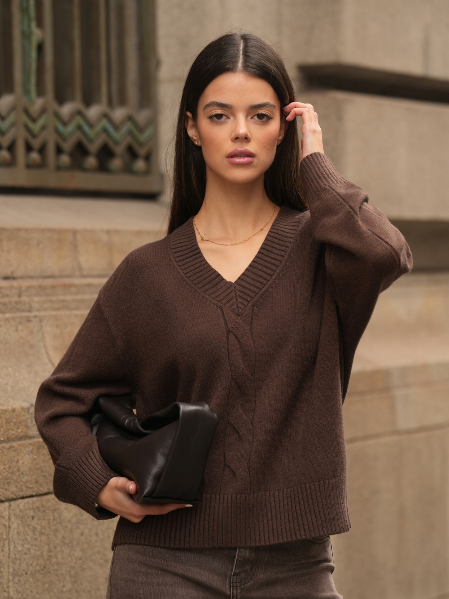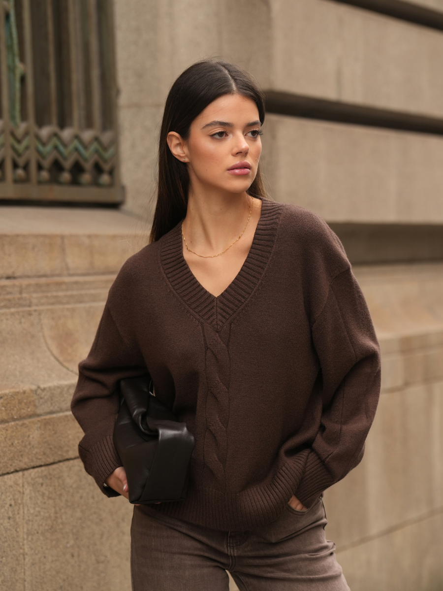 Com um design envolvente e elegante, esta camisola oversized em tom castanho escuro destaca-se pela gola larga e estrutura suave ao toque. O corte reto tornam-na perfeita para sobrepor com camisas ou usar sozinha nos dias frios.