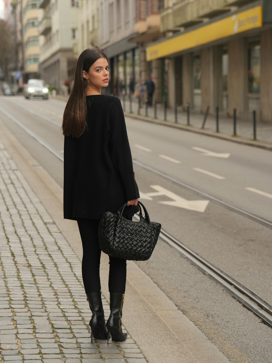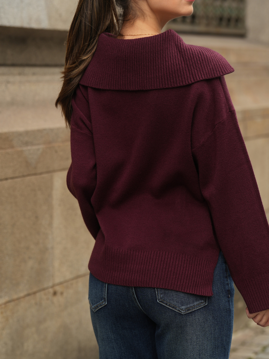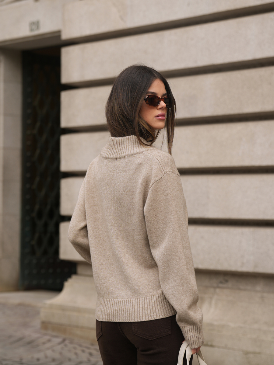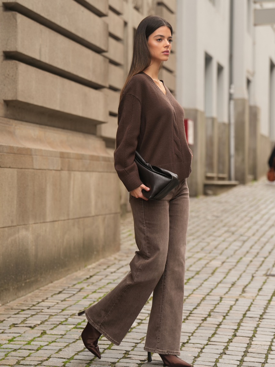 Com um design envolvente e elegante, esta camisola oversized em tom castanho escuro destaca-se pela gola larga e estrutura suave ao toque. O corte reto tornam-na perfeita para sobrepor com camisas ou usar sozinha nos dias frios.