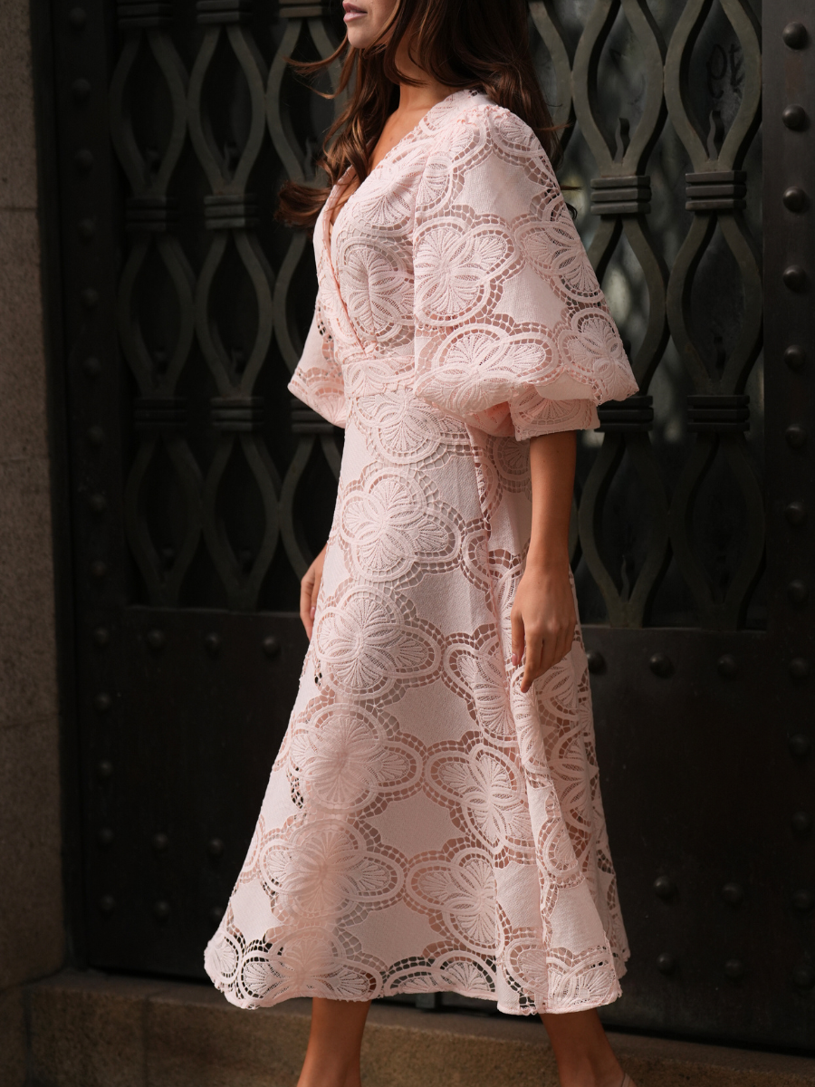 Vestido midi elegante com padrão floral delicado, ideal para um look feminino e sofisticado. O decote em V cruzado valoriza a silhueta, enquanto as mangas balão acrescentam volume e estilo. A saia fluida garante leveza e movimento.