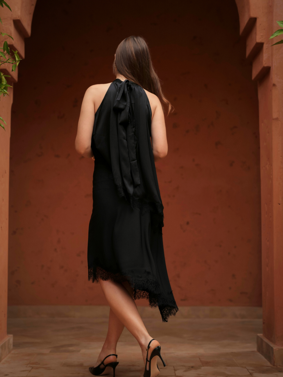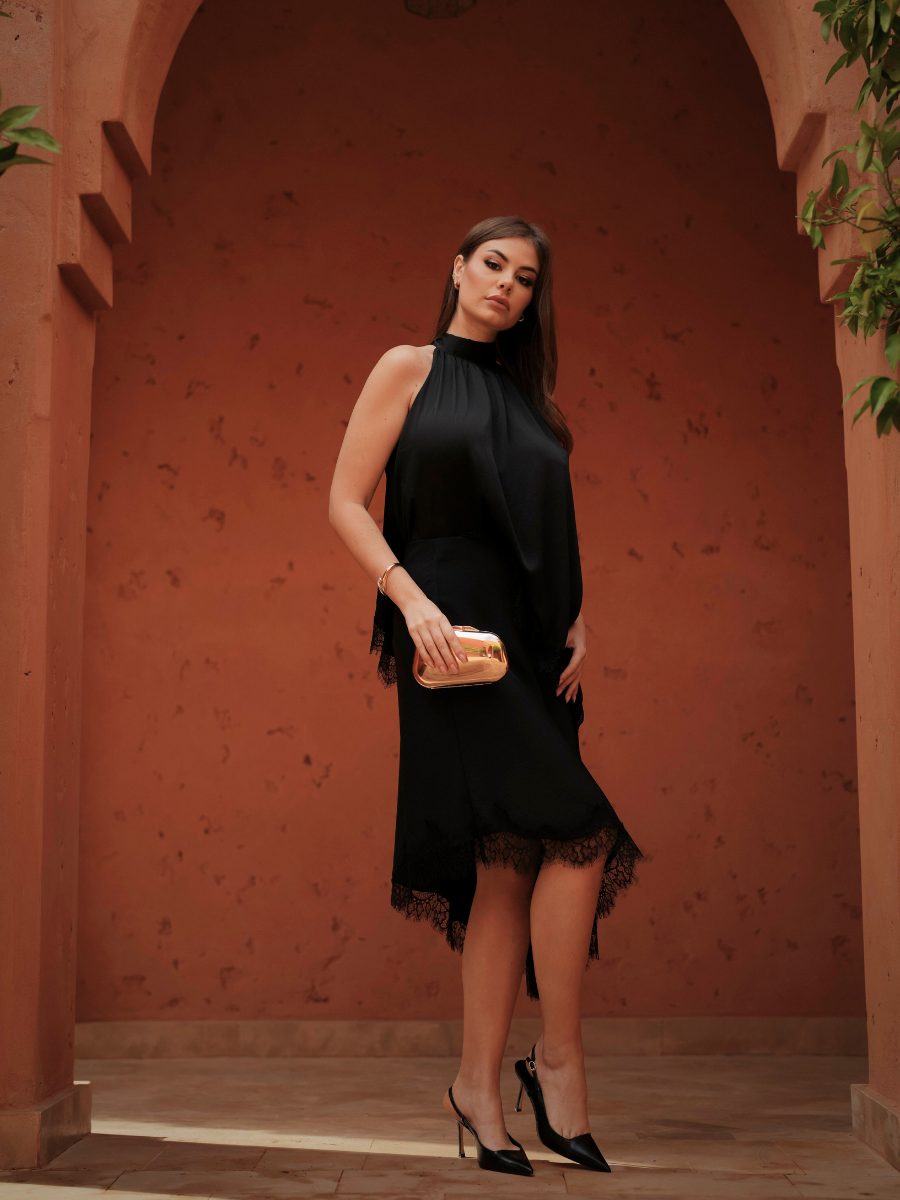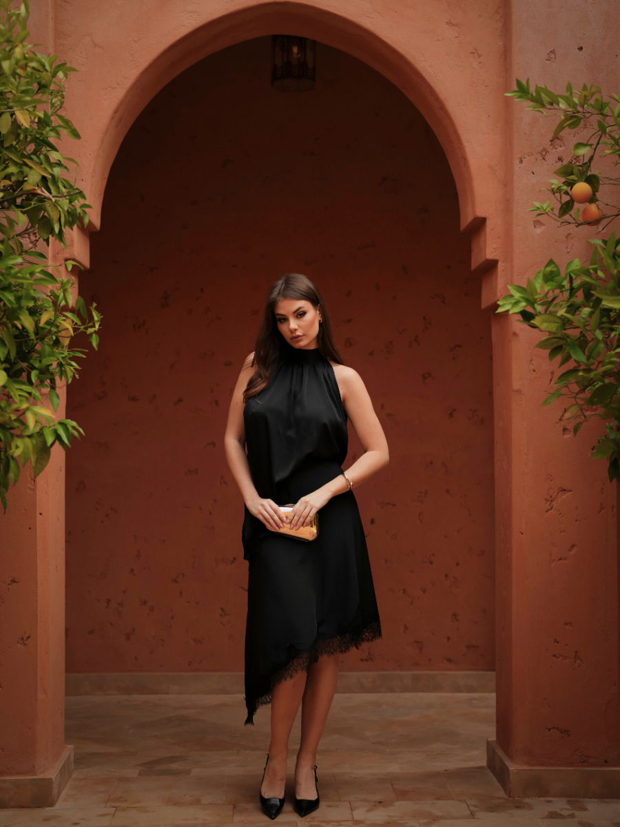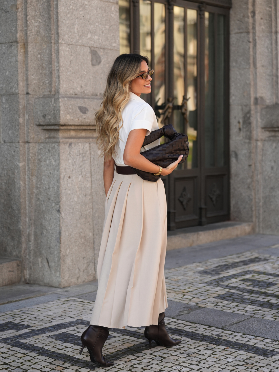 A saia fluida, em comprimento midi, apresenta pregas largas que trazem movimento e elegância ao caminhar, tornando este vestido uma opção versátil para contextos formais ou encontros descontraídos com um toque de classe.