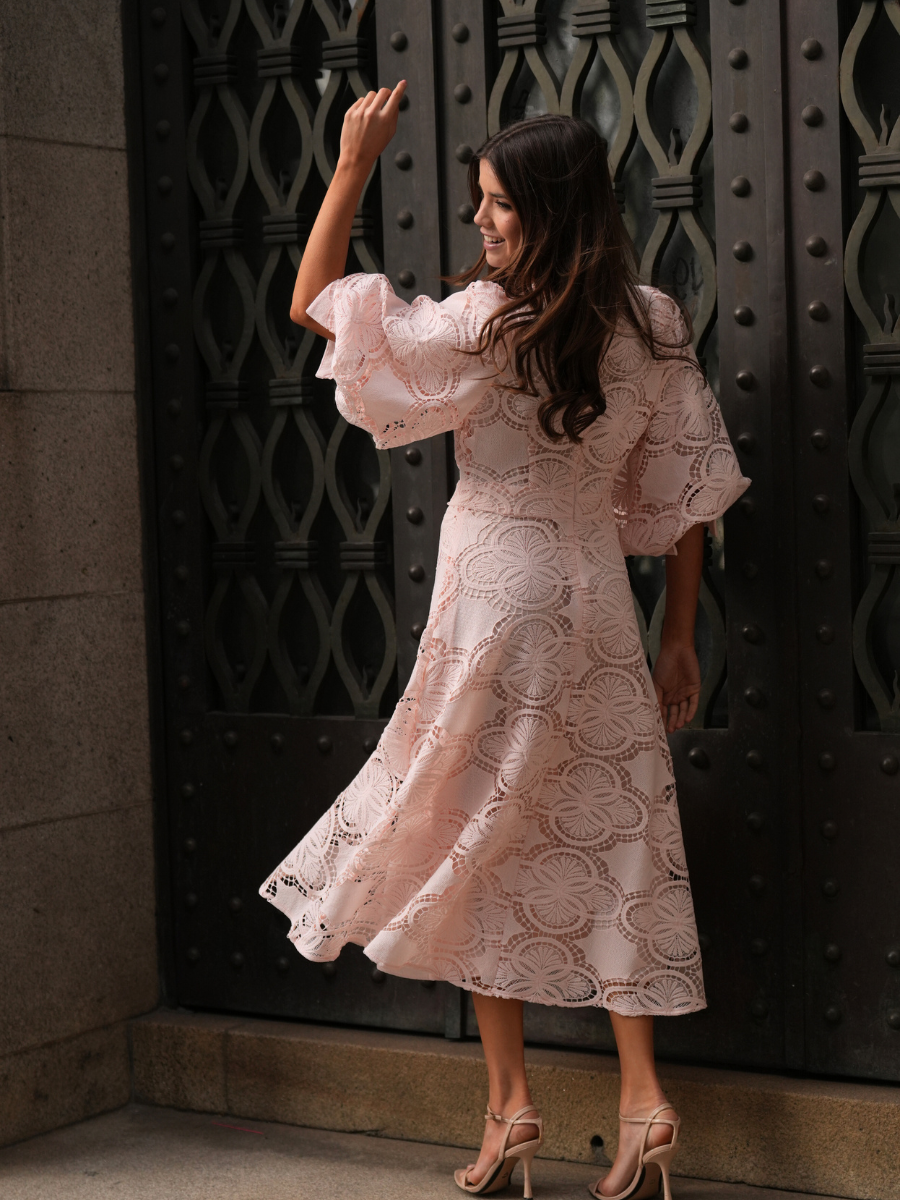 Vestido midi com decote drapeado que valoriza o colo. As alças finas com aplicações florais e o detalhe nos braços dão um toque romântico e sofisticado. A barra com renda completa o look com delicadeza.