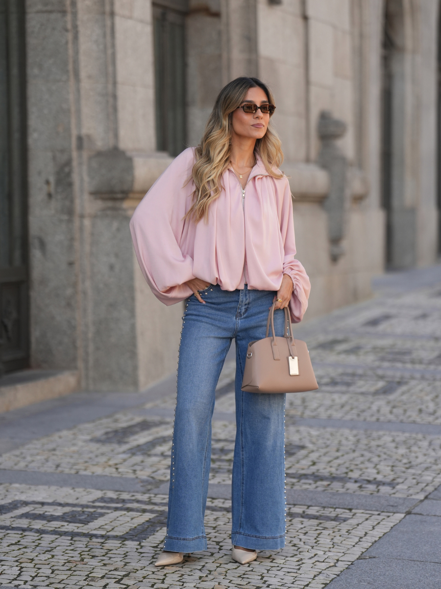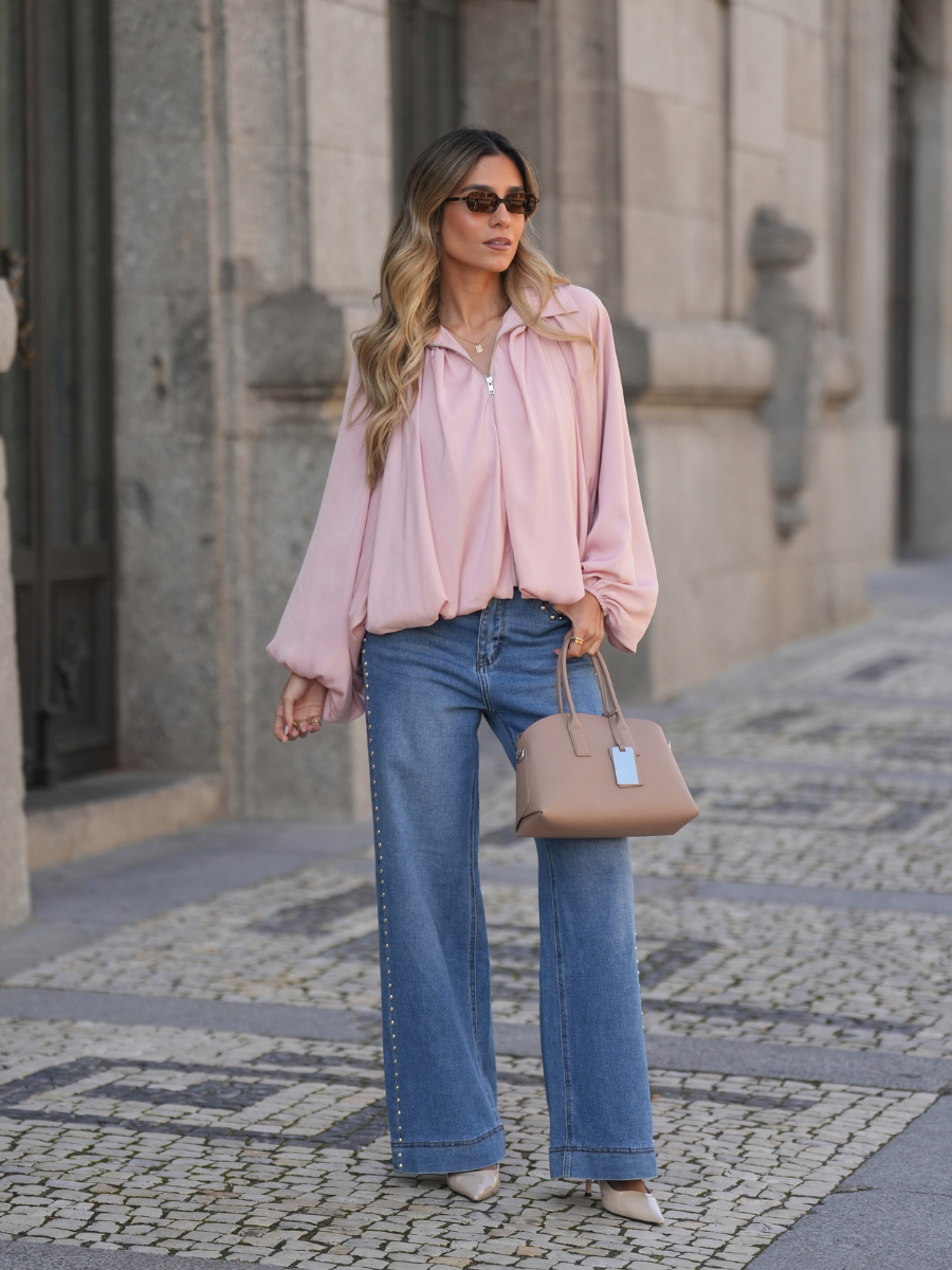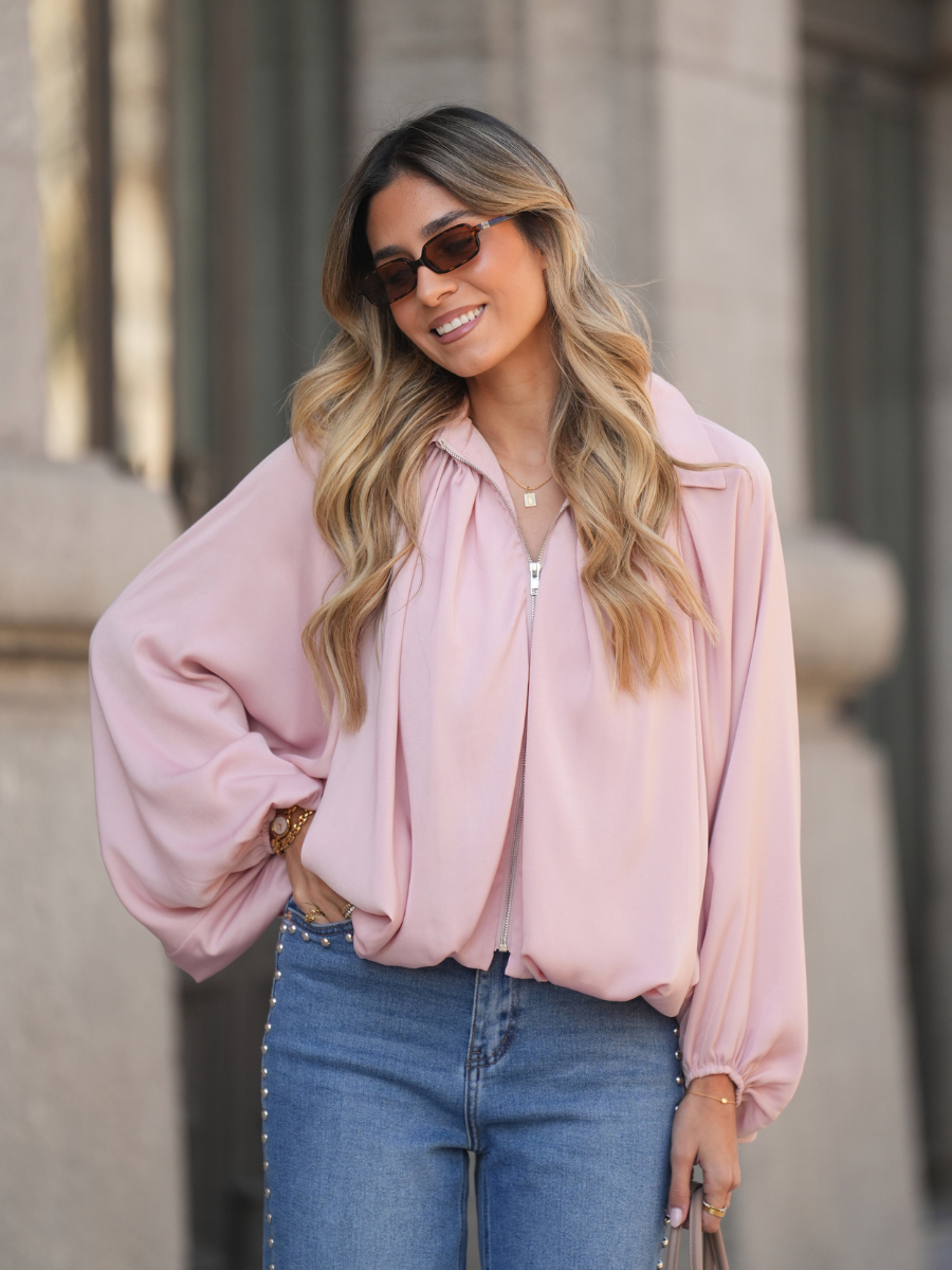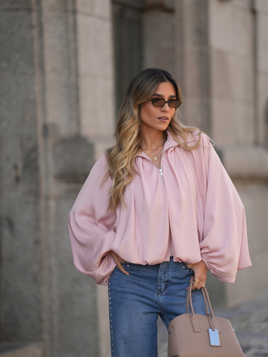 Casaco fluido com design descontraído e elegante. Confeccionado num tecido leve, esta peça destaca-se pelas mangas amplas de efeito balão com acabamento franzido nos punhos, criando um visual volumoso e sofisticado. Apresenta gola clássica e fecho frontal em zíper metálico prateado que permite diferentes formas de uso — aberto para um look mais casual ou fechado para um efeito polido e minimalista.
