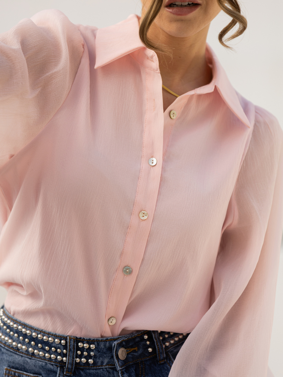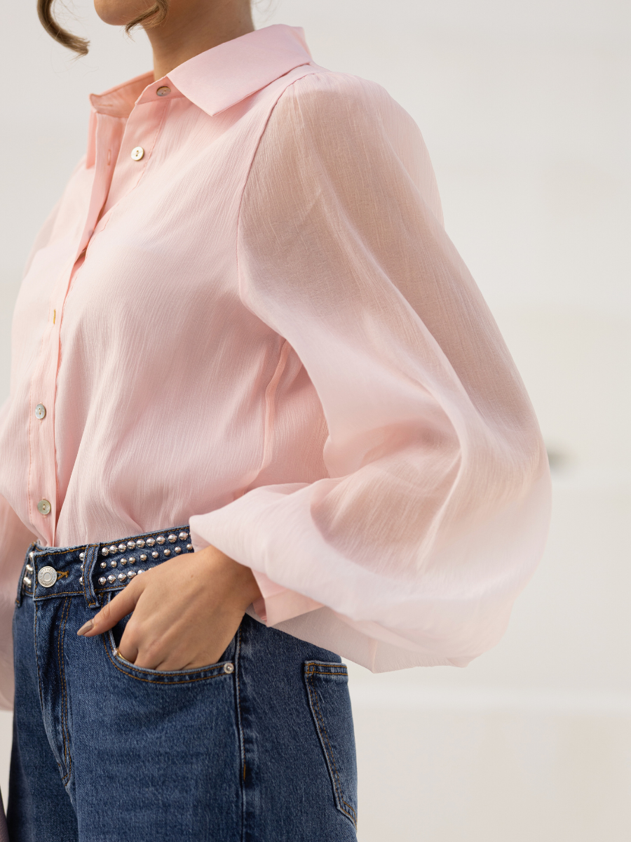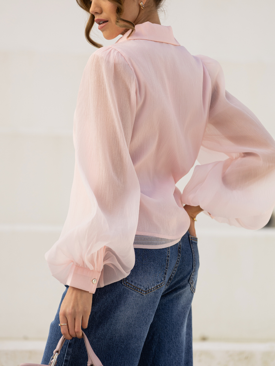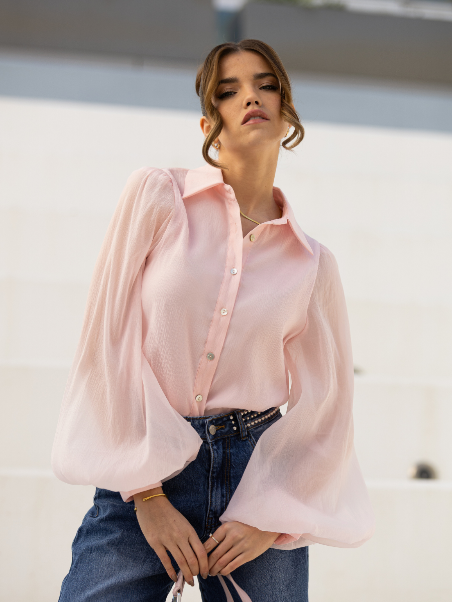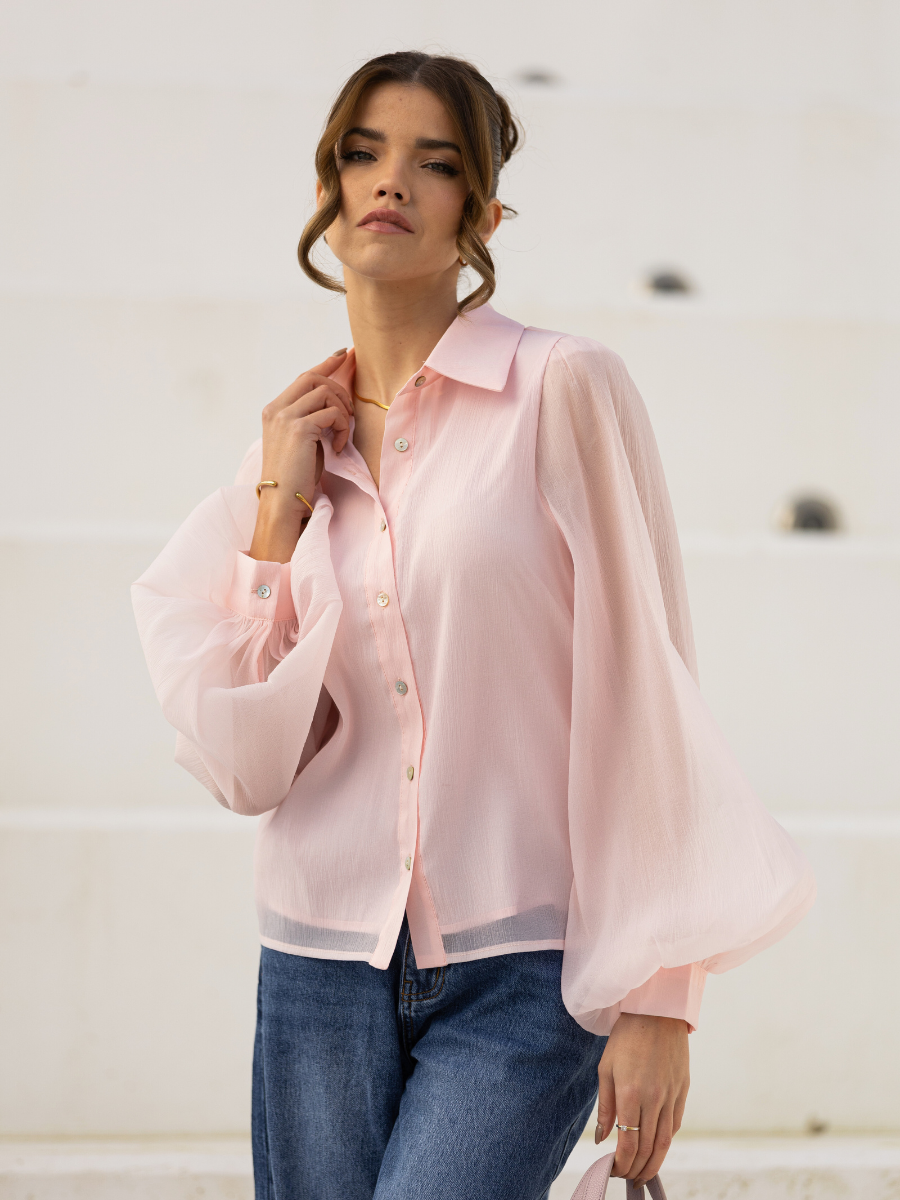 Blusa rosa feminina com mangas balão em tecido leve e transparente. Modelo elegante com gola clássica, punhos com botão e fecho frontal com botões. Ideal para looks românticos e sofisticados.