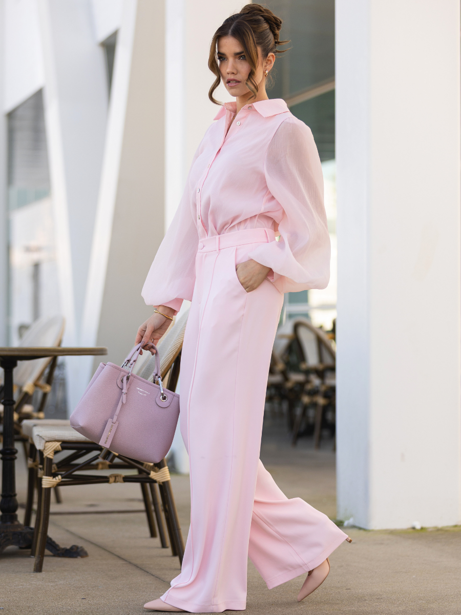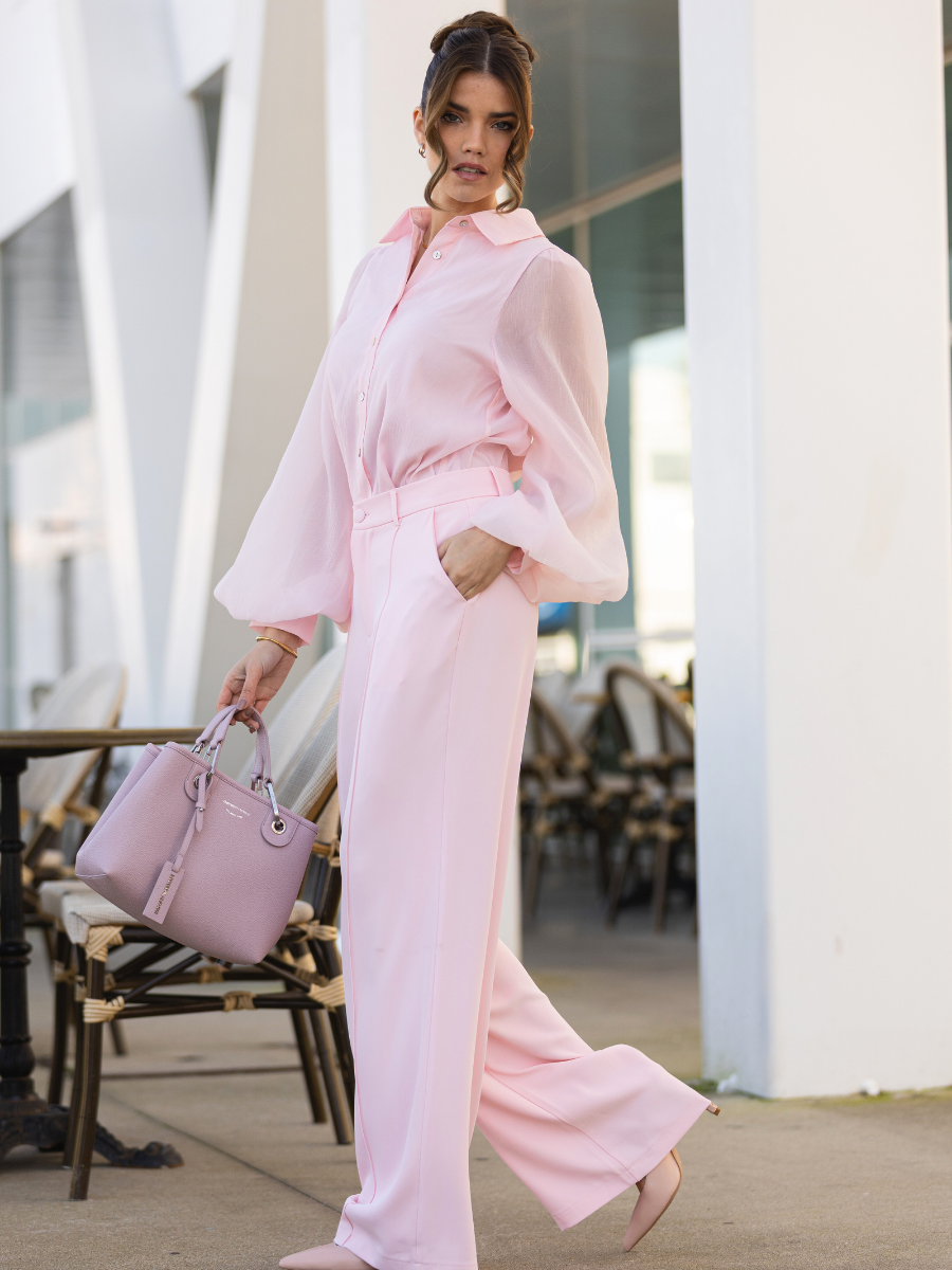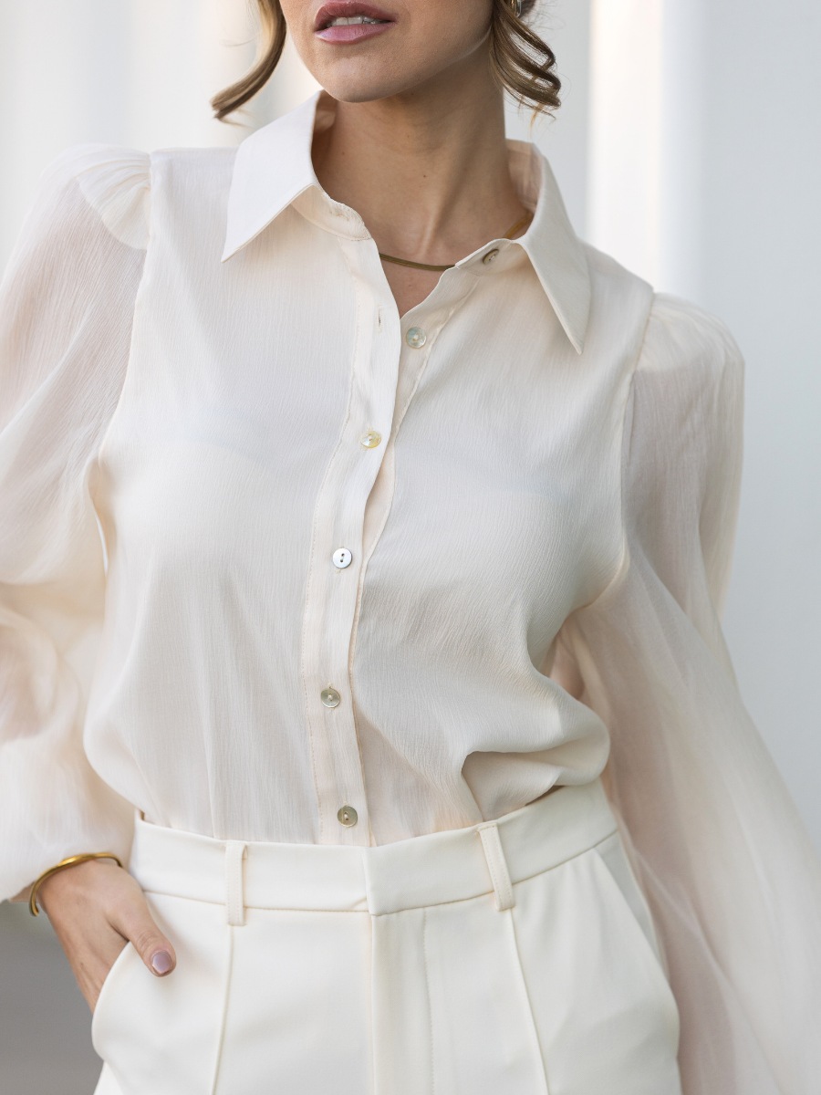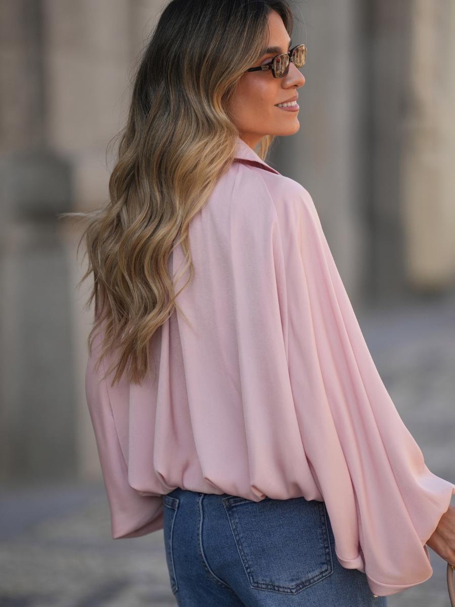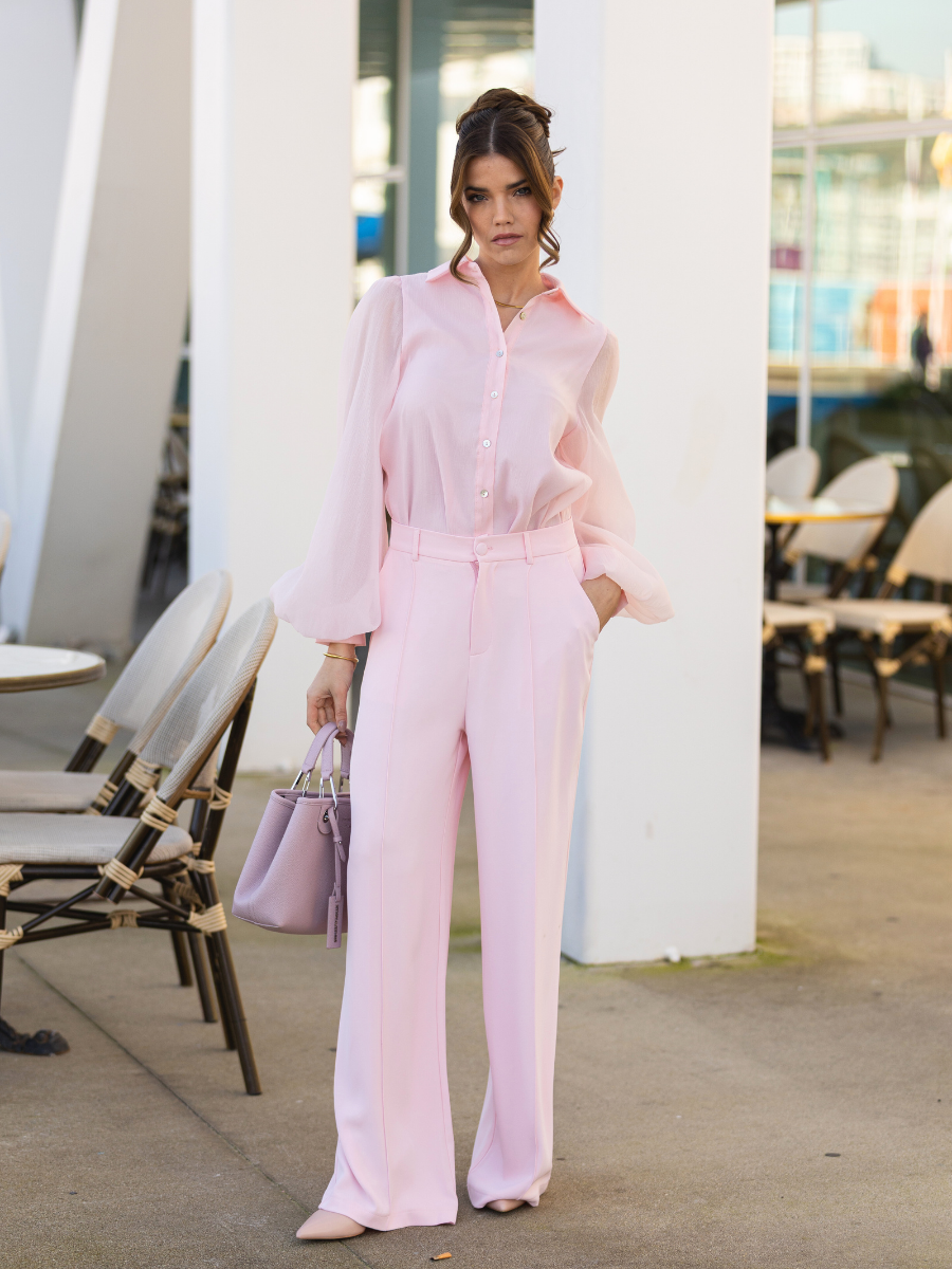 Blusa rosa feminina com mangas balão em tecido leve e transparente. Modelo elegante com gola clássica, punhos com botão e fecho frontal com botões. Ideal para looks românticos e sofisticados.