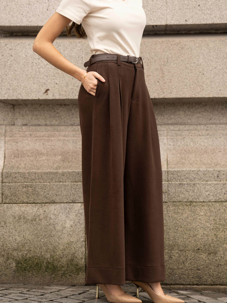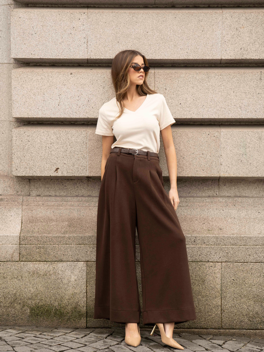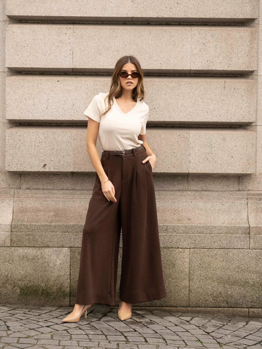 Calças wide leg em malha de tom castanho. O design de perna larga e corte fluido garante conforto e movimento, enquanto os detalhes como as pinças frontais a condizer acrescentam um toque de sofisticação. A cintura alta com presilhas e o fecho de botão e fecho oculto conferem um acabamento elegante.