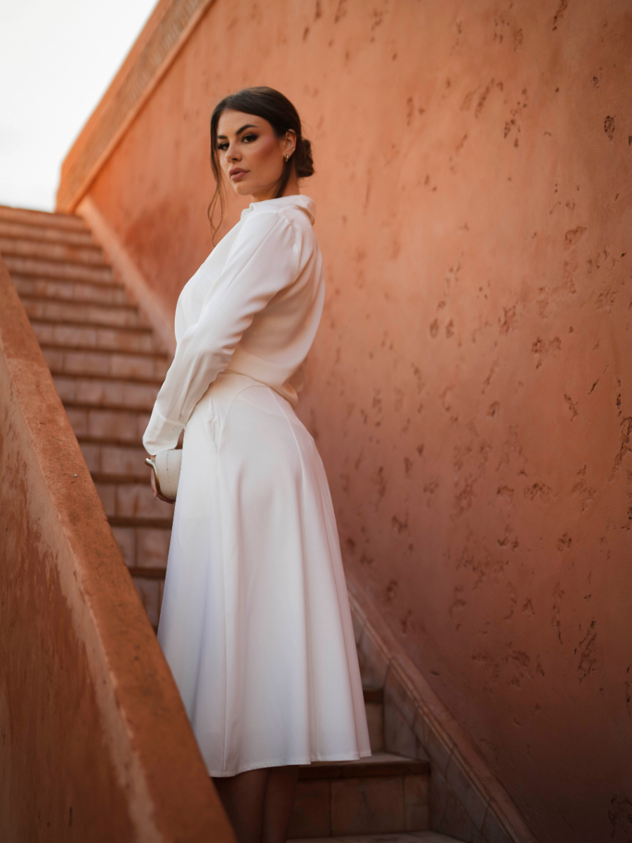 O design é complementado com bolsos falsos à frente e um fecho discreto nas costas. Uma escolha versátil para eventos de dia ou para um look sofisticado de fim de tarde.