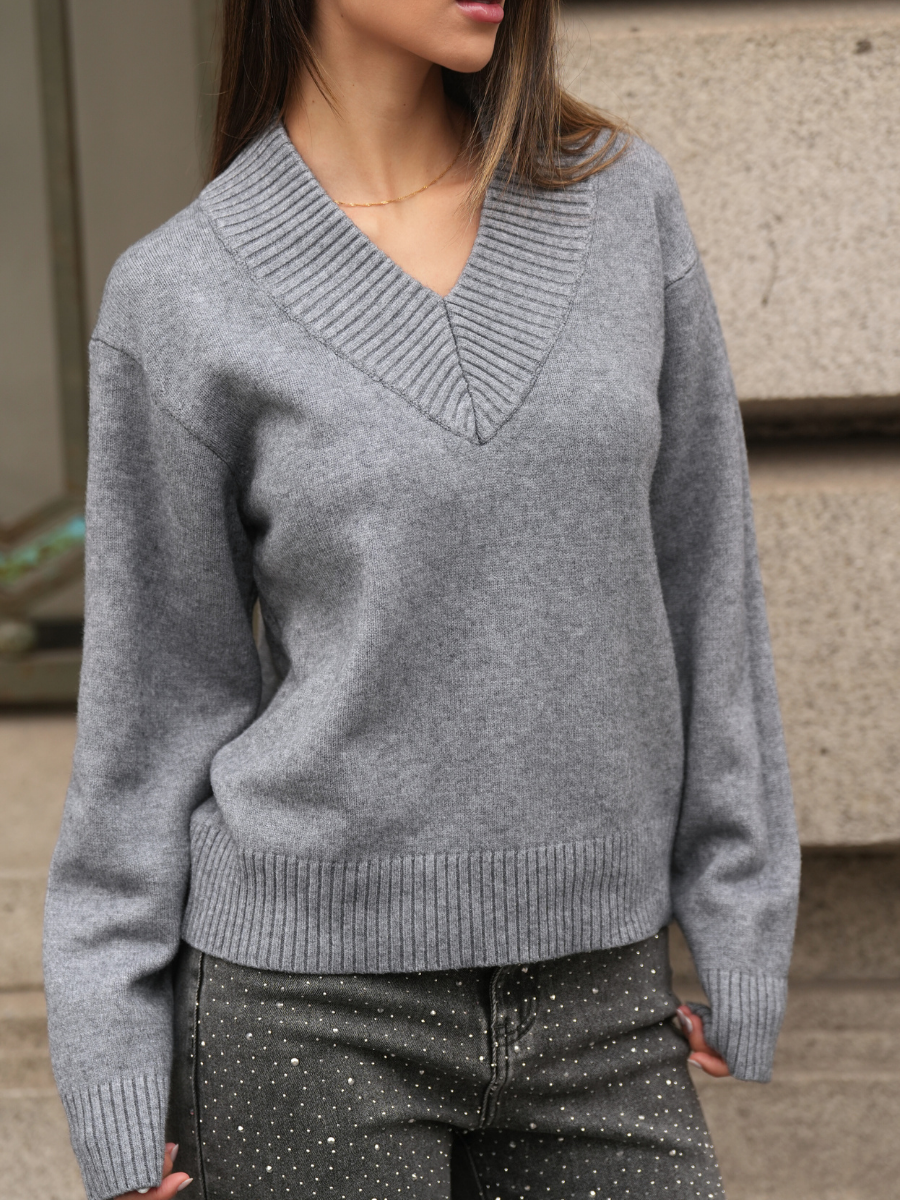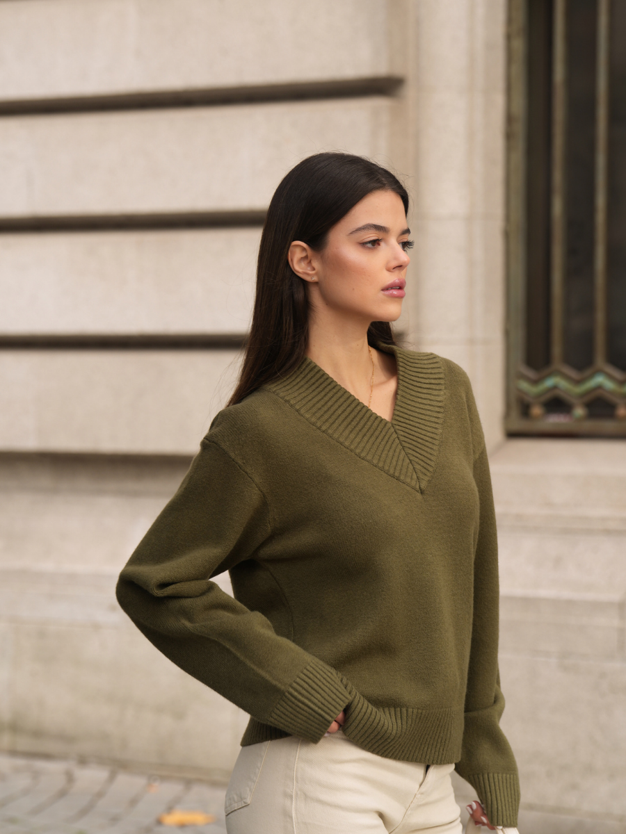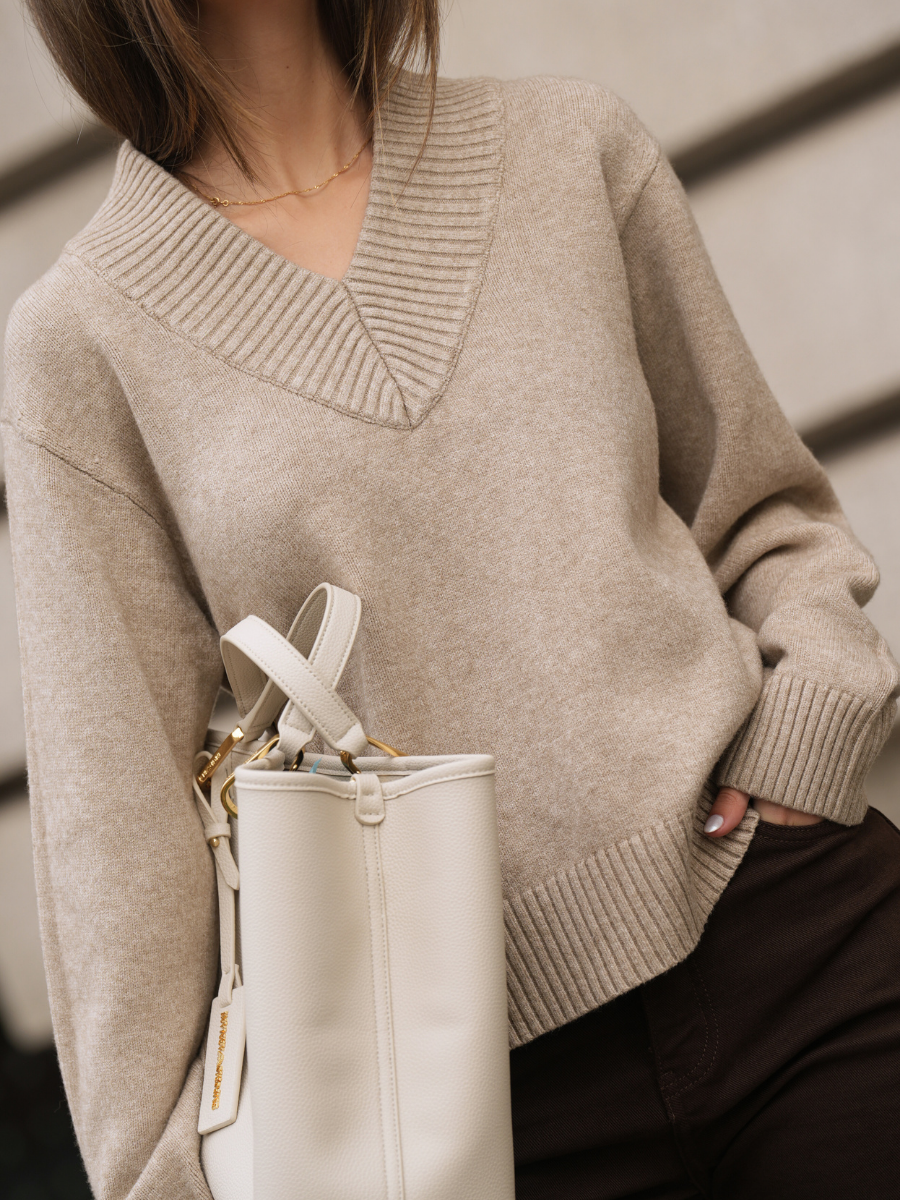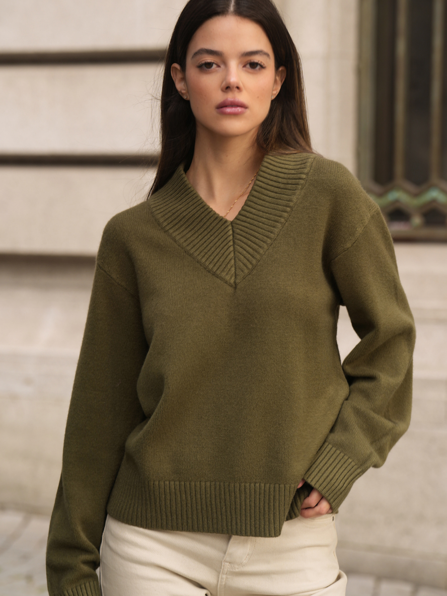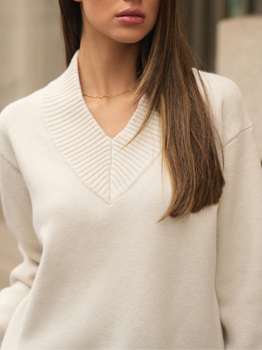 Camisola em malha suave com decote em V, disponível em tons neutros e versáteis. Corte descontraído com acabamento canelado nos punhos e na bainha. Um essencial confortável e elegante para o dia a dia.