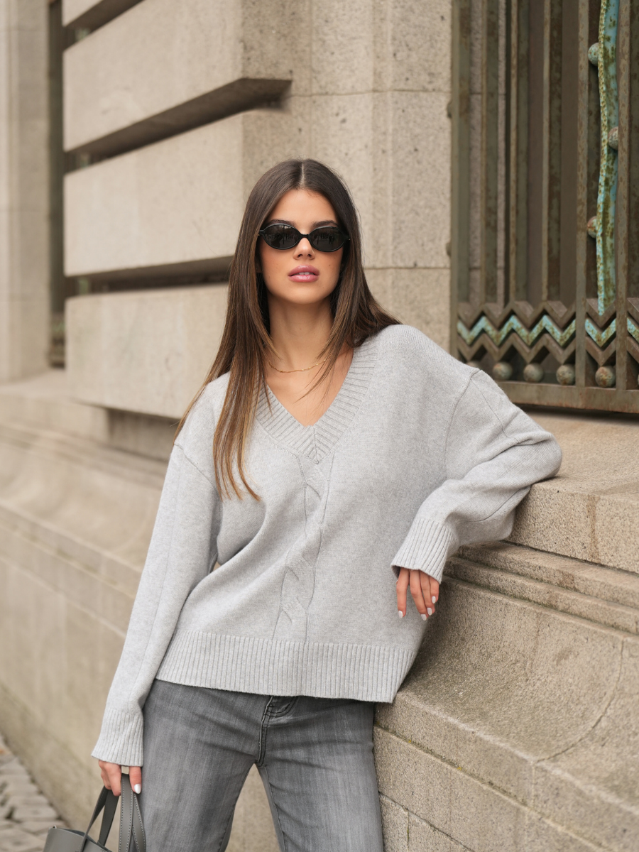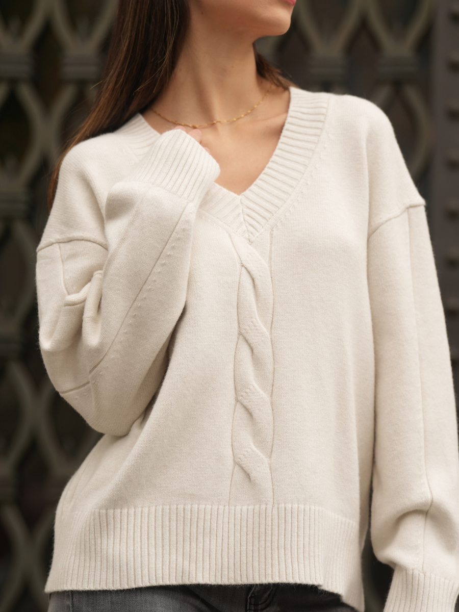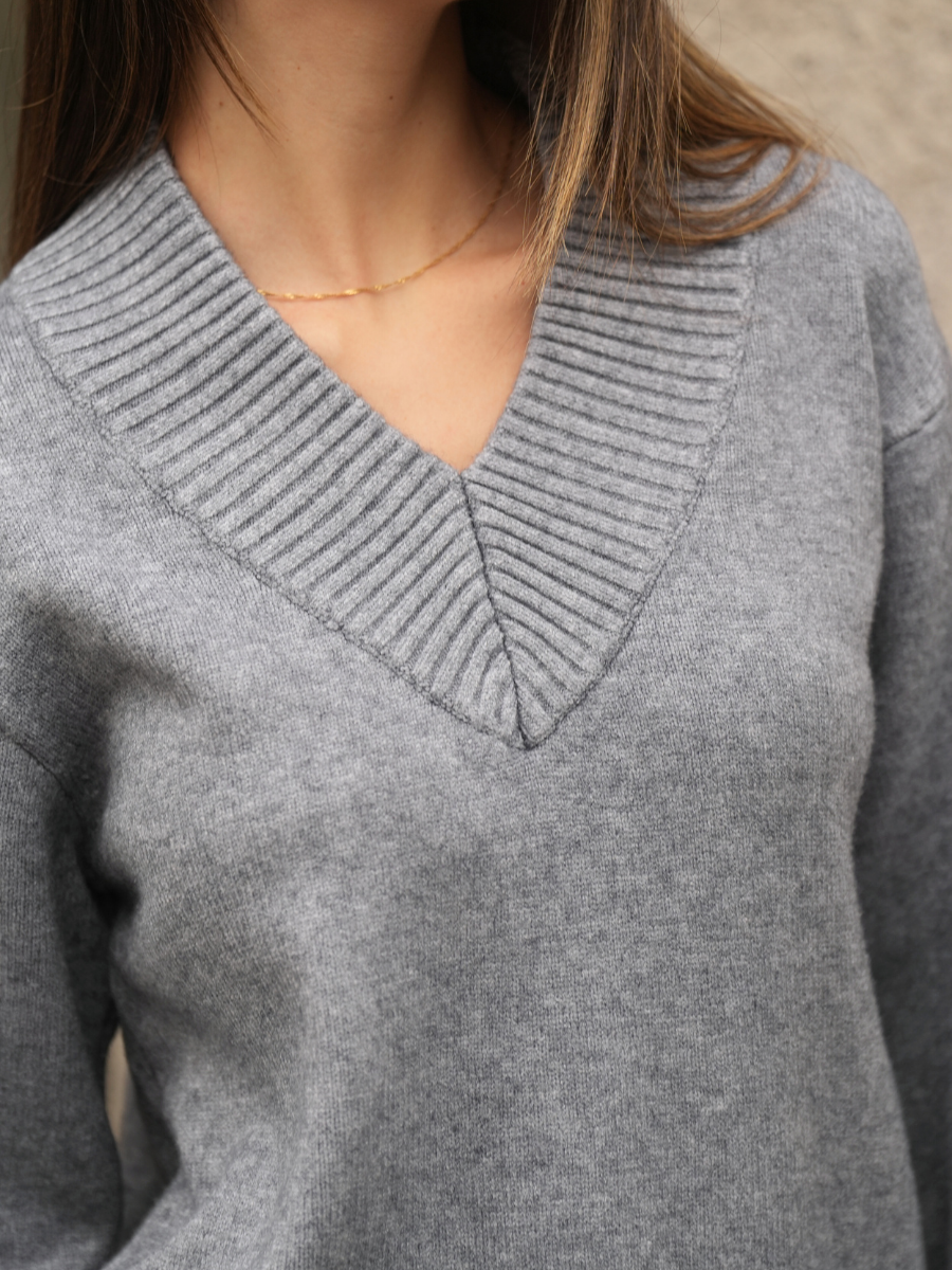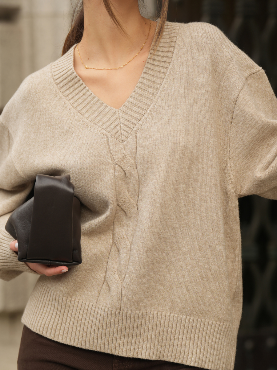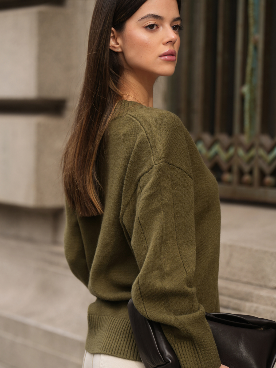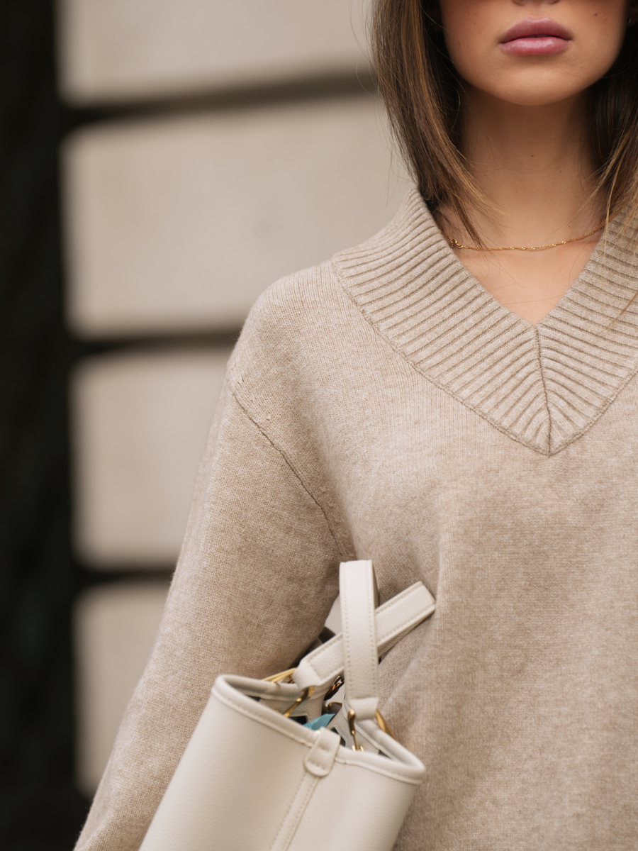Camisola em malha suave com decote em V, disponível em tons neutros e versáteis. Corte descontraído com acabamento canelado nos punhos e na bainha. Um essencial confortável e elegante para o dia a dia.