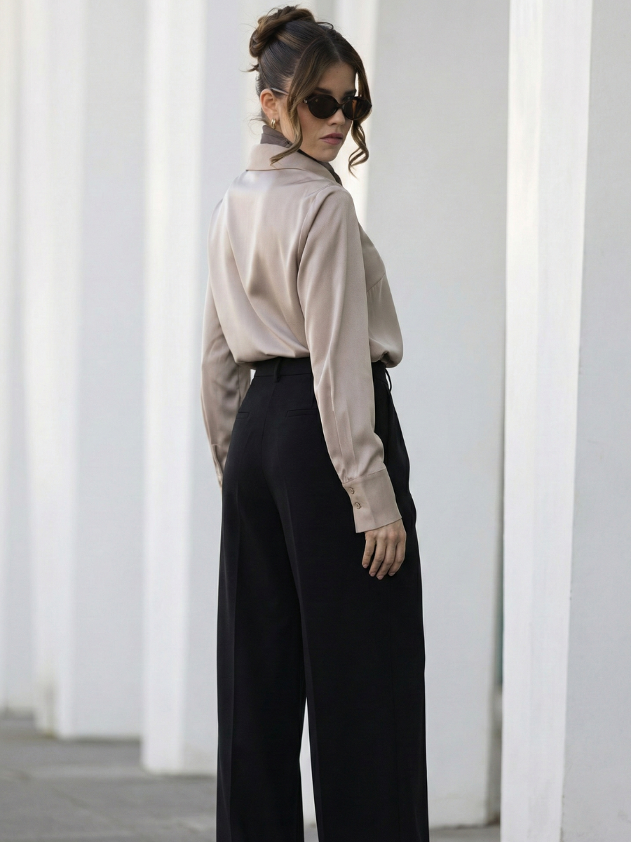 Combine com camisolas justas ou camisas fluídas para um visual equilibrado e moderno.