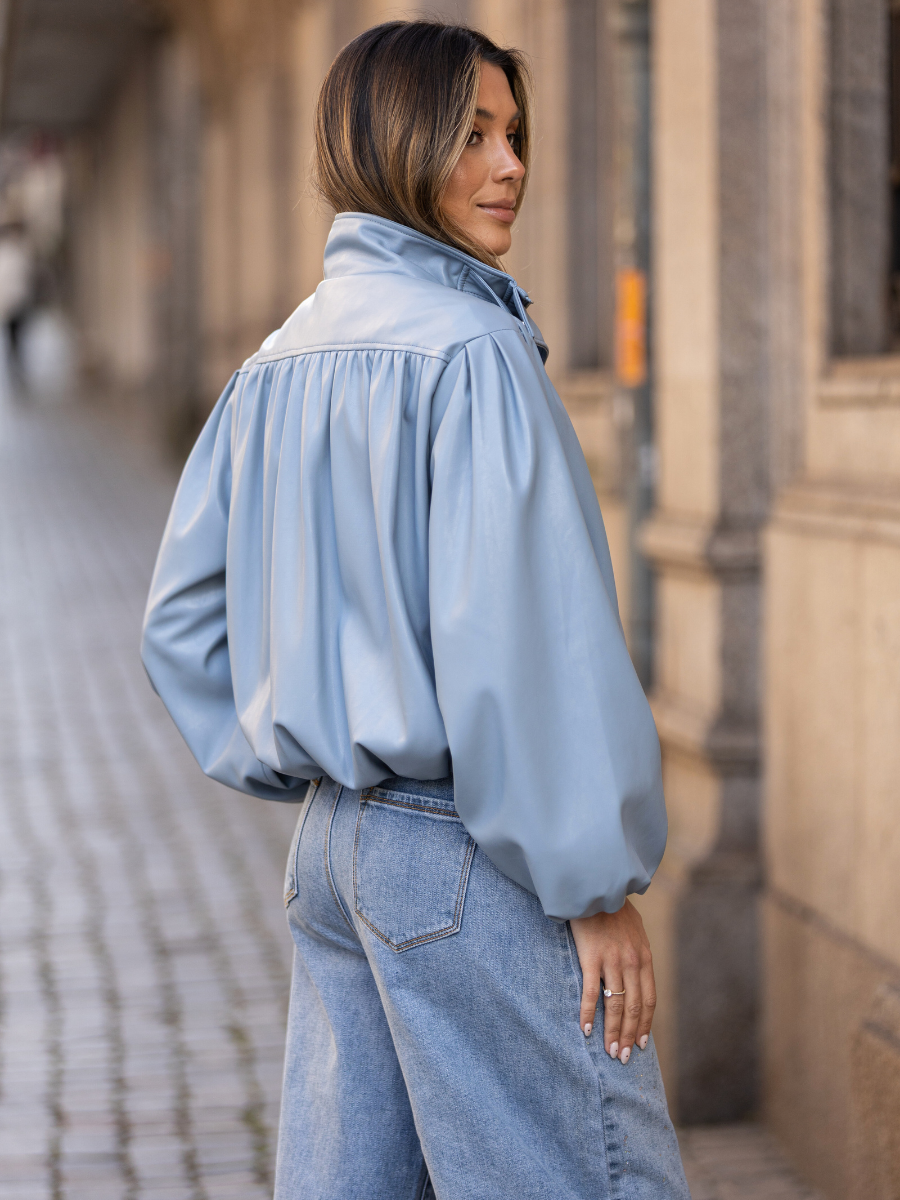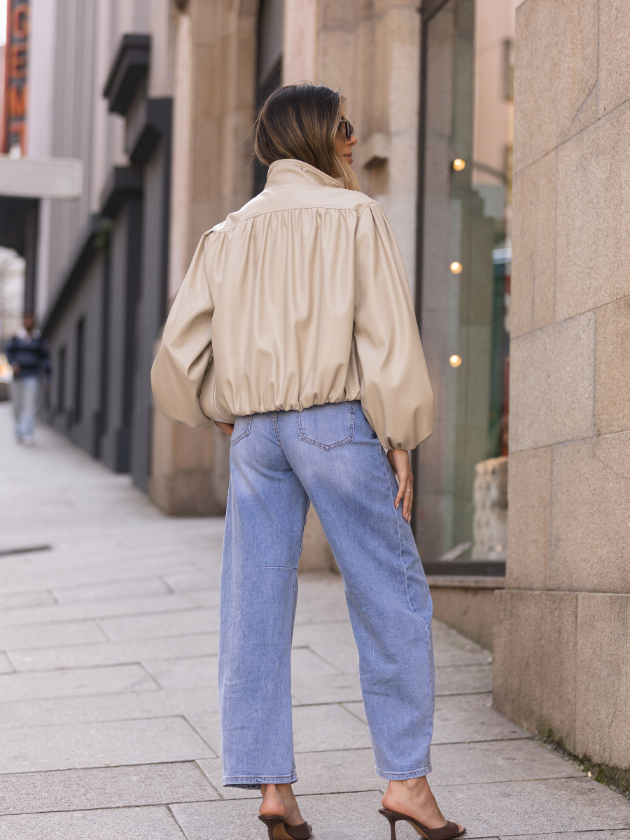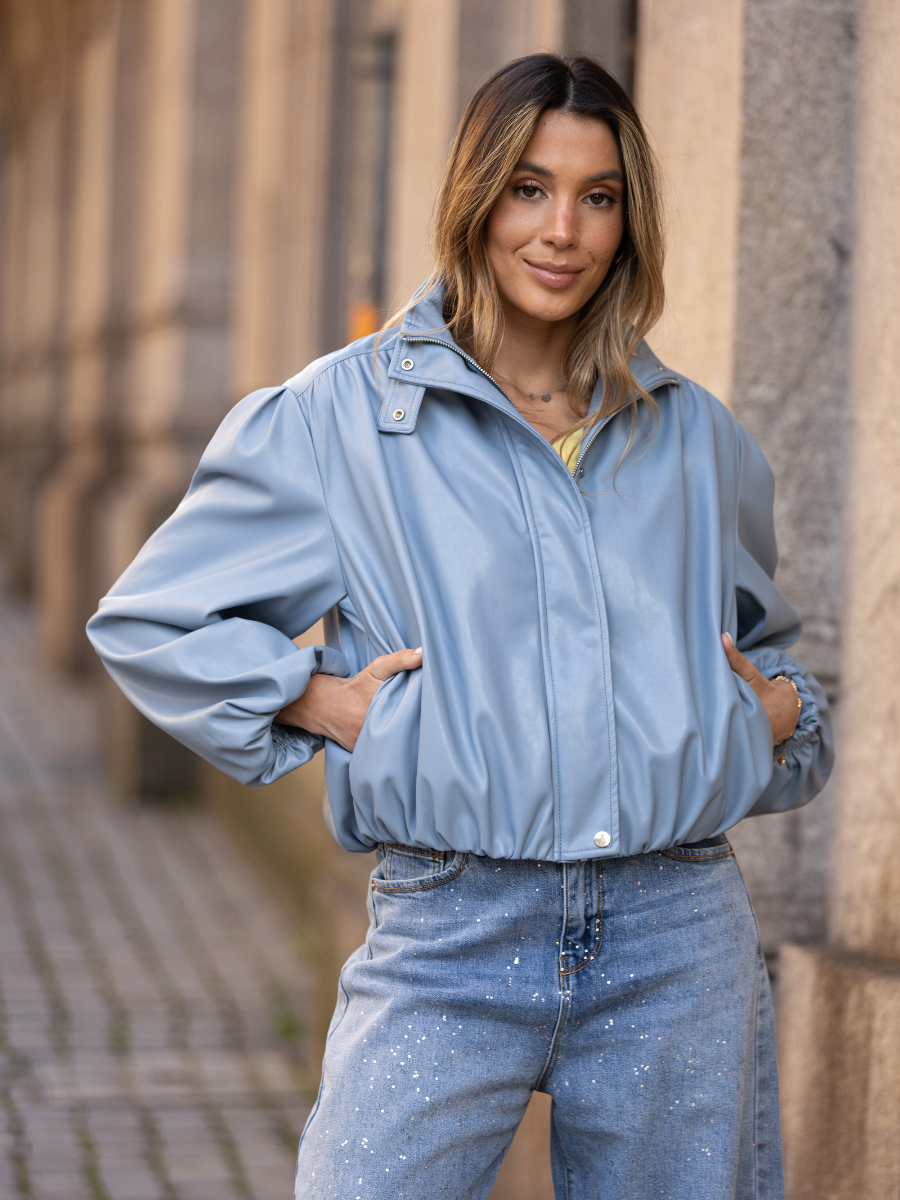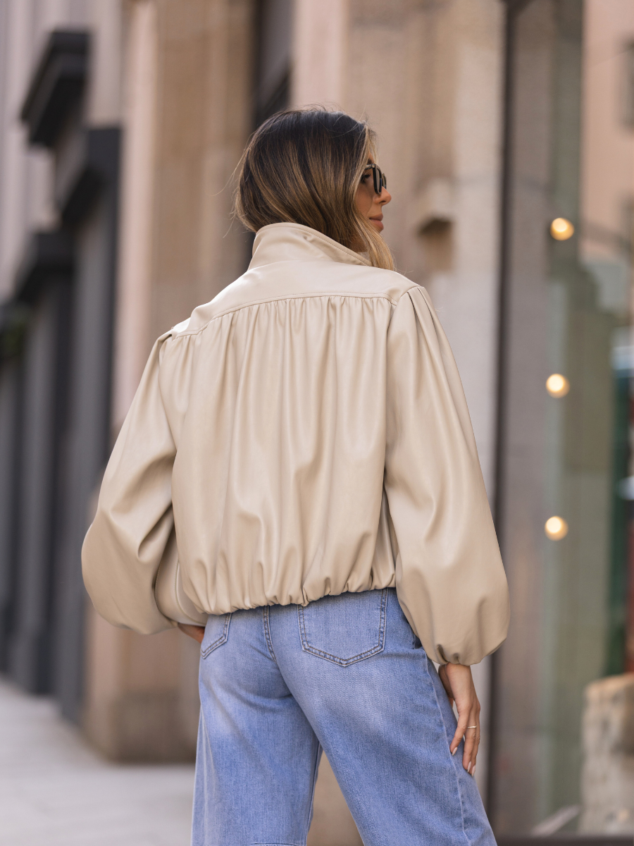 Casaco de efeito pele com corte curto e silhueta ampla. Confeccionado em material suave com acabamento ligeiramente acetinado, destaca-se pelo volume nas mangas e estrutura franzida que cria um look moderno e sofisticado. O design inclui gola subida e fecho frontal, tornando-o ideal para complementar outfits urbanos com um toque contemporâneo.