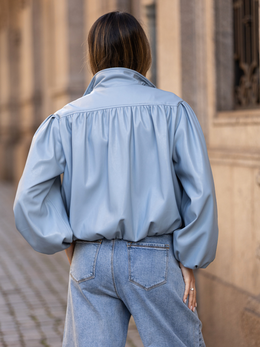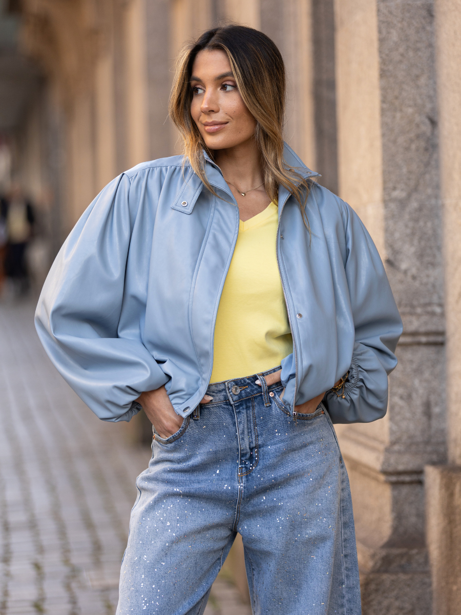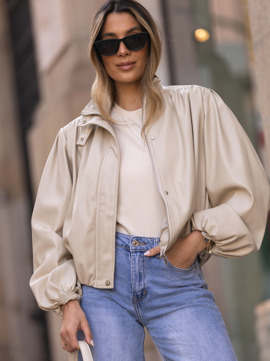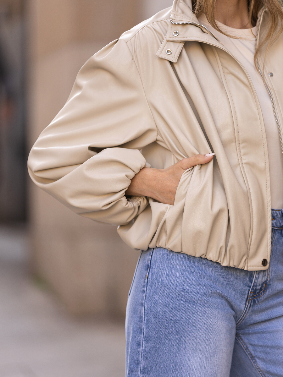 Casaco de efeito pele com corte curto e silhueta ampla. Confeccionado em material suave com acabamento ligeiramente acetinado, destaca-se pelo volume nas mangas e estrutura franzida que cria um look moderno e sofisticado. O design inclui gola subida e fecho frontal, tornando-o ideal para complementar outfits urbanos com um toque contemporâneo.