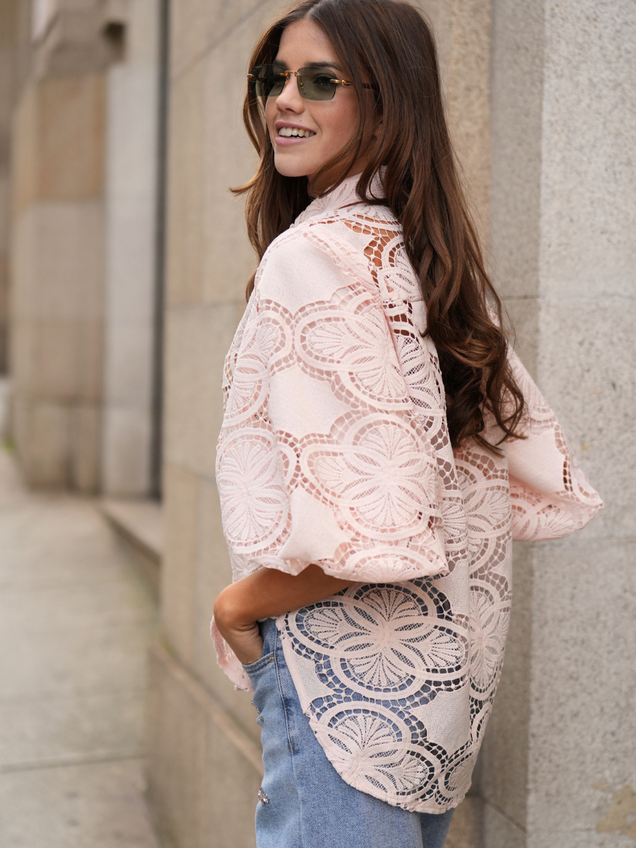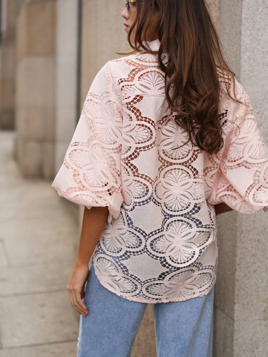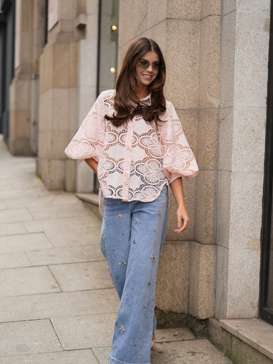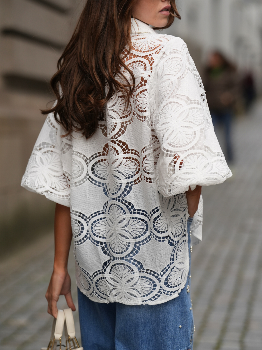 Blusa em renda com padrão floral e transparência delicada, ideal para looks femininos e sofisticados. O corte solto e as mangas amplas conferem leveza e movimento à peça.
