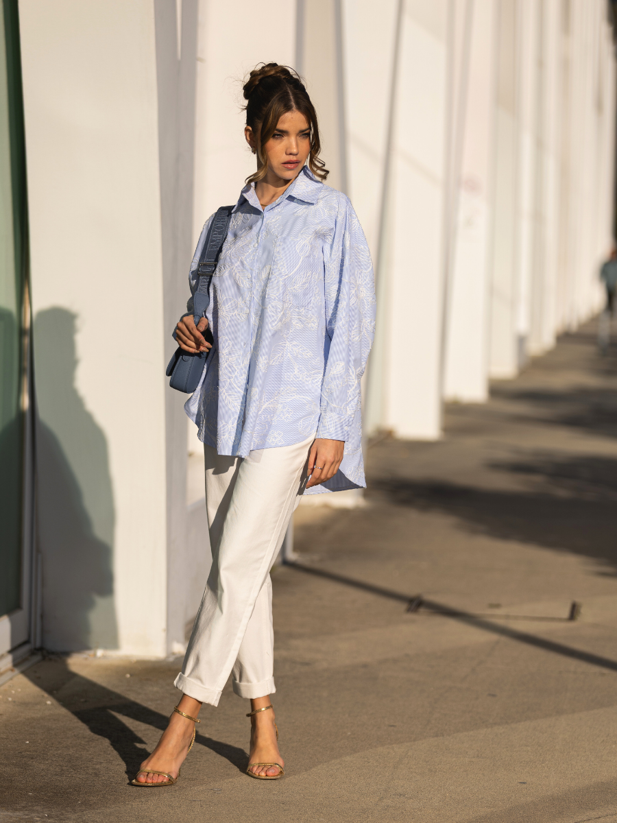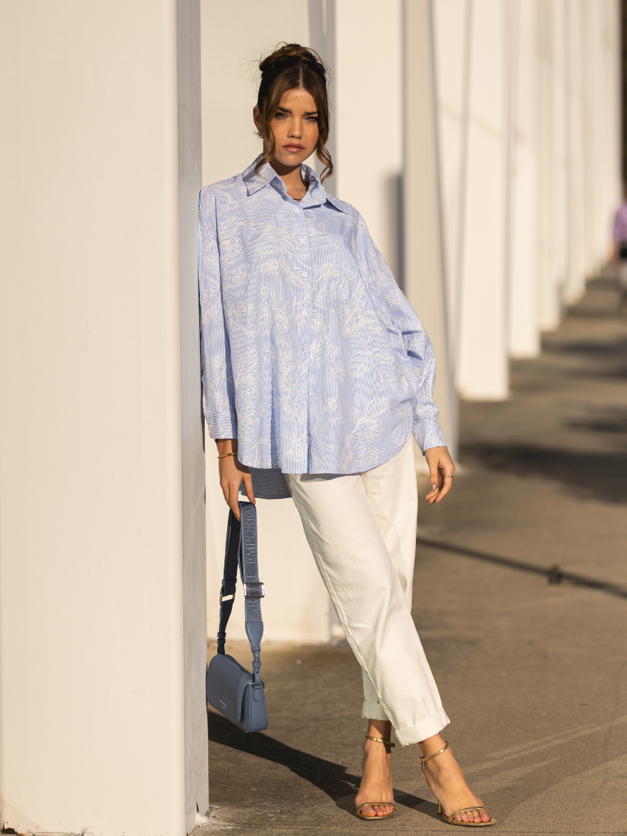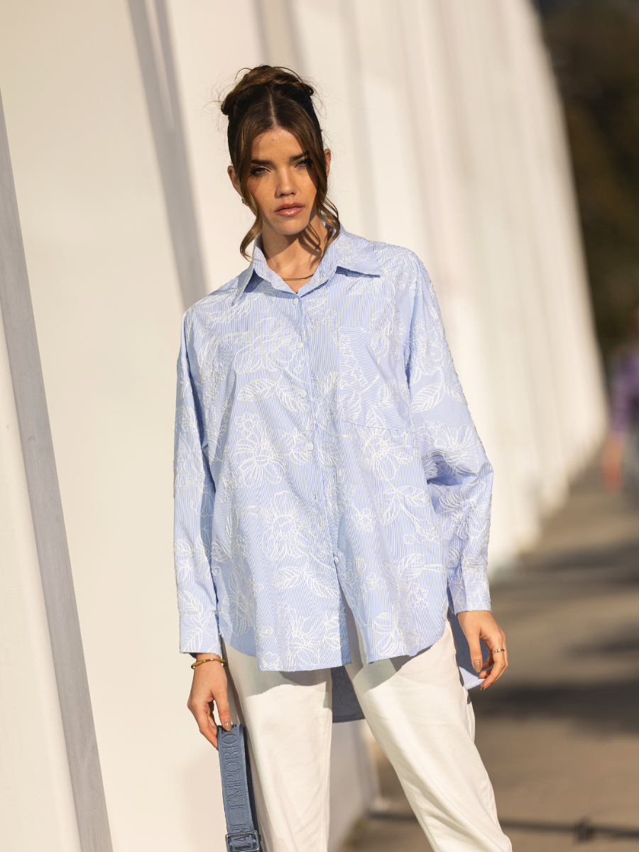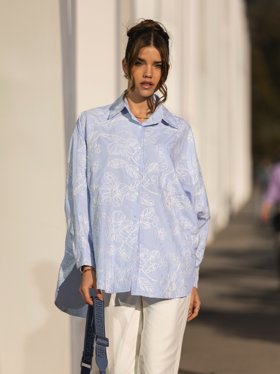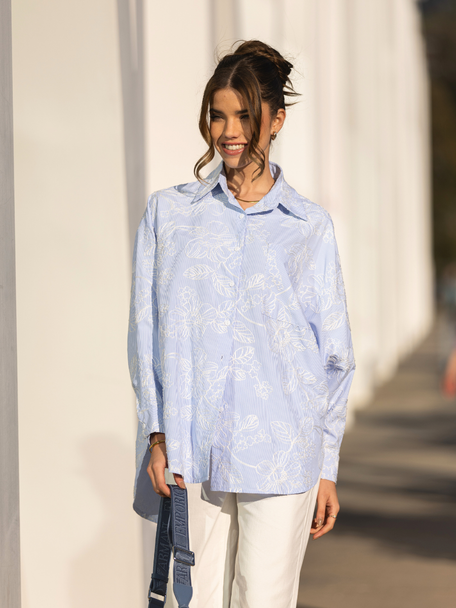 Camisa oversized em tecido leve de algodão com padrão de riscas finas azuis e brancas. Modelo de manga comprida com punho abotoado, gola clássica e carcela com botões à frente. Destaque para o delicado bordado floral branco em toda a peça, que adiciona textura e sofisticação ao visual. Corte fluído e comprimento alongado, ideal para um look casual chic ou para contrastar com peças mais estruturadas. Pode ser usada solta ou com nó na frente para um estilo descontraído.