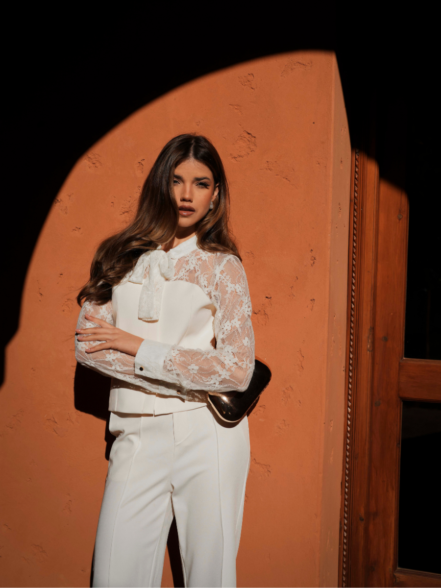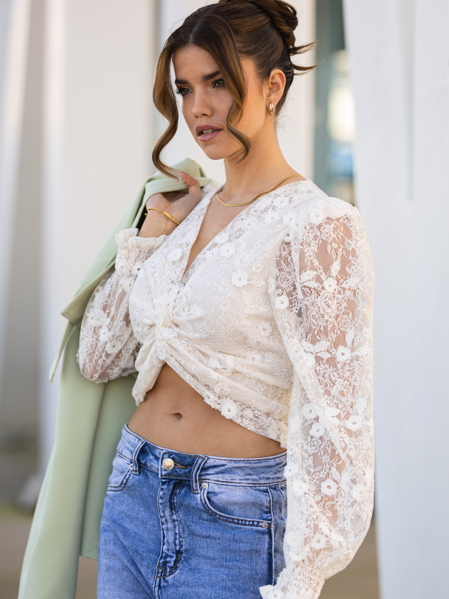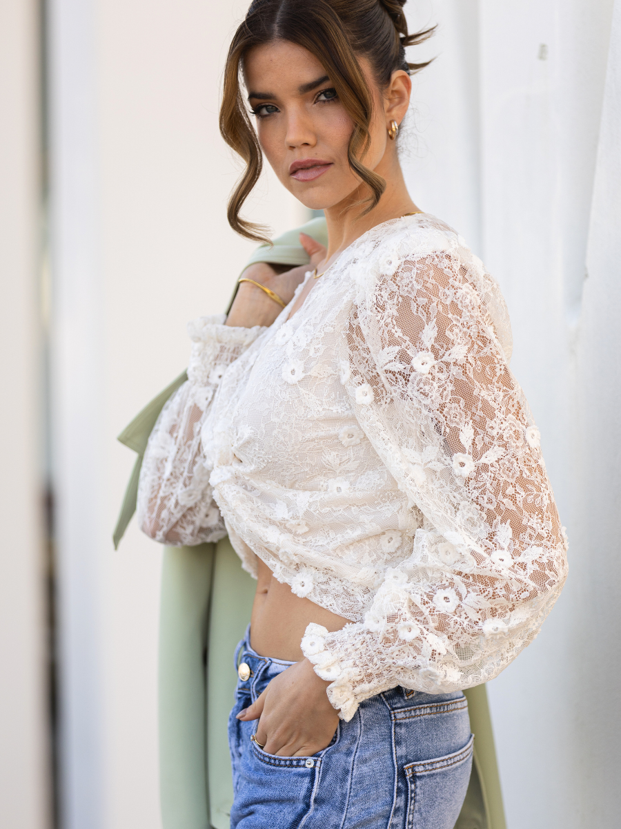 Top curto em renda floral branca. Modelo de manga comprida com ligeiro volume e punhos elásticos com folho. Decote em V com torção frontal que realça a zona da cintura. Tecido semi-transparente em renda com bordado floral em relevo e aplicações discretas.