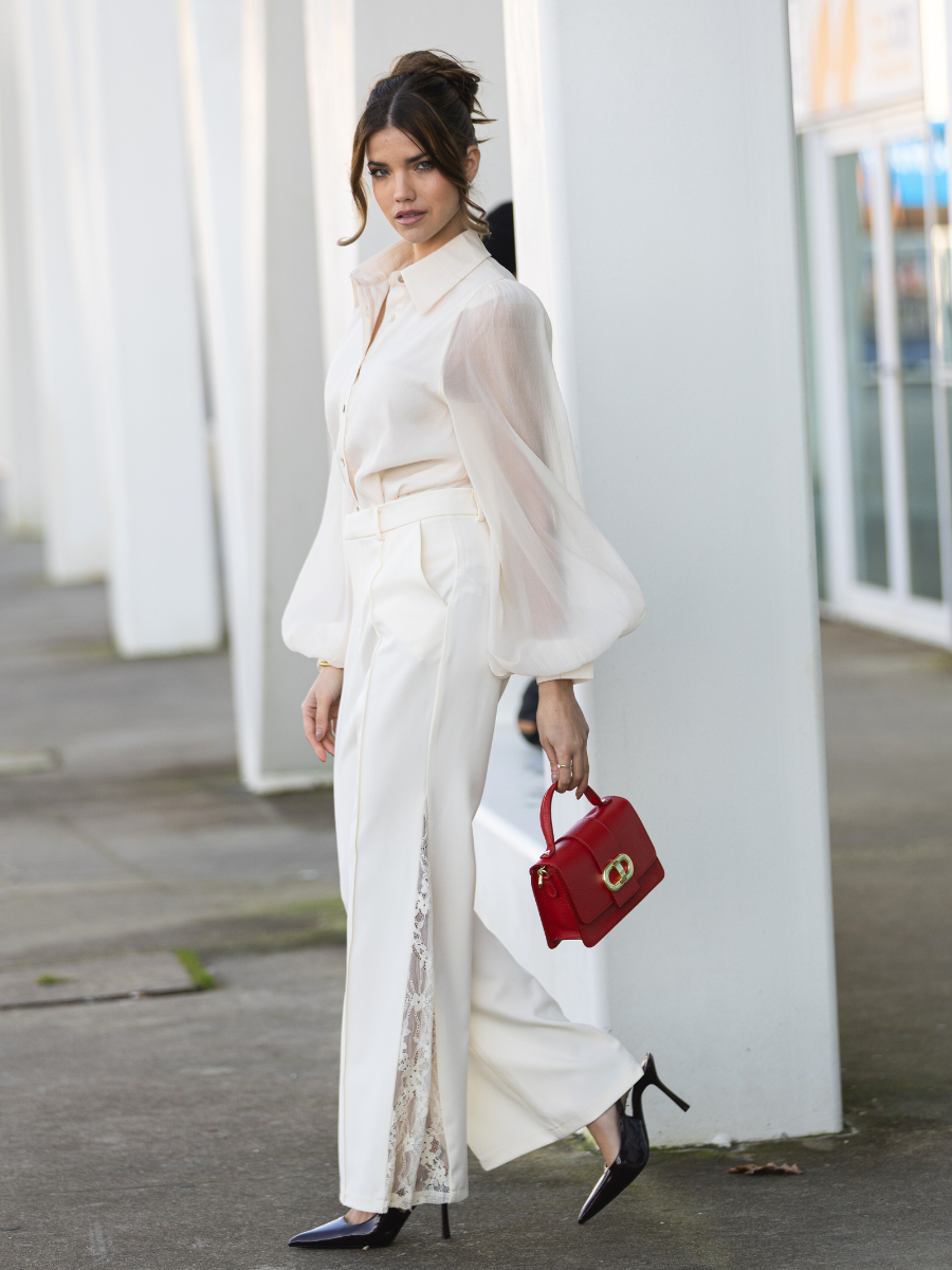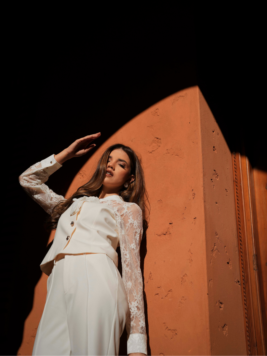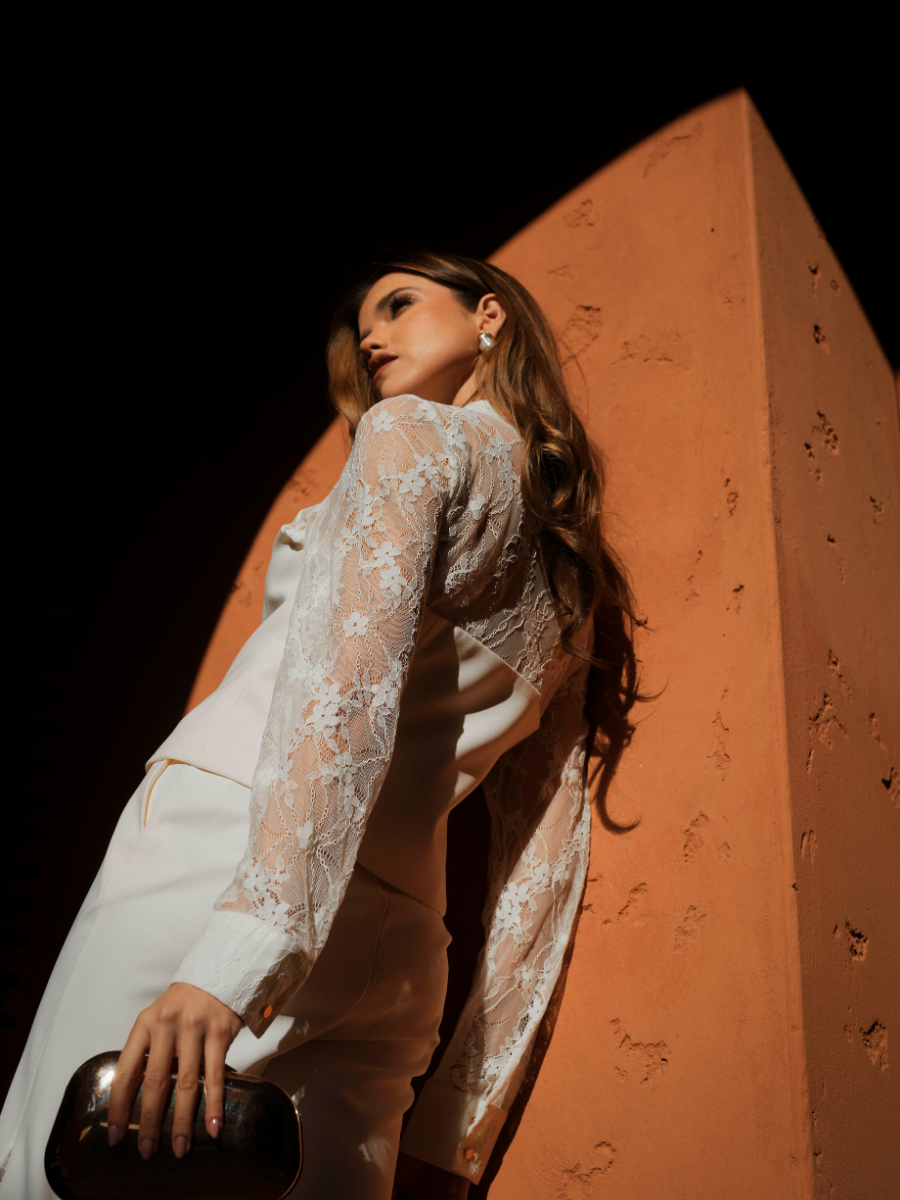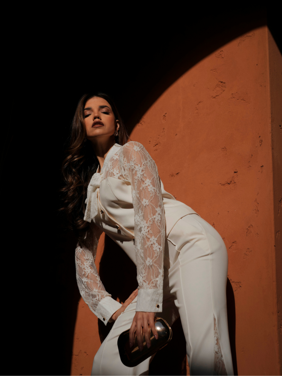 Top curto em renda floral branca. Modelo de manga comprida com ligeiro volume e punhos elásticos com folho. Decote em V com torção frontal que realça a zona da cintura. Tecido semi-transparente em renda com bordado floral em relevo e aplicações discretas.