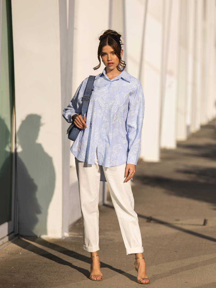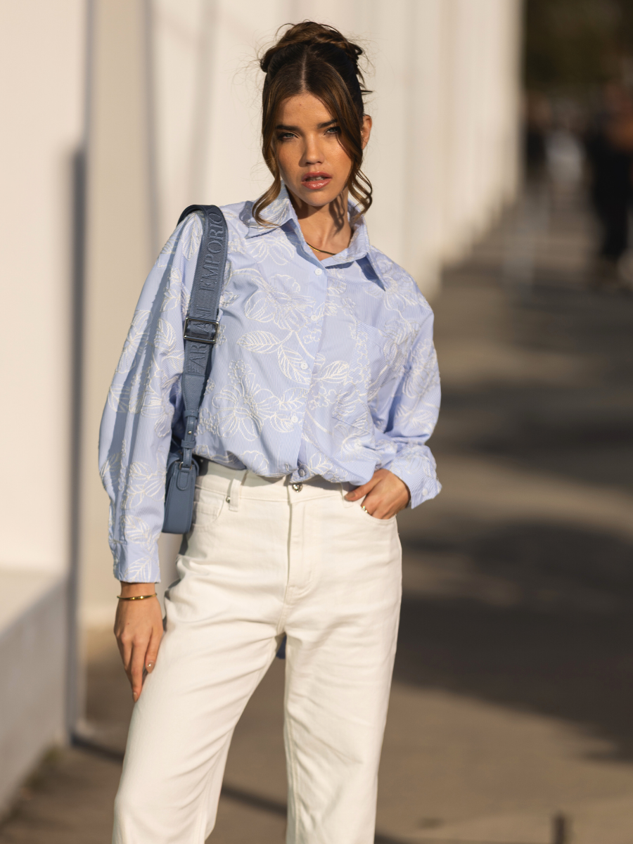 Camisa Azul com Bordado Floral Branco