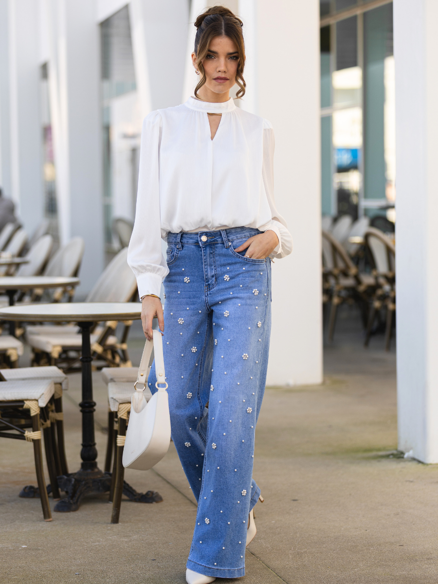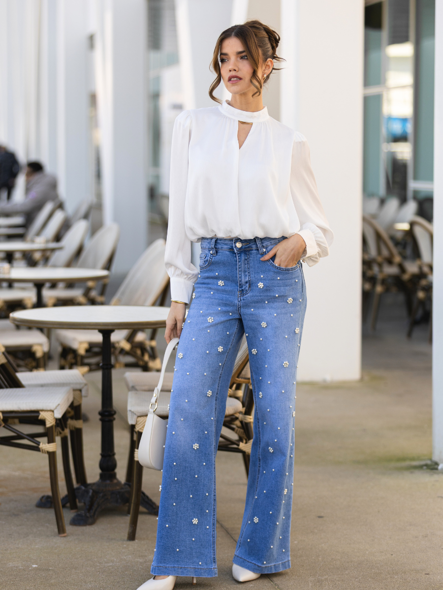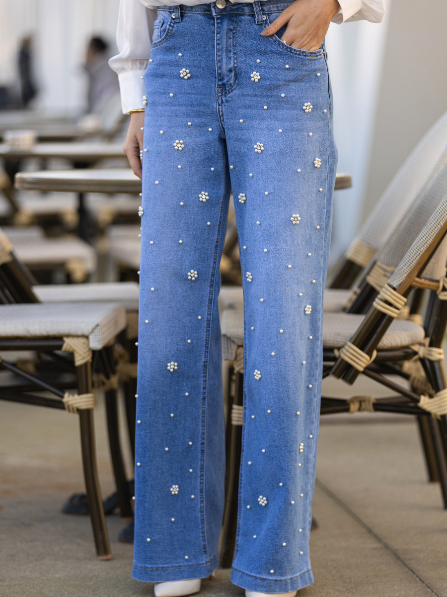 Jeans de cintura subida em ganga azul média, com corte reto e comprimento até ao tornozelo. Detalhe de aplicações de pérolas pequenas e agrupadas em forma de flor, distribuídas ao longo de toda a peça — à frente, nas laterais e parte de trás — criando um padrão delicado e sofisticado. Bainha simples e discreta. Bolsos frontais e traseiros funcionais. Fecha com botão metálico e fecho de correr.