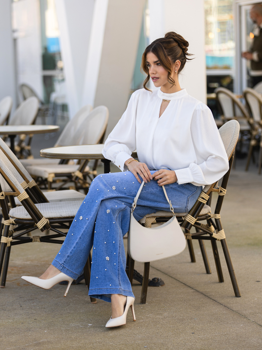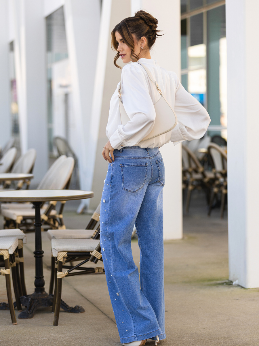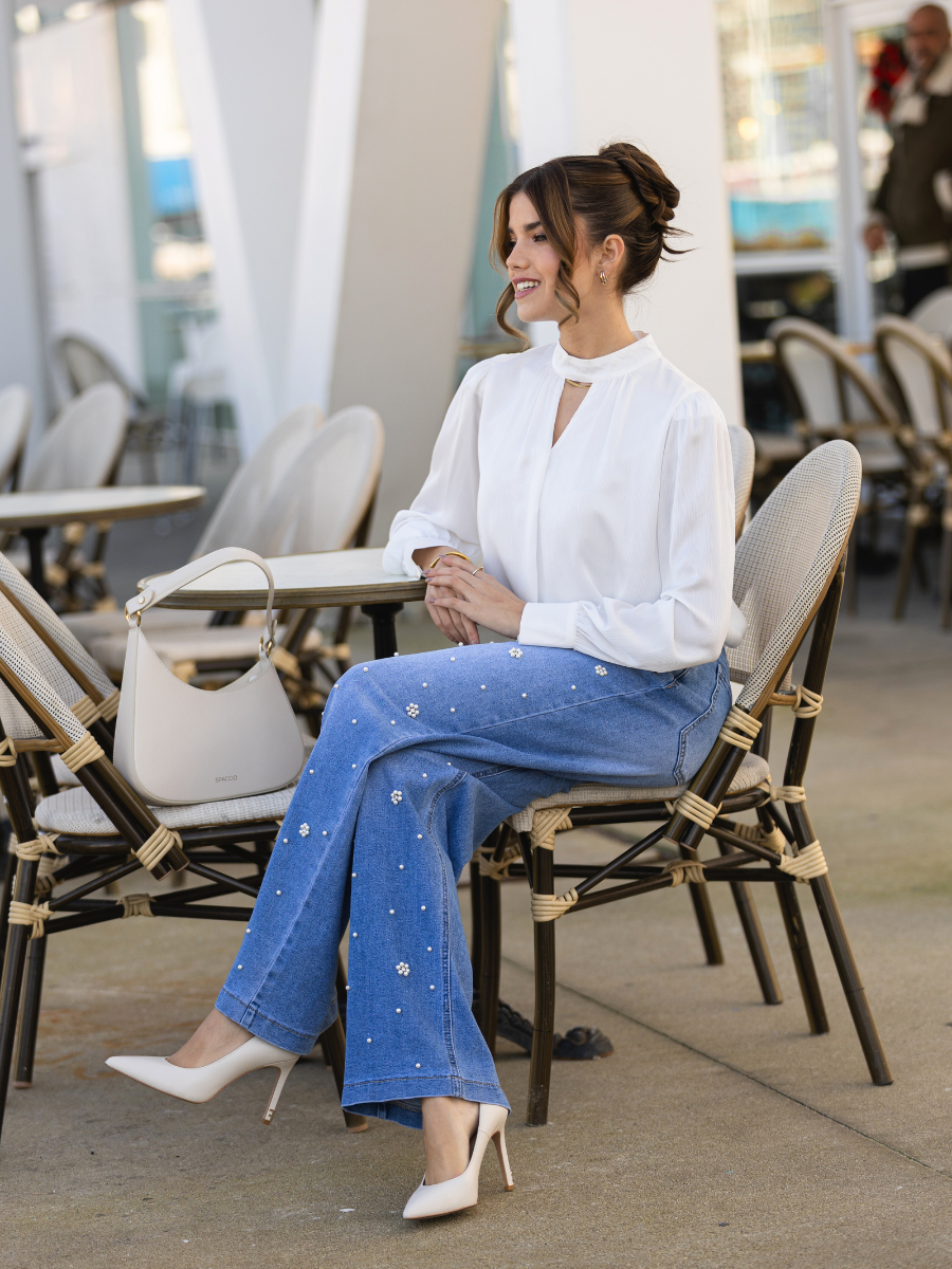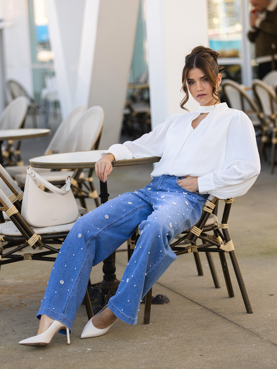 Jeans de cintura subida em ganga azul média, com corte reto e comprimento até ao tornozelo. Detalhe de aplicações de pérolas pequenas e agrupadas em forma de flor, distribuídas ao longo de toda a peça — à frente, nas laterais e parte de trás — criando um padrão delicado e sofisticado. Bainha simples e discreta. Bolsos frontais e traseiros funcionais. Fecha com botão metálico e fecho de correr.