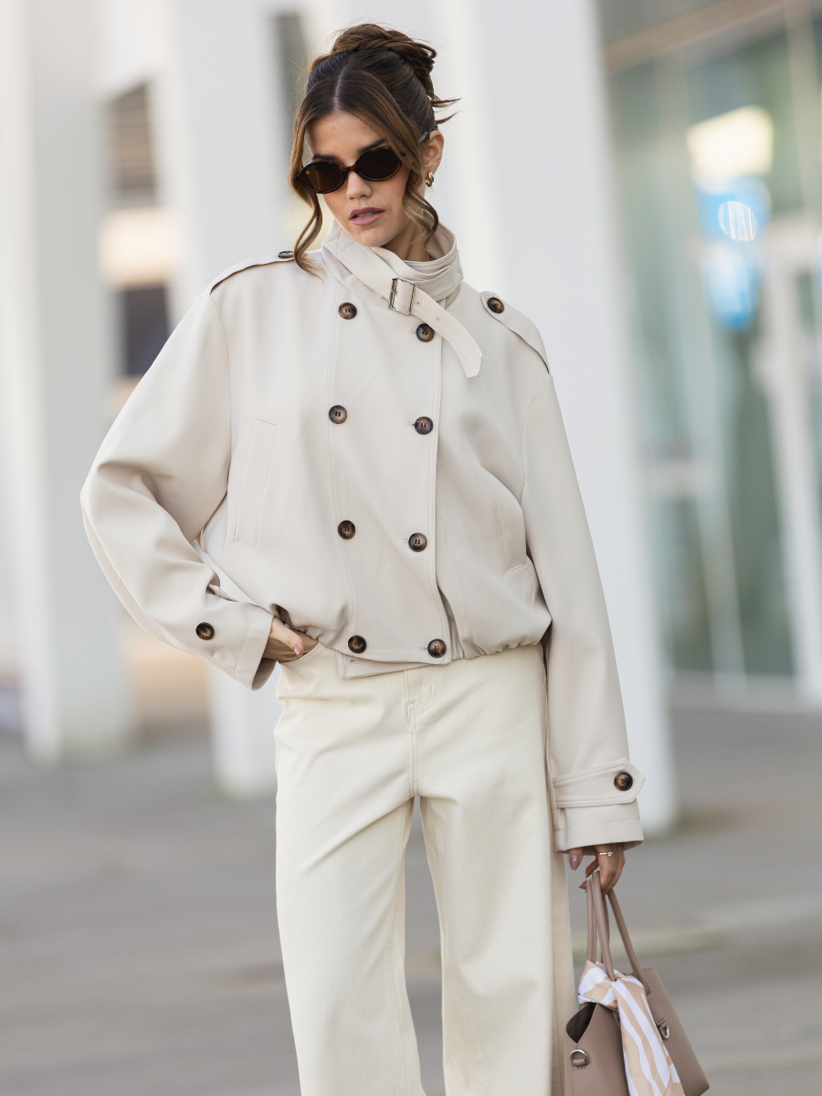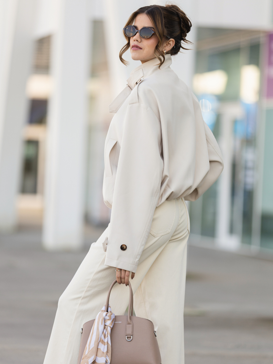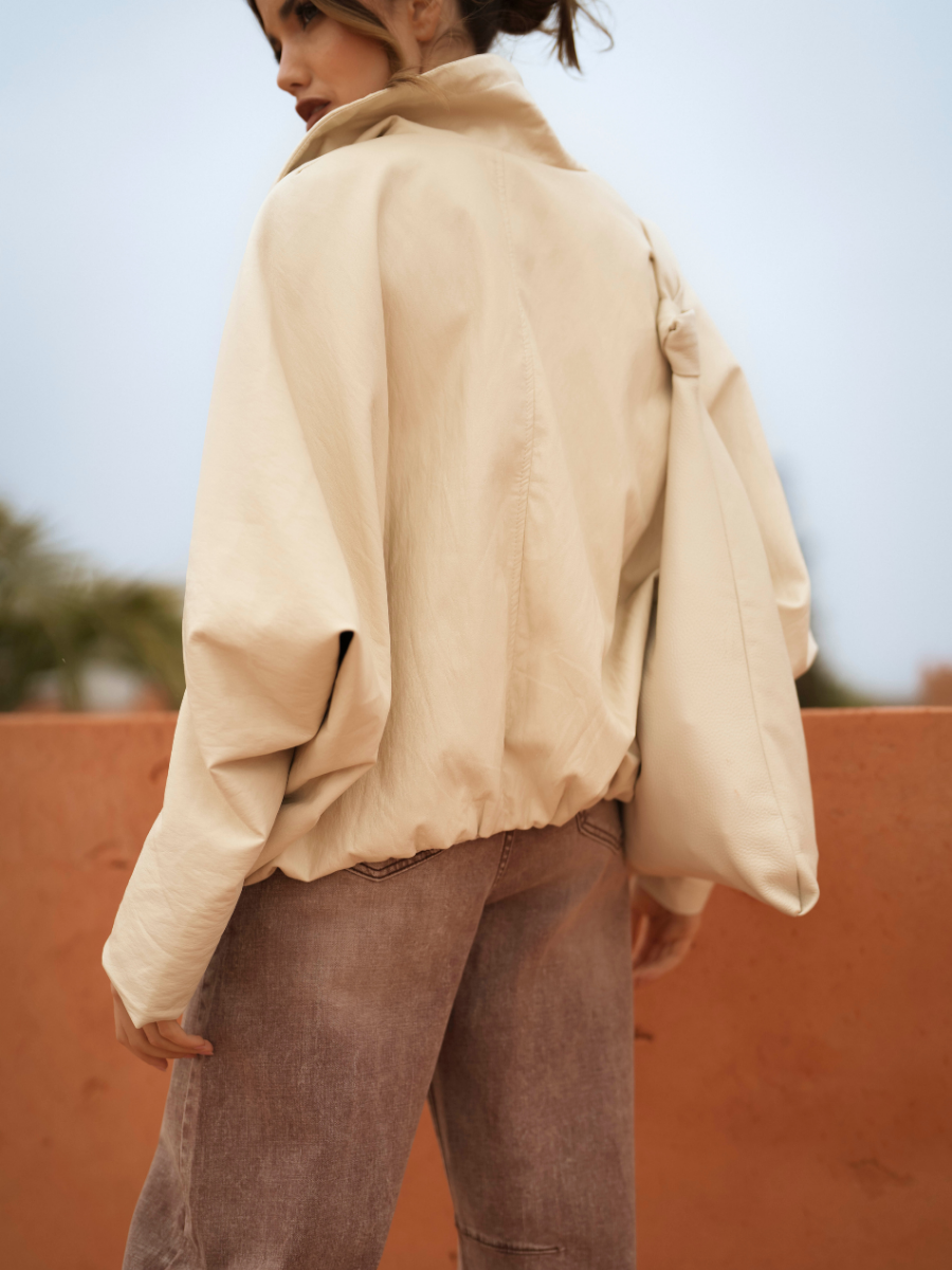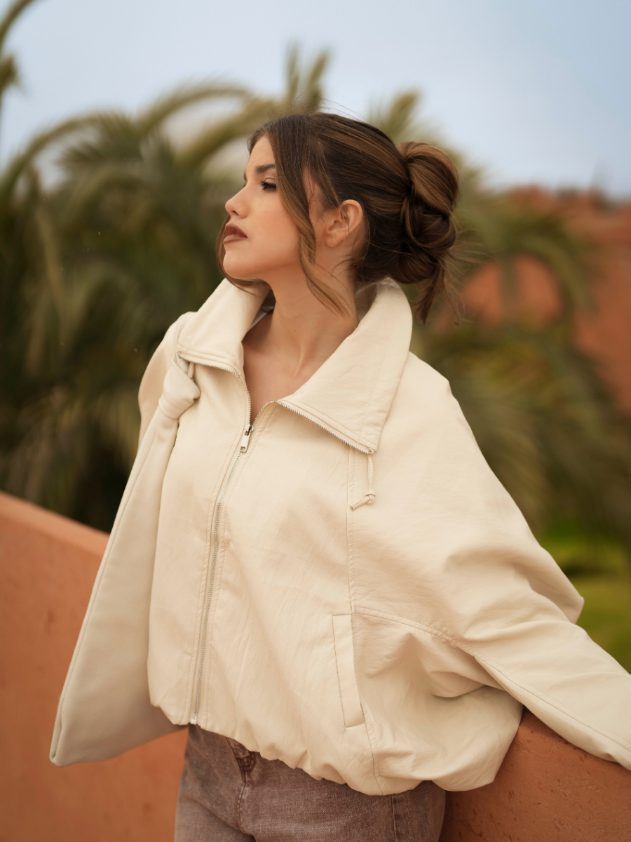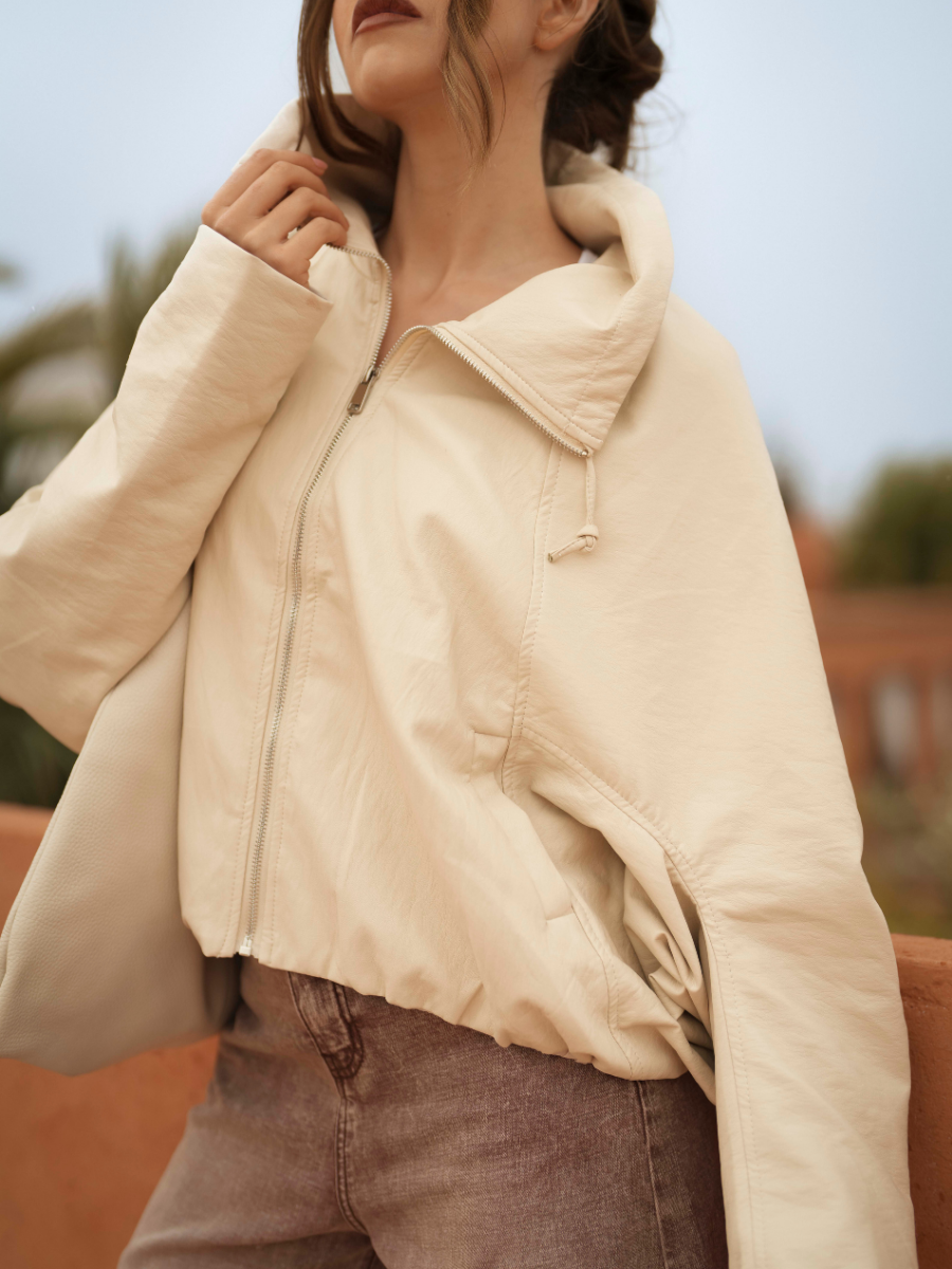 Blusão em tom creme de design oversized com textura leve e acabamento subtilmente brilhante. Modelo com gola subida ampla e fecho frontal em zip, que confere um toque moderno e descontraído à peça. Apresenta mangas largas com efeito morcego e punhos ajustados, além de bolsos laterais discretos. O tecido maleável e de aspeto acetinado proporciona conforto e estilo numa só peça. Ideal para coordenados casuais ou para elevar looks de fim de semana com um toque urbano.