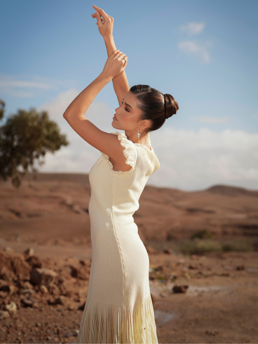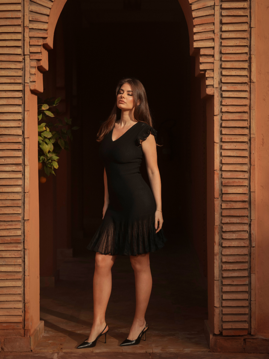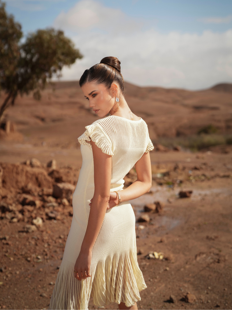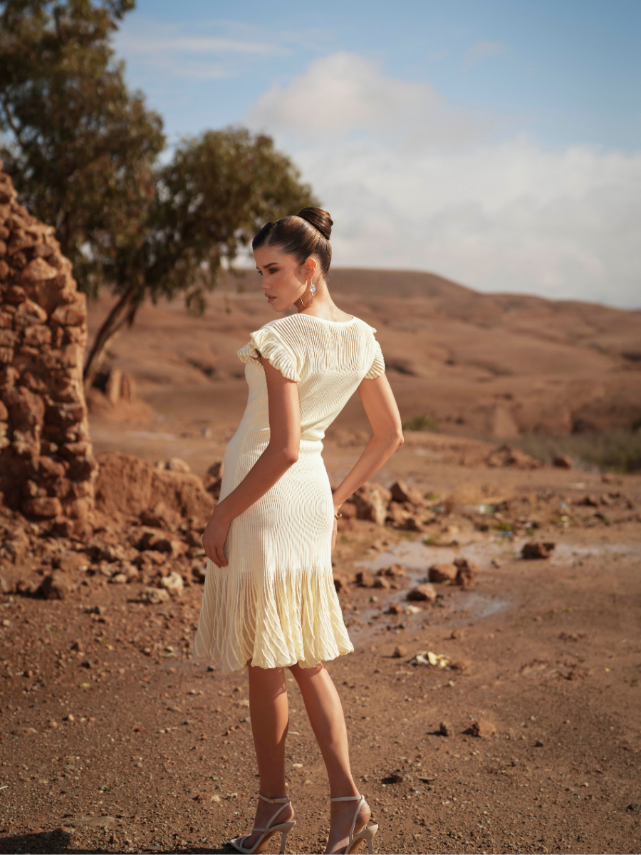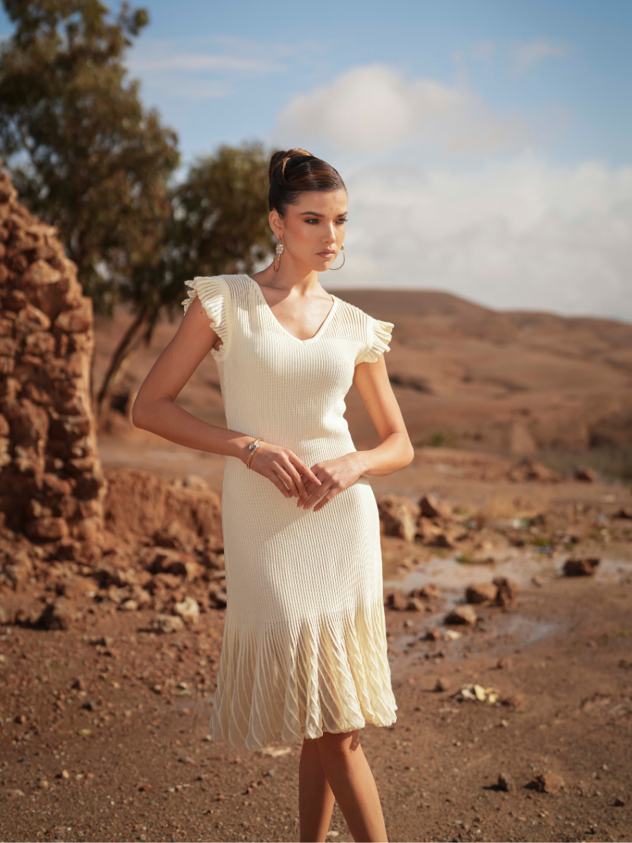 Vestido em malha com decote em V e alças largas decoradas com delicados folhos plissados. Silhueta ajustada ao corpo, com saia evasé e acabamento ondulado em plissado leve. O contraste de texturas entre a malha canelada e a fluidez da saia cria um efeito visual marcante. Perfeito para ocasiões especiais ou para elevar os looks do dia a dia com um toque sofisticado. Disponível também em amarelo claro.
