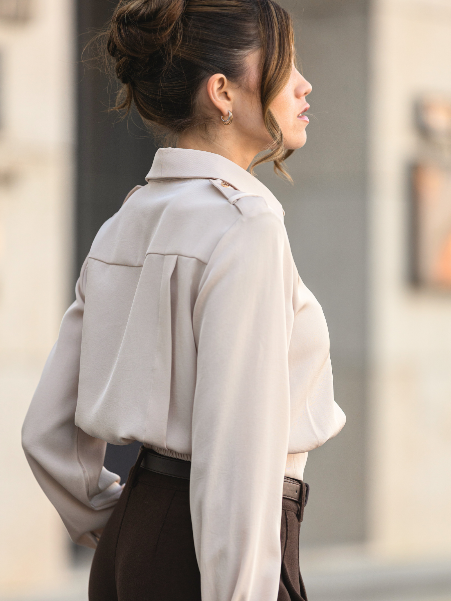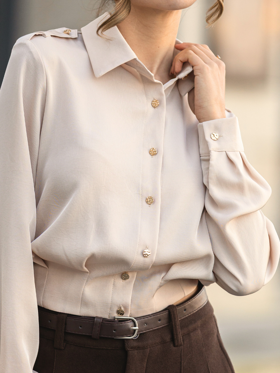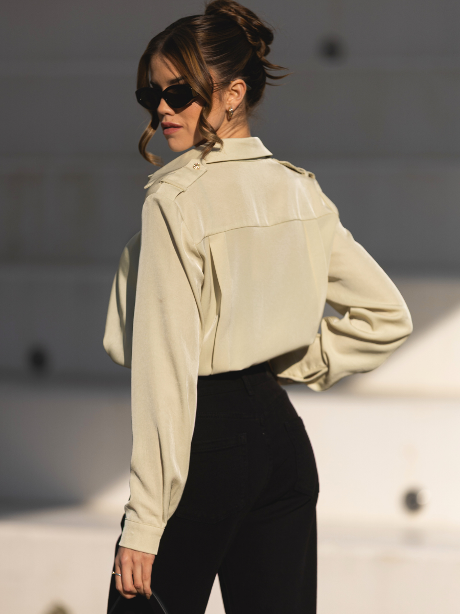 Camisa fluida de manga comprida, com corte ligeiramente cintado e pinças que definem a silhueta. Modelo com gola clássica, carcela com botões dourados texturizados e detalhes de abas com botão nos ombros tipo ombreiras decorativas. Bainha ligeiramente curta e punhos com botão. O tecido suave e acetinado confere um toque elegante ao look. Disponível em bege claro e verde seco.