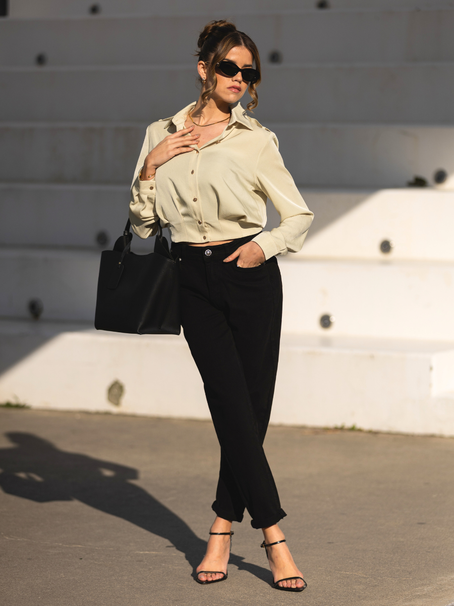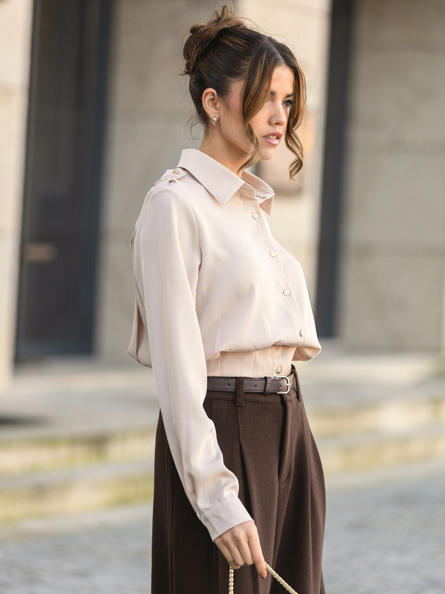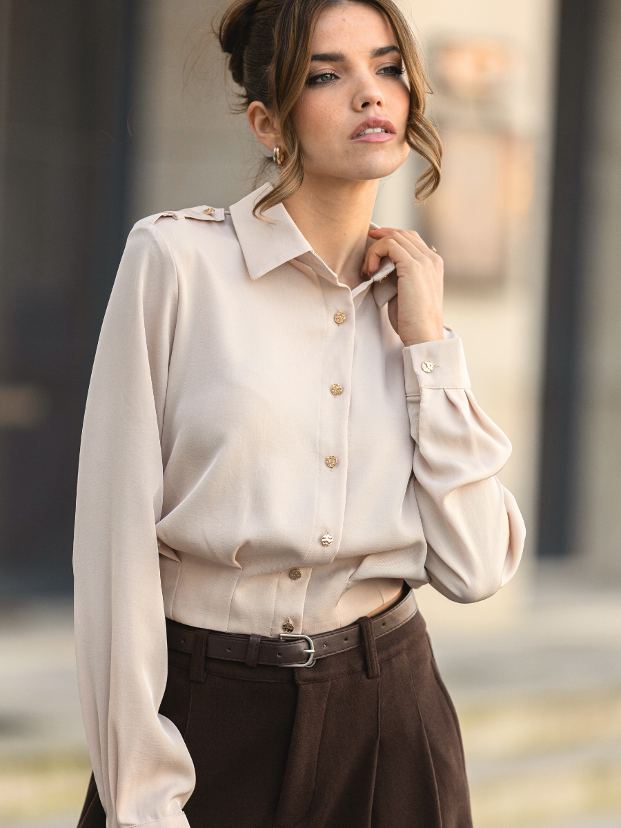 Camisa fluida com colarinho clássico e presilhas decorativas nos ombros. Modelo de manga comprida com punhos abotoados e corte cintado que valoriza a silhueta. Fecho frontal com botões dourados trabalhados. Um essencial elegante para combinar com jeans, calças de alfaiataria ou saias de cintura subida.
