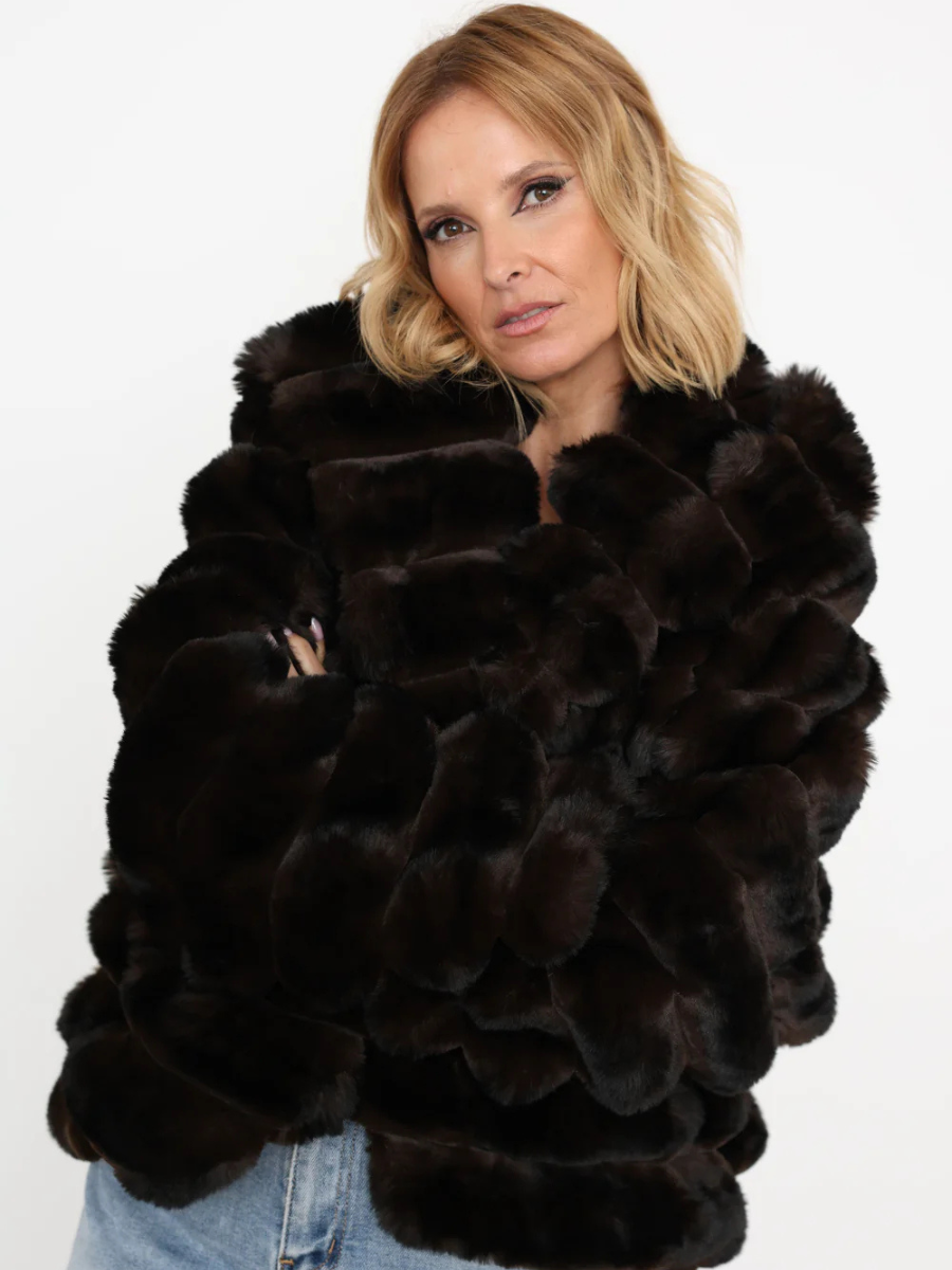 Casaco em pelo sintético com padrão animal print. Gola subida, corte reto e bolsos laterais embutidos. Fecho frontal com colchetes ocultos. Uma peça statement para os dias frios.