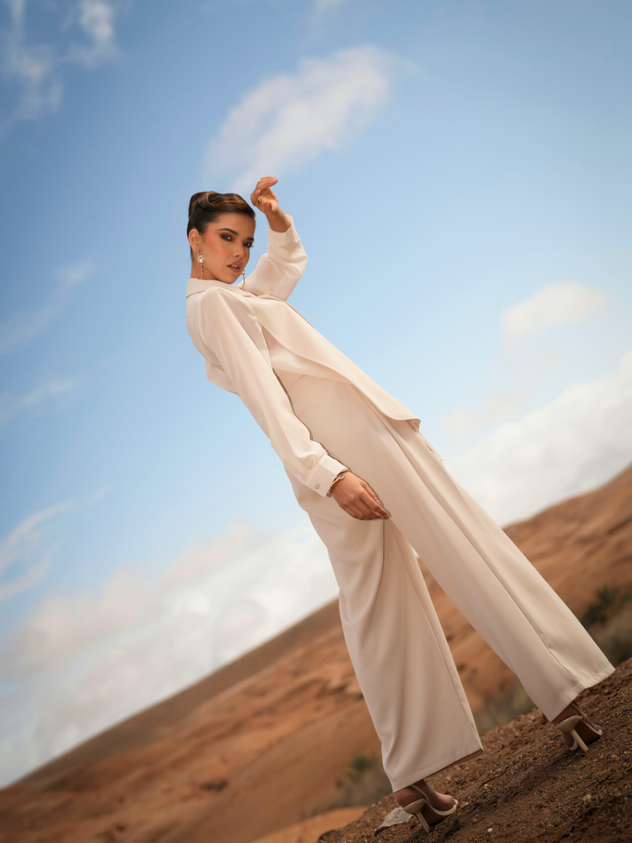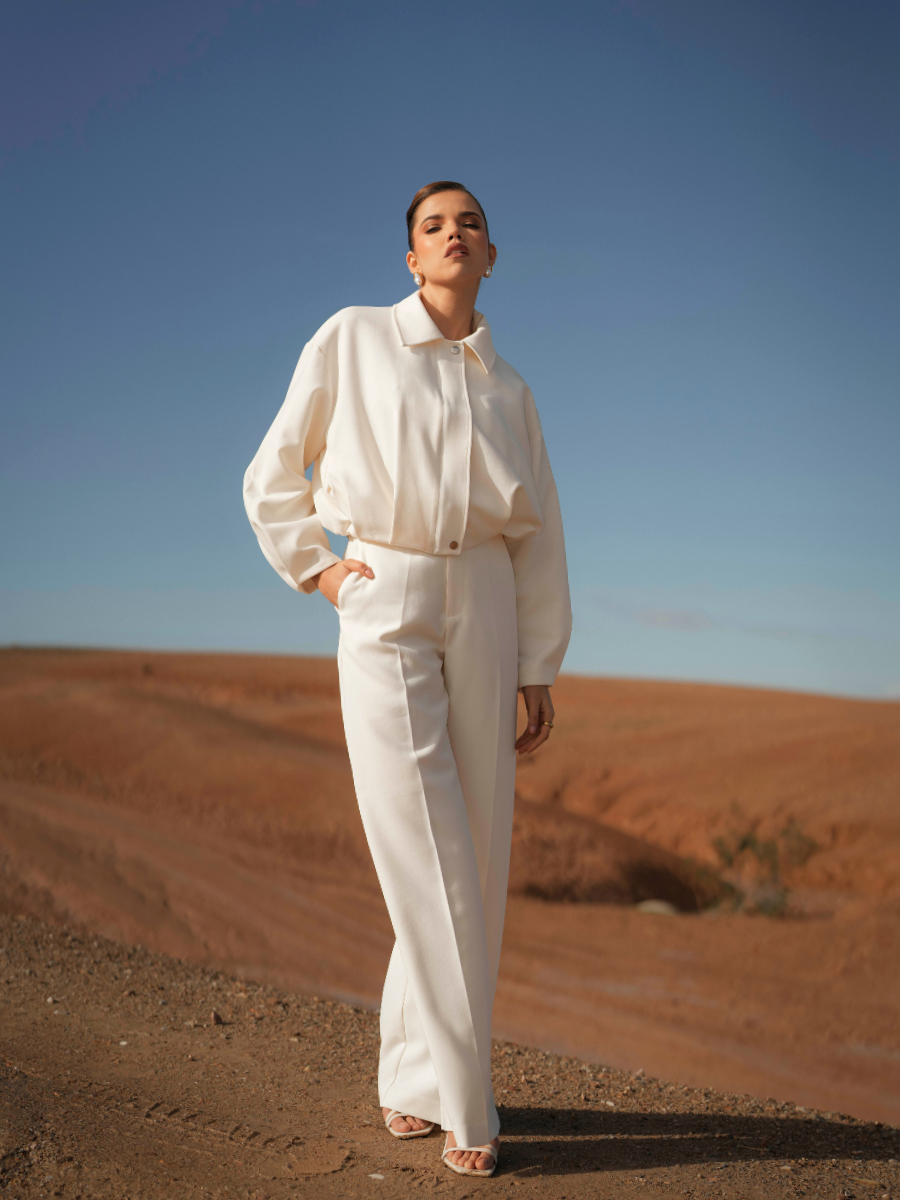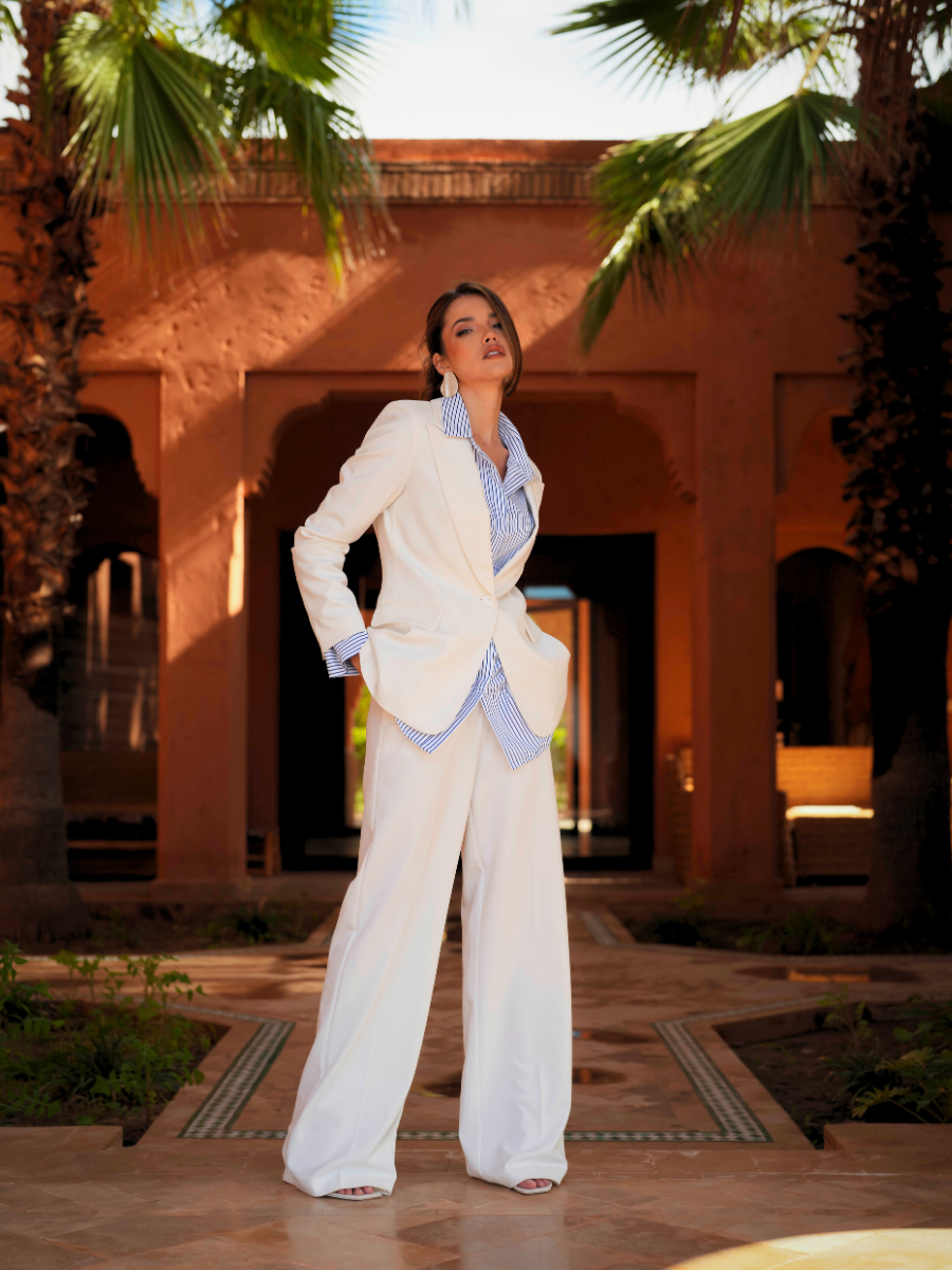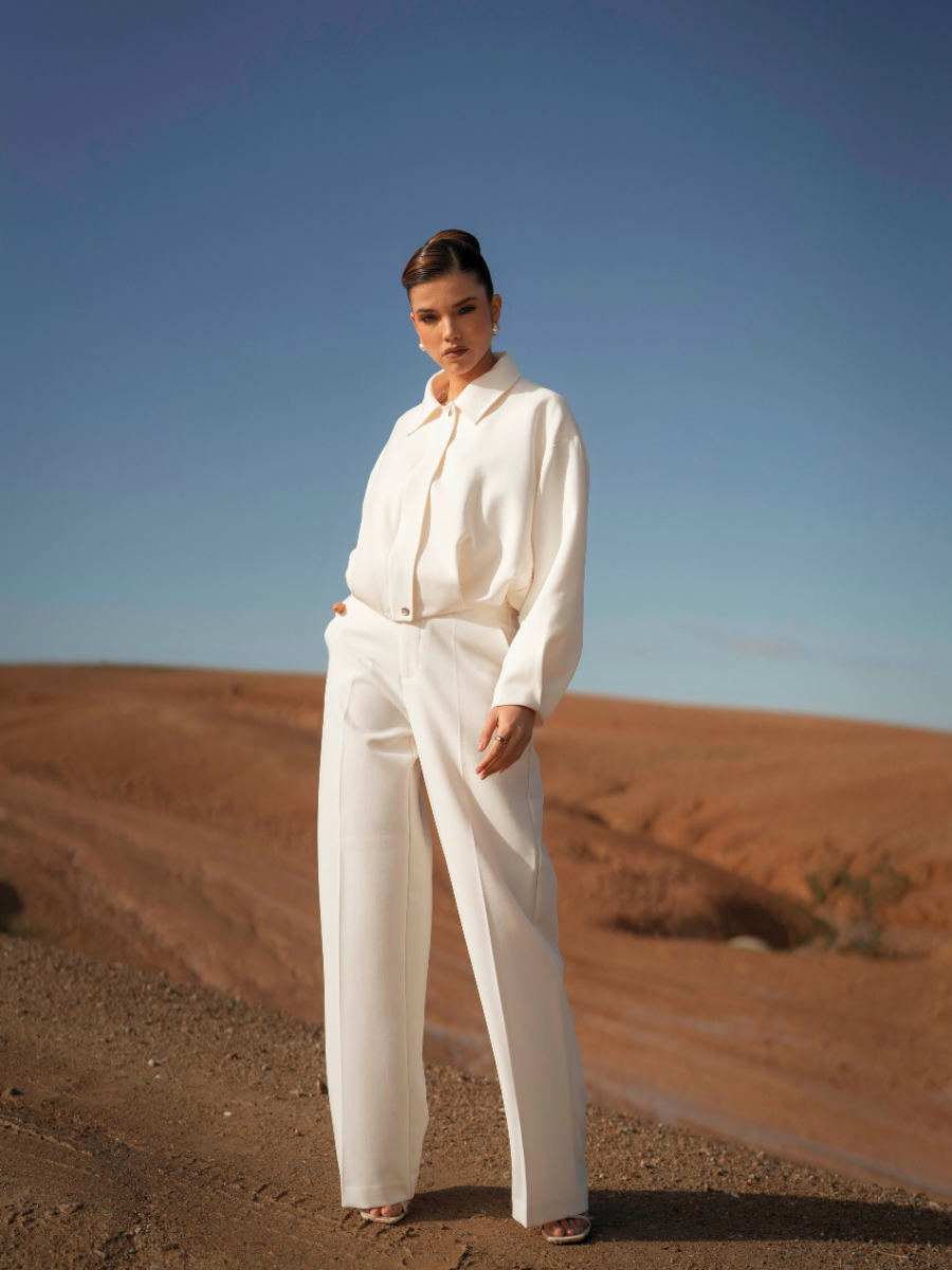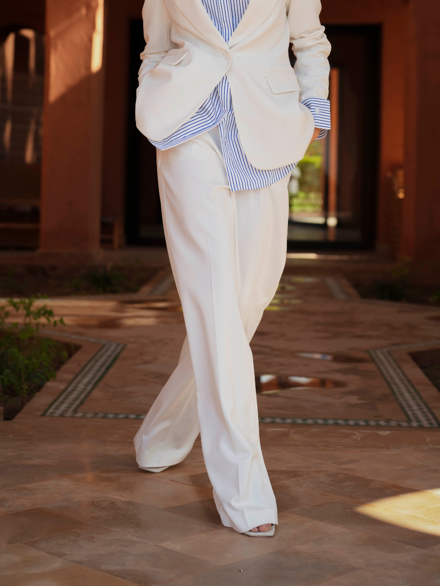 Calças de alfaiataria com cintura subida e perna larga de queda fluida, que alonga visualmente a silhueta. O corte reto e o tecido estruturado garantem conforto e sofisticação, mantendo um visual contemporâneo e intemporal. Ideais para usar em conjunto com o blazer ou separadamente.