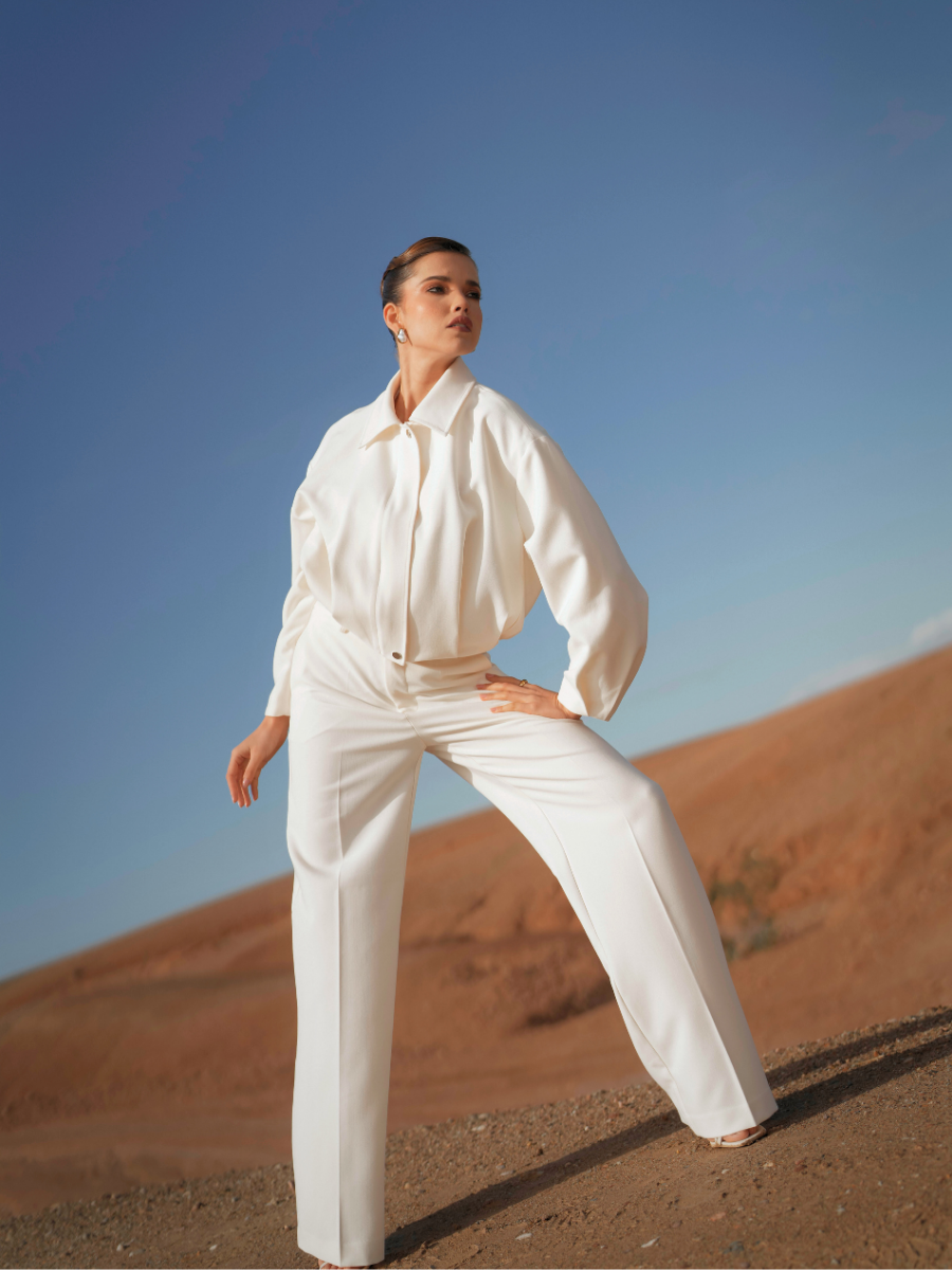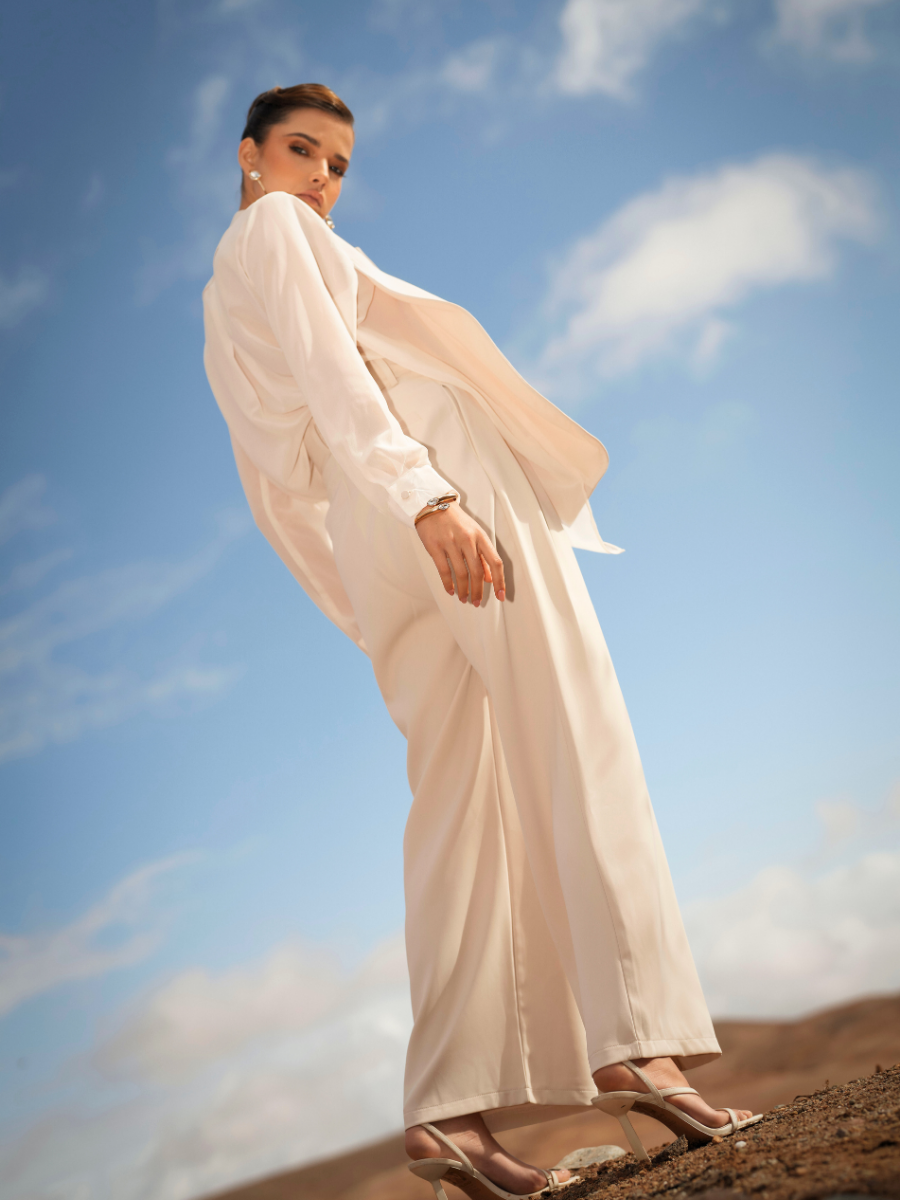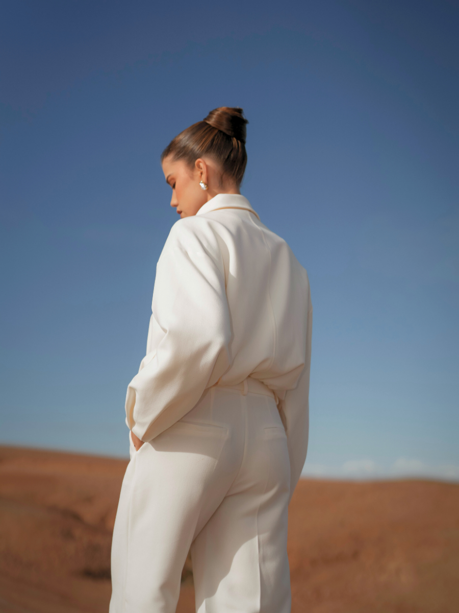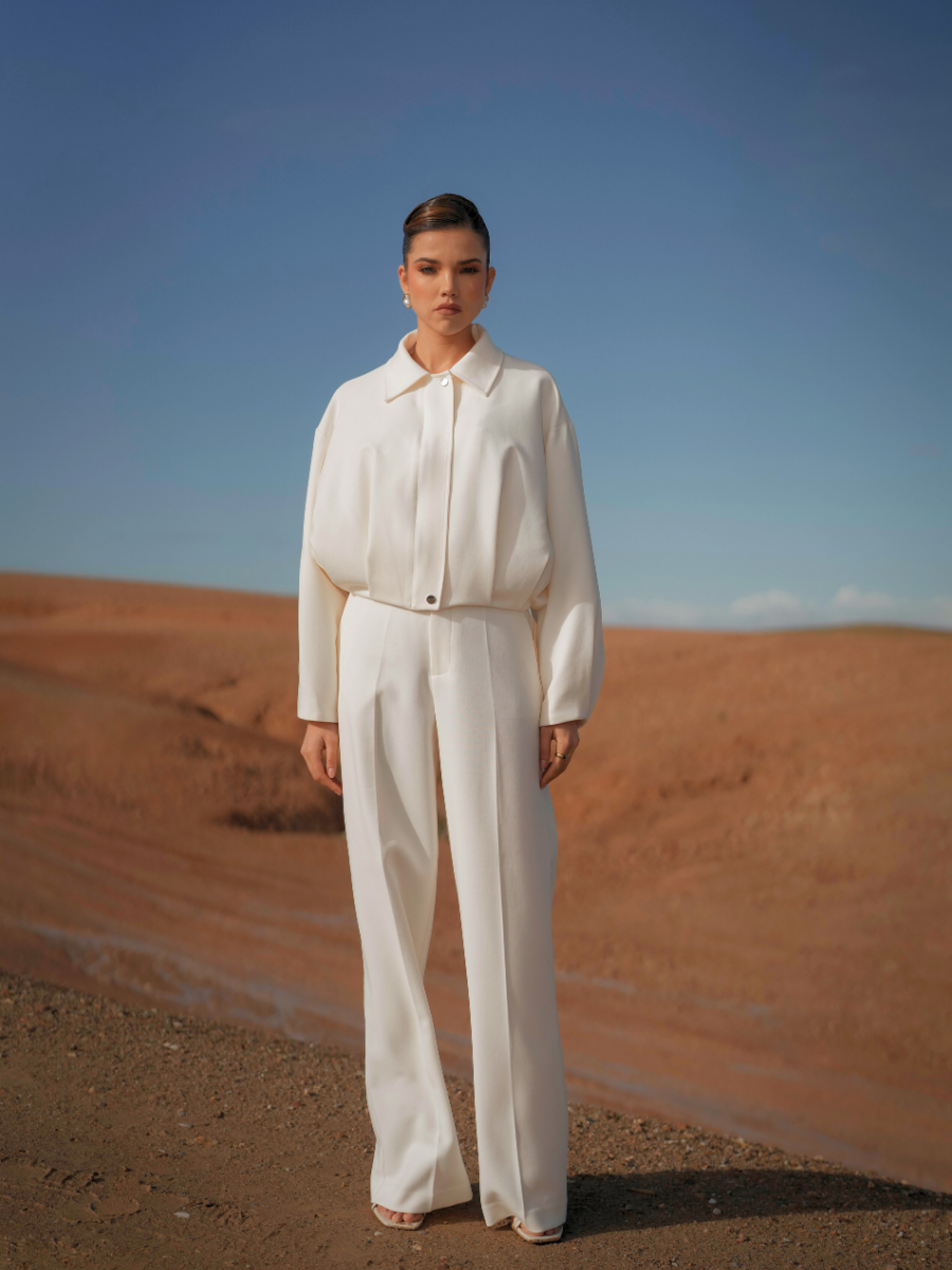 Calças de alfaiataria com cintura subida e perna larga de queda fluida, que alonga visualmente a silhueta. O corte reto e o tecido estruturado garantem conforto e sofisticação, mantendo um visual contemporâneo e intemporal. Ideais para usar em conjunto com o blazer ou separadamente.