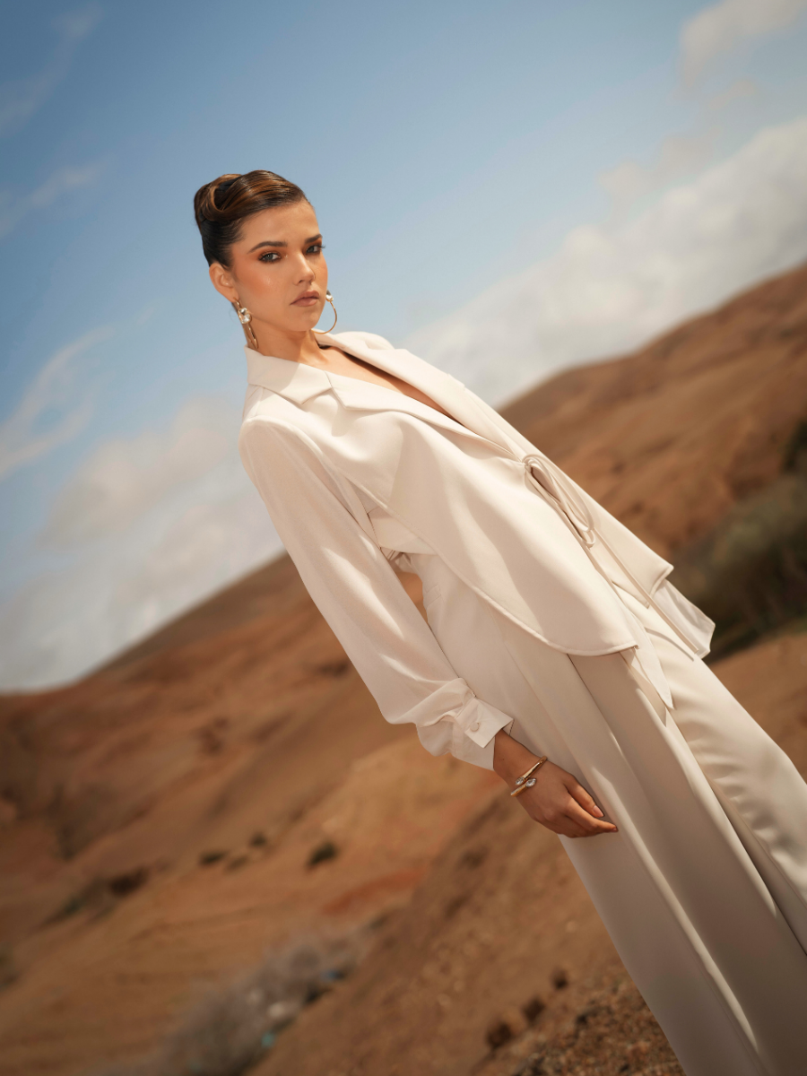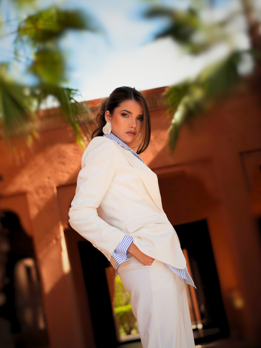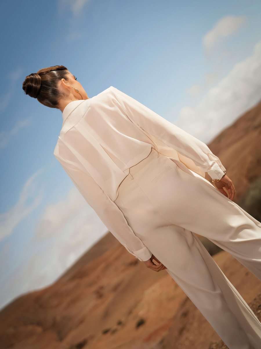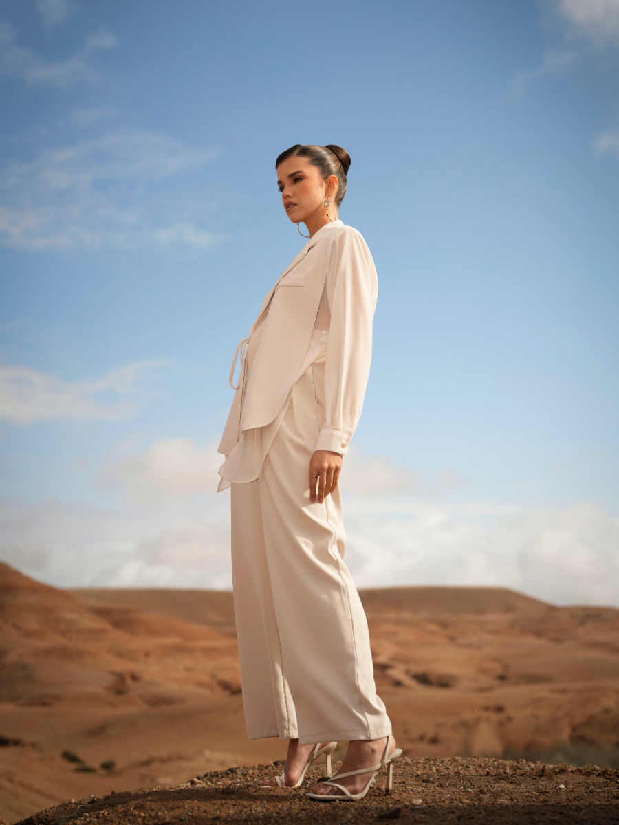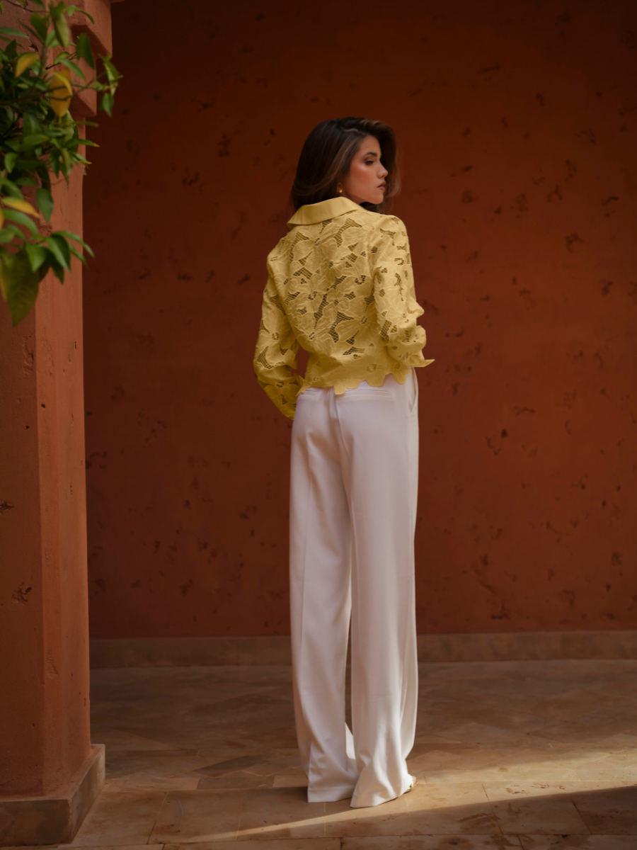 Calças de alfaiataria com cintura subida e perna larga de queda fluida, que alonga visualmente a silhueta. O corte reto e o tecido estruturado garantem conforto e sofisticação, mantendo um visual contemporâneo e intemporal. Ideais para usar em conjunto com o blazer ou separadamente.
