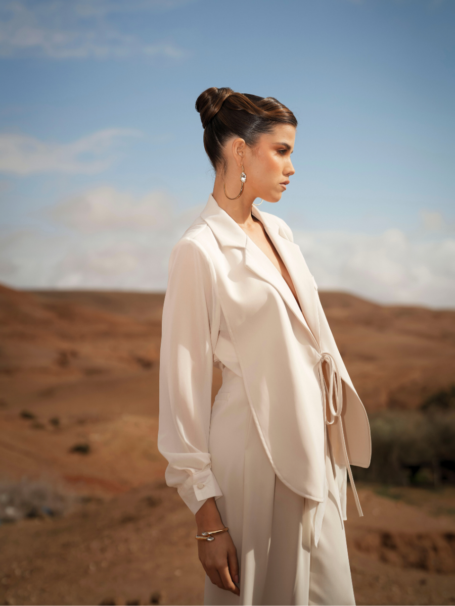 Blazer de alfaiataria com corte estruturado e silhueta cintada, pensado para valorizar a linha do corpo com elegância. Apresenta lapela clássica, fecho frontal discreto e ombros definidos, criando uma estética forte e sofisticada. O comprimento médio torna-o versátil, ideal para coordenados formais ou looks modernos de inspiração urbana.