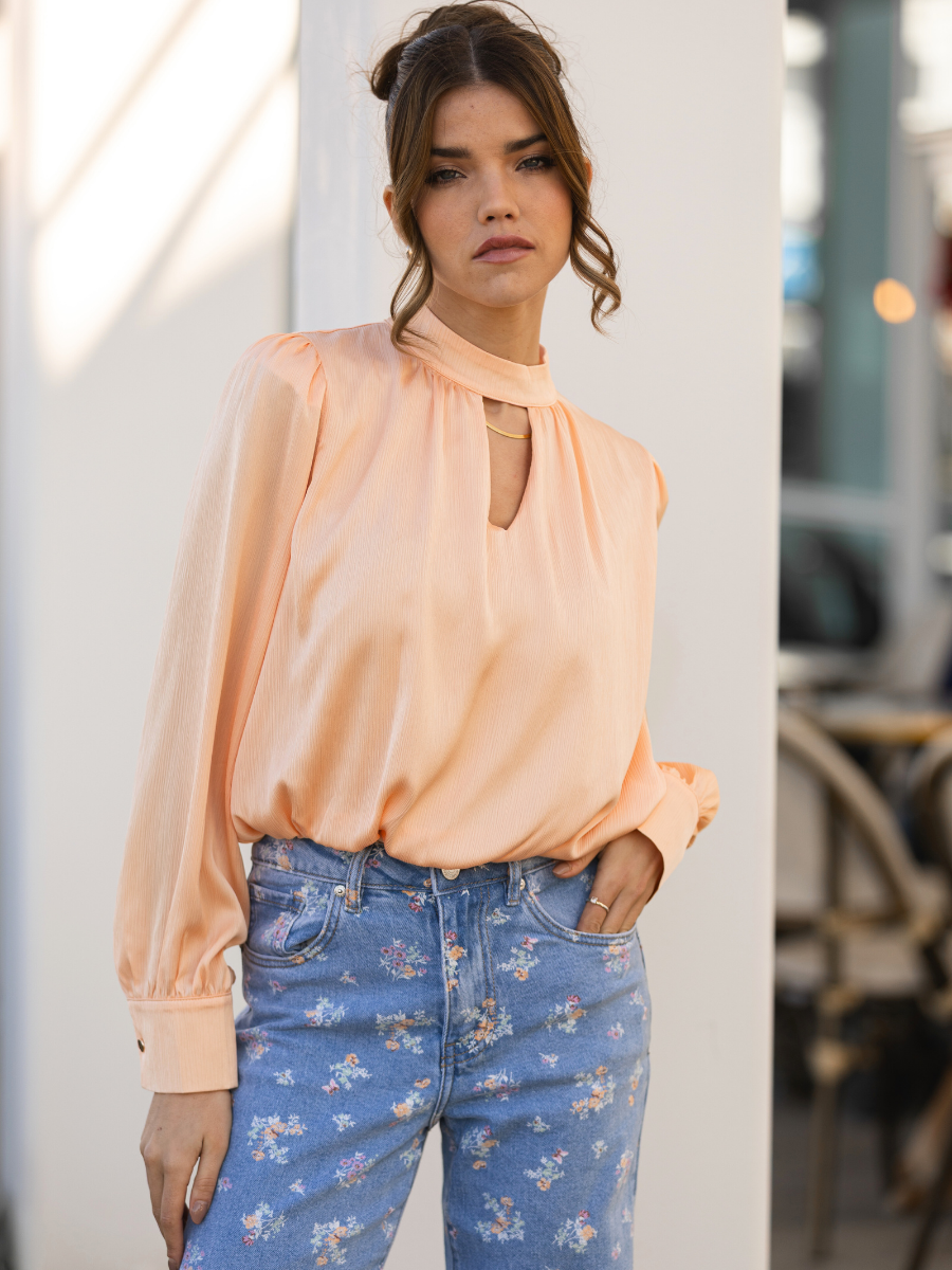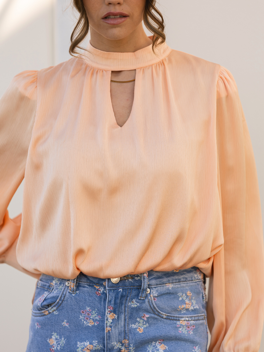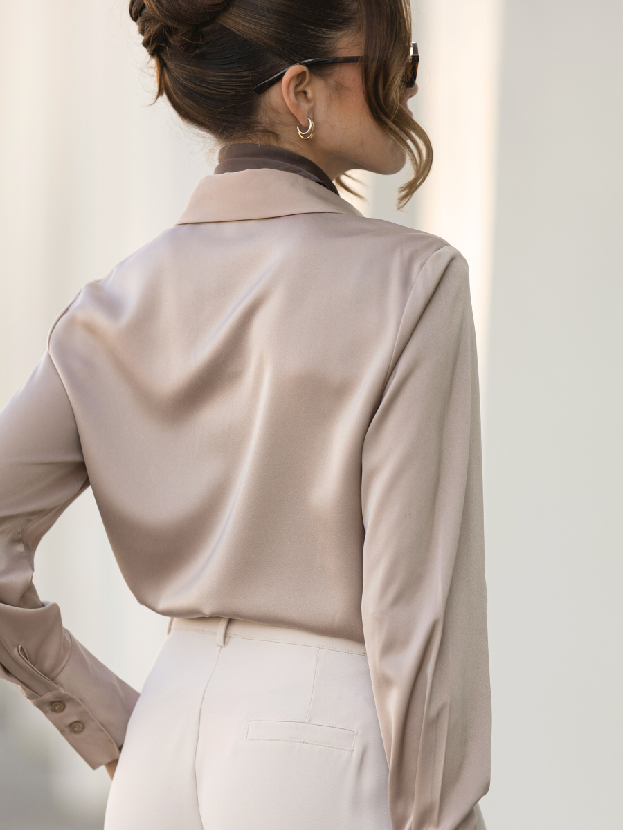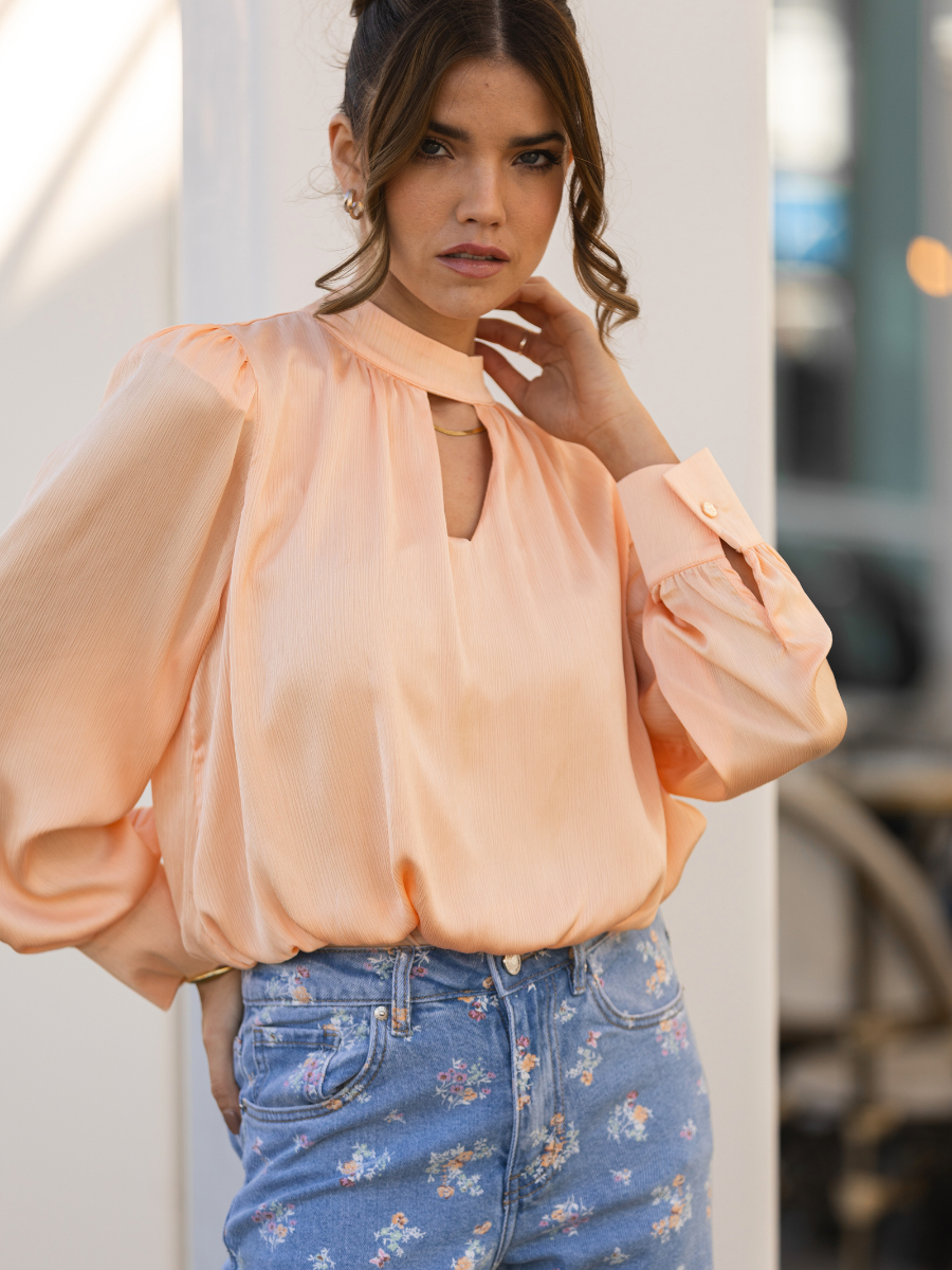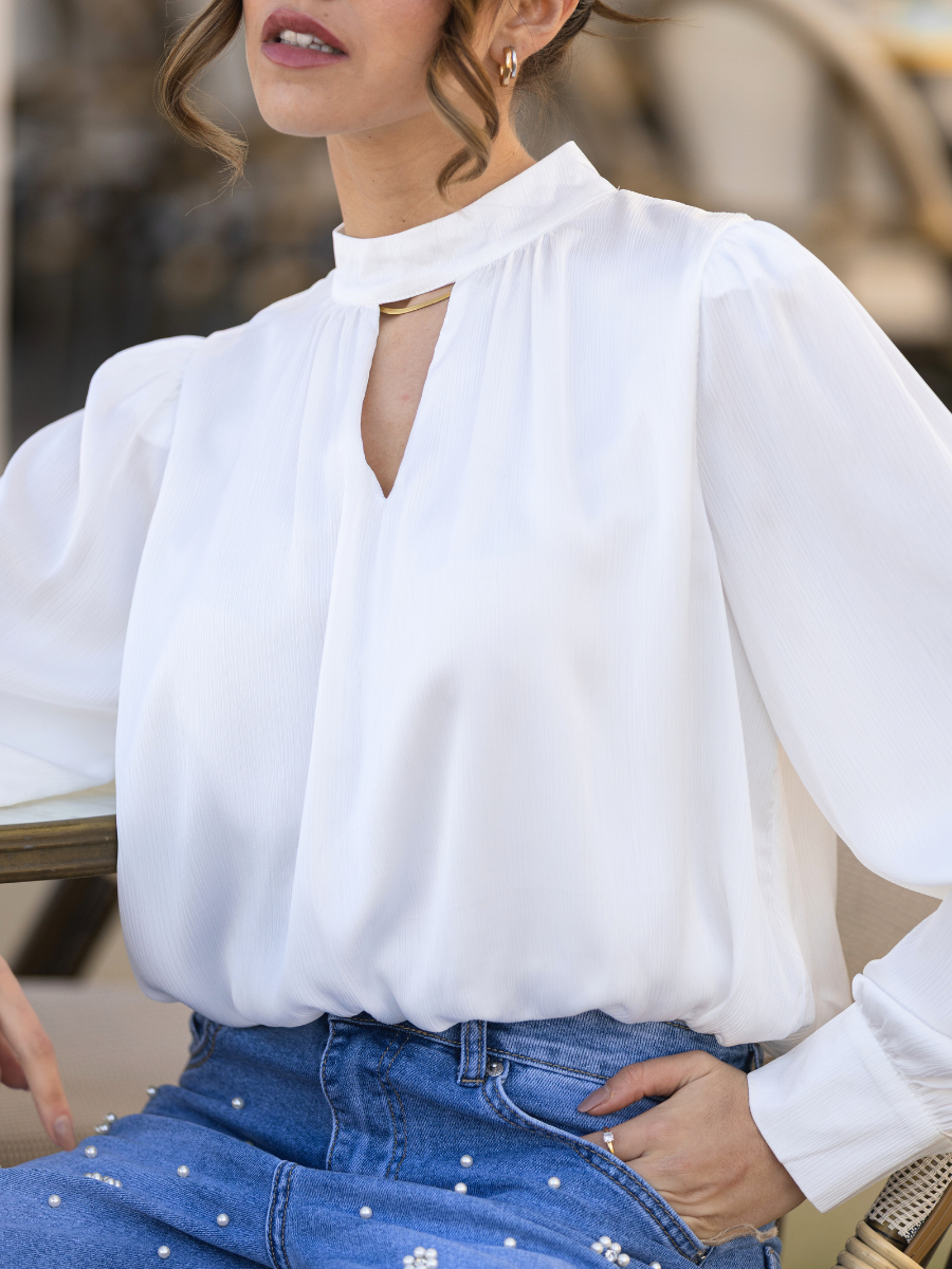 Body com textura leve e colarinho alto. Decote frontal em gota com detalhe metálico dourado discreto que adiciona sofisticação. Mangas compridas com leve volume nos ombros e punhos largos com botão. Elástico na base para ajuste perfeito ao corpo. Tecido fluido com leve brilho, ideal para coordenar com jeans ou peças de alfaiataria.