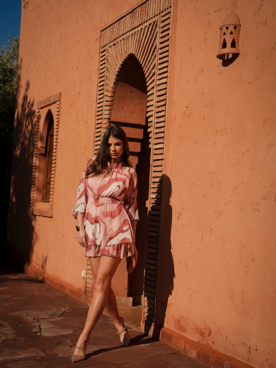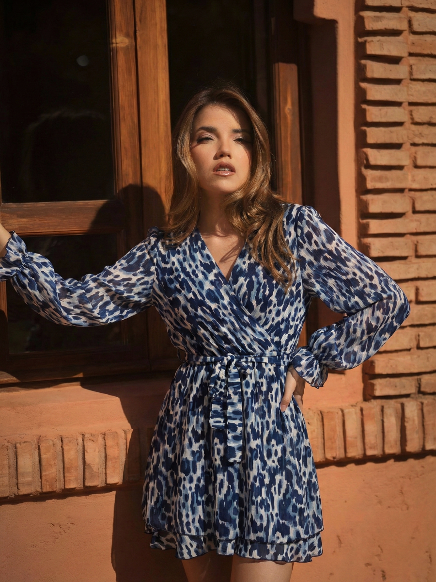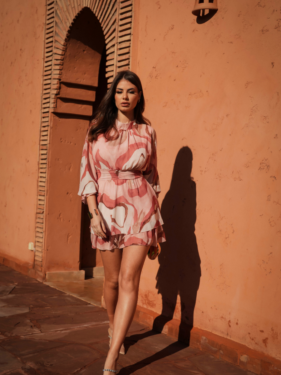 Vestido curto em tecido leve com padrão animal em tons de rosa e branco. Decote em V cruzado, com efeito envelope que valoriza o colo. Cintura marcada com cinto do mesmo tecido, que realça a silhueta de forma subtil. As mangas compridas terminam em punho franzido com folho delicado. A saia fluída apresenta camadas suaves e acabamento ondulado, conferindo movimento e leveza ao look. Ideal para dias descontraídos ou eventos casuais com um toque de feminilidade.