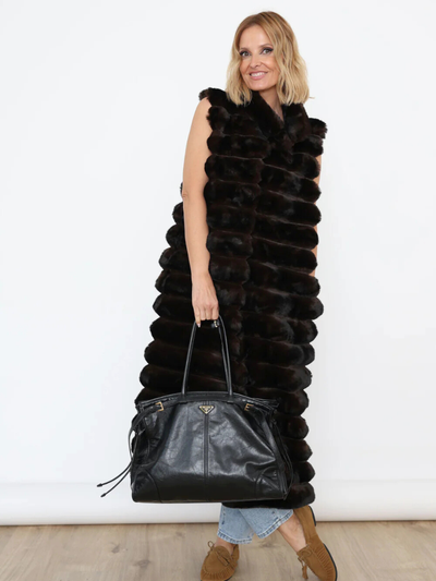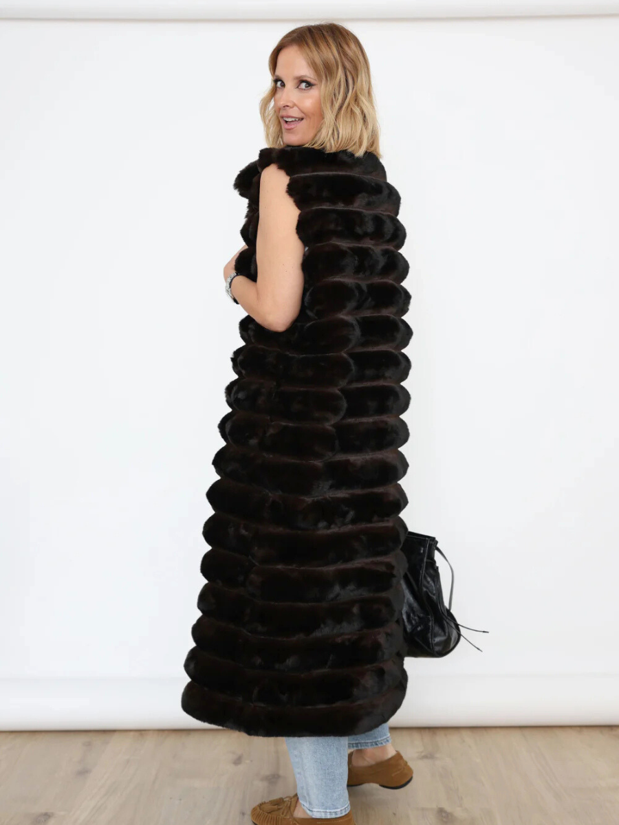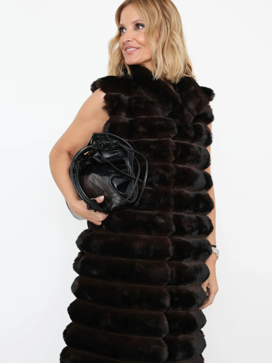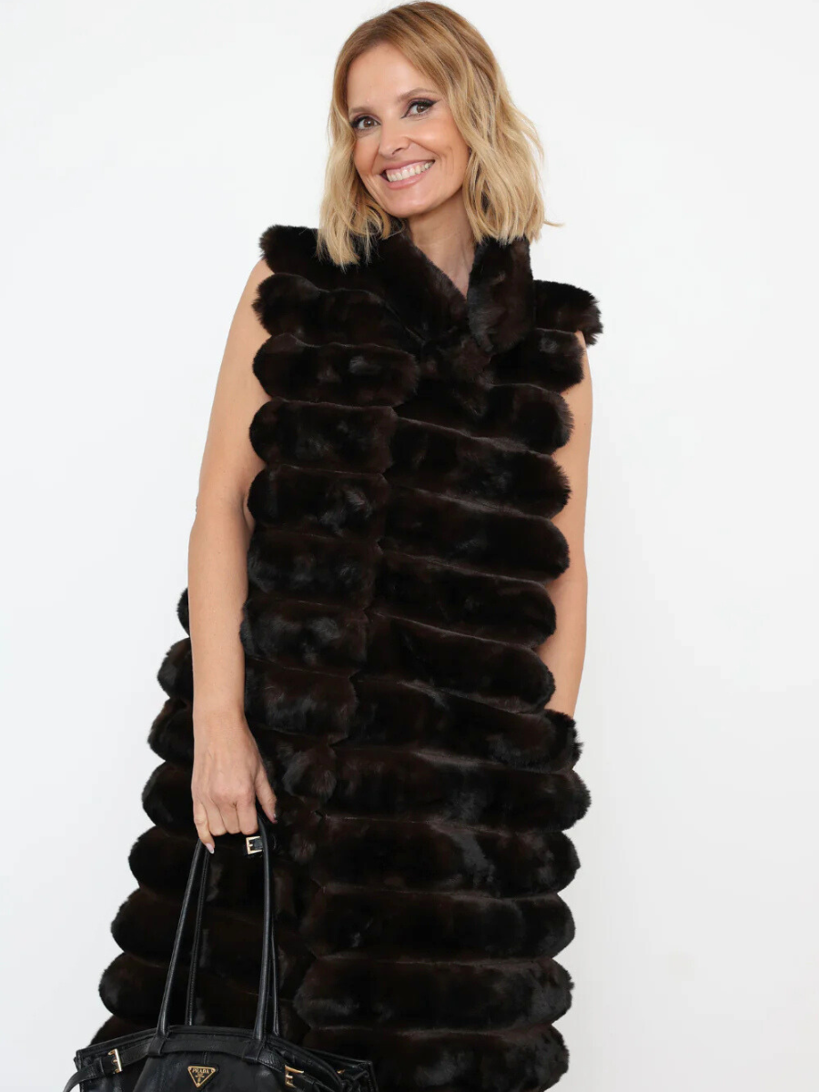 Colete longo e sem mangas em pelo, com efeito volumoso em bandas horizontais.