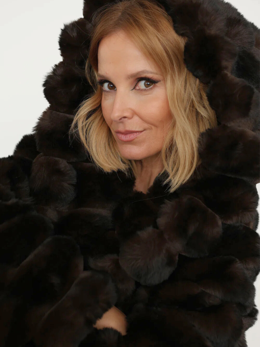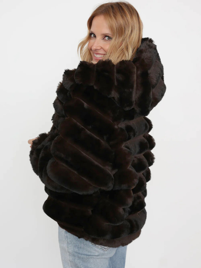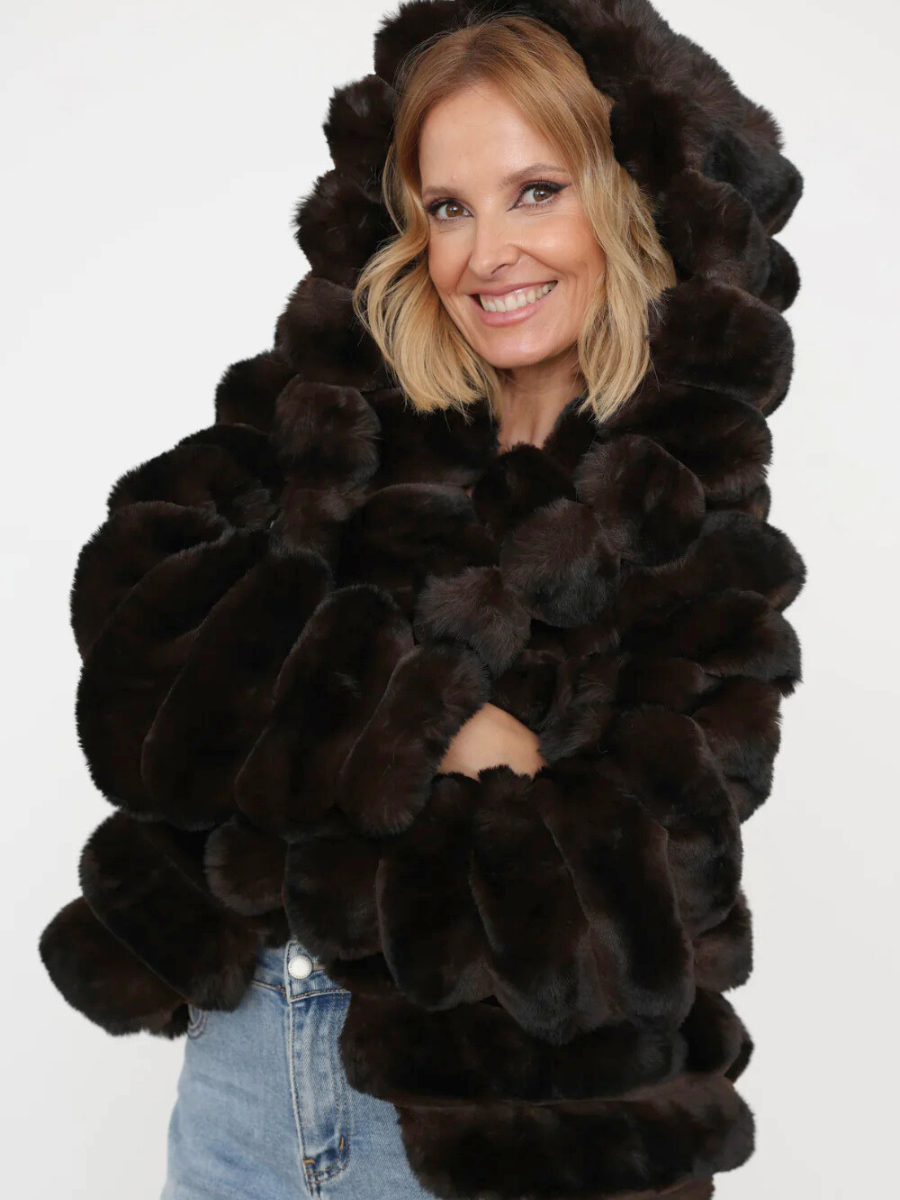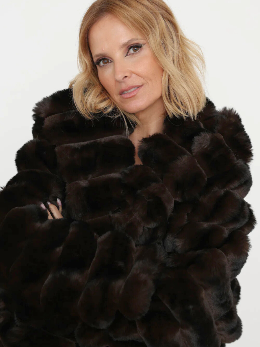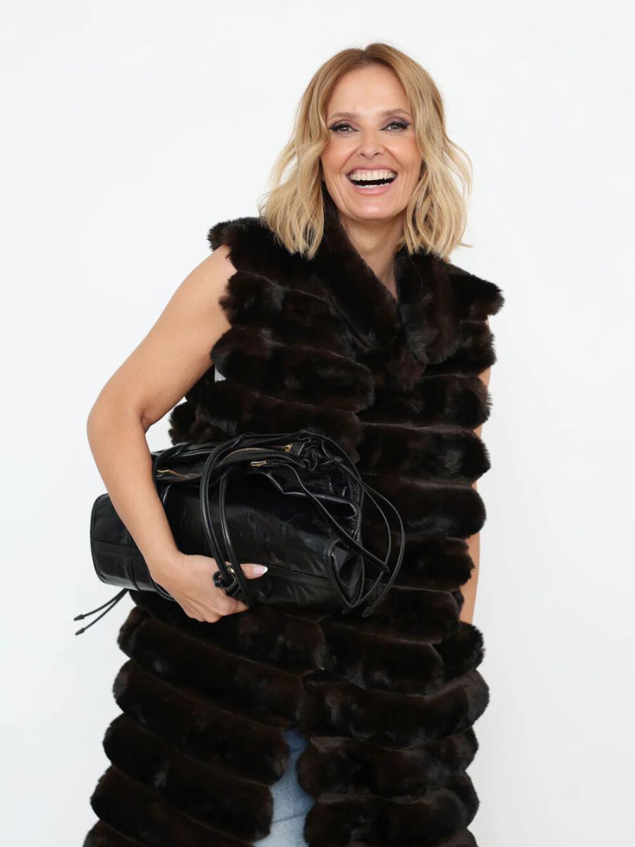 Colete longo e sem mangas em pelo, com efeito volumoso em bandas horizontais.