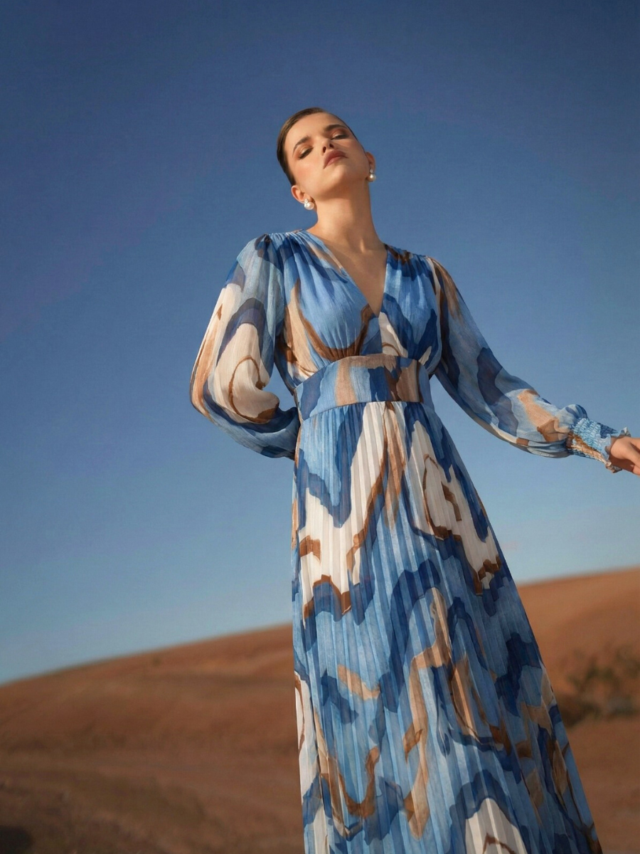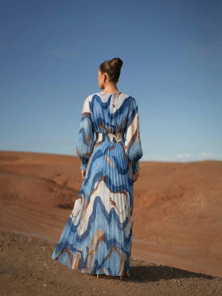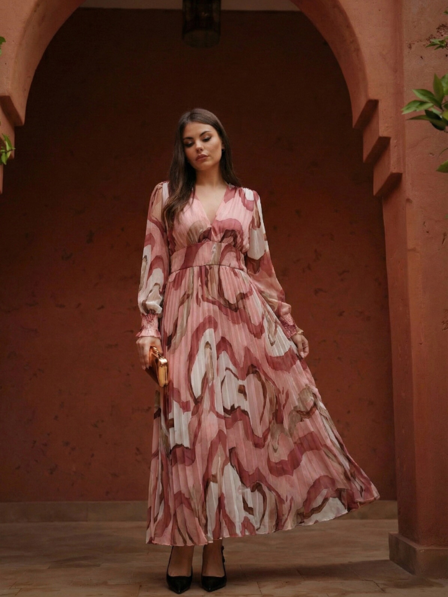 Elegância etérea num vestido que chama a atenção em qualquer ocasião. Com um padrão marmoreado artístico em tons suaves, este vestido comprido destaca-se pela fluidez do tecido plissado e pela sua estrutura delicada. O corte é cintado com elástico largo na cintura, criando uma silhueta esguia e feminina, enquanto o decote em V e as mangas compridas com punho elástico trazem um toque de sofisticação. Ideal para eventos especiais, jantares ou ocasiões em que quer marcar presença com estilo.