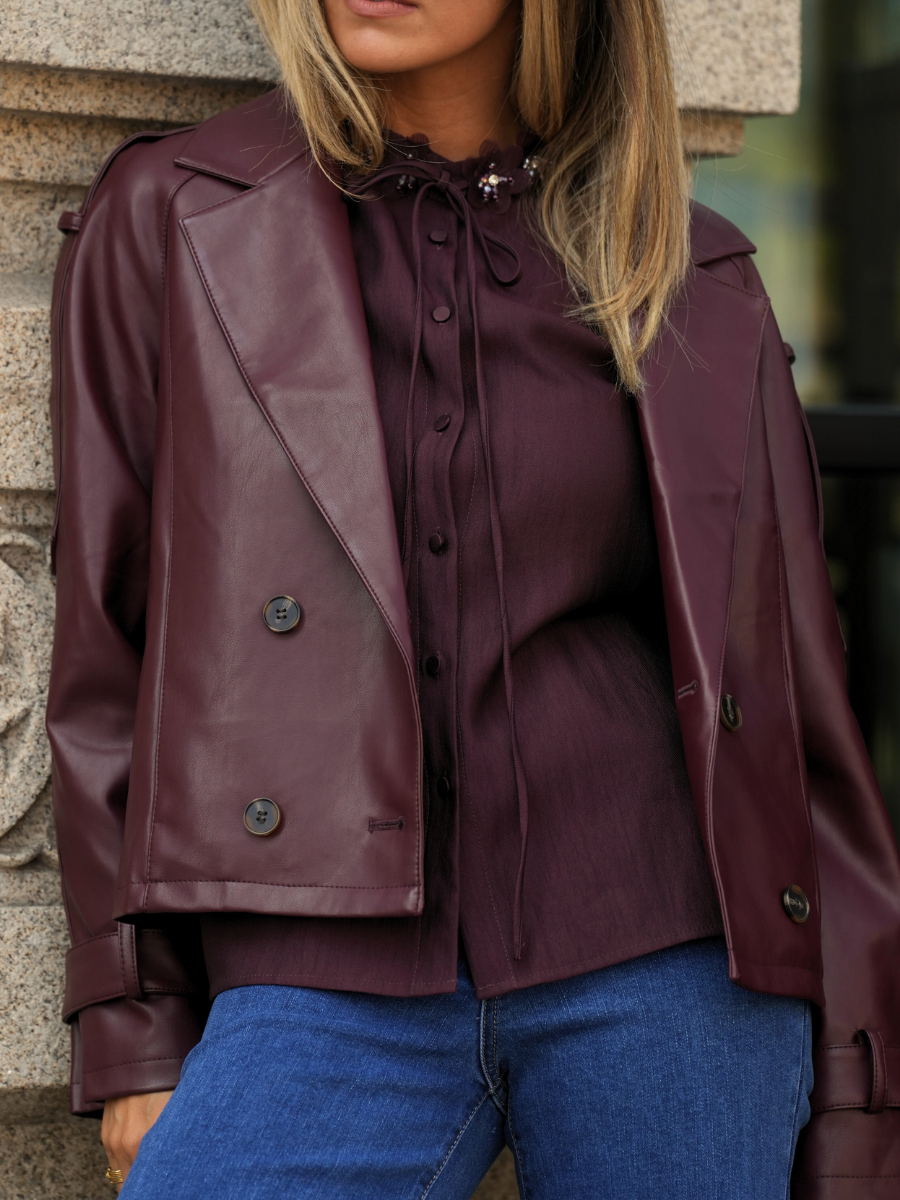 Blazer de corte reto em pele sintética com acabamento texturizado. Design minimalista, sem lapelas, com estrutura aberta à frente para um look elegante e versátil. Bolsos com pala e forro interior suave. Ideal para combinar com calças clássicas ou jeans, criando visuais urbanos com um toque sofisticado.