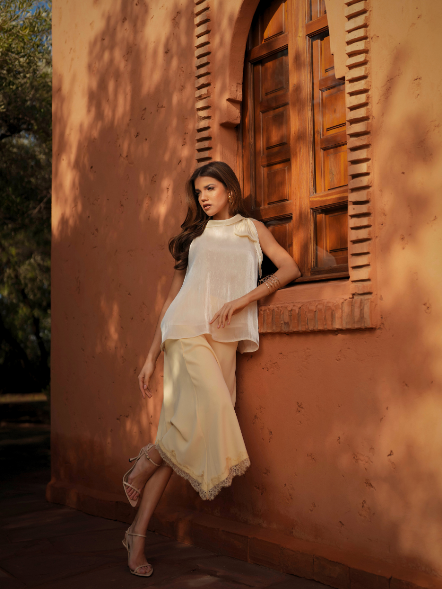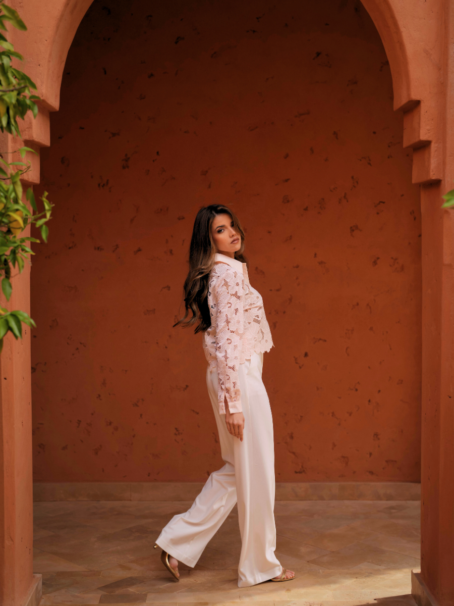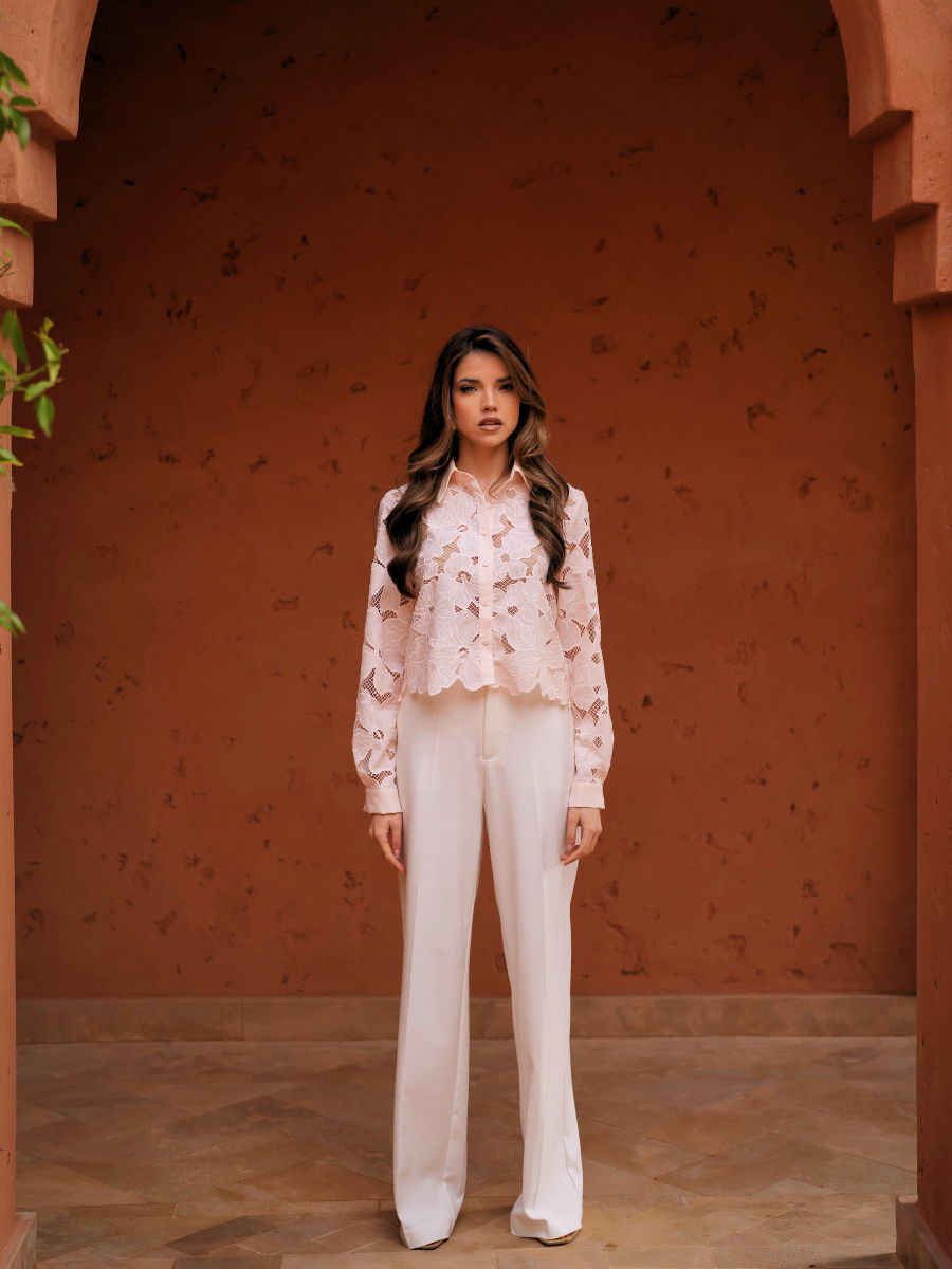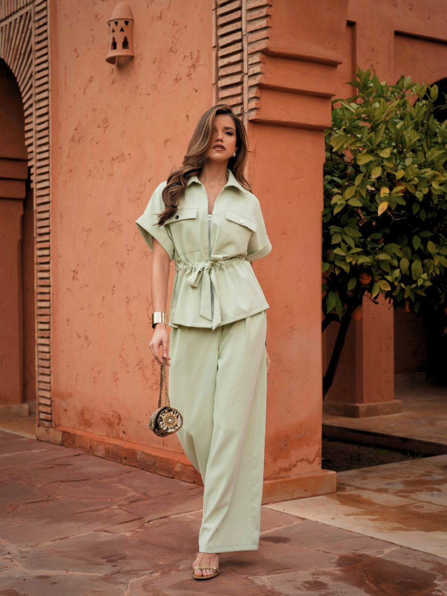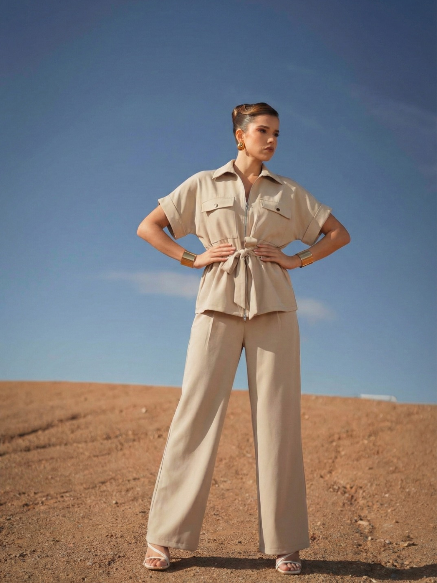Calças de cintura subida com perna larga e pregas frontais, pensadas para alongar a silhueta. O corte fluido confere movimento e elegância, enquanto o cinto no mesmo tom define a cintura com subtileza. Uma peça versátil, perfeita para looks sofisticados de dia ou de noite.